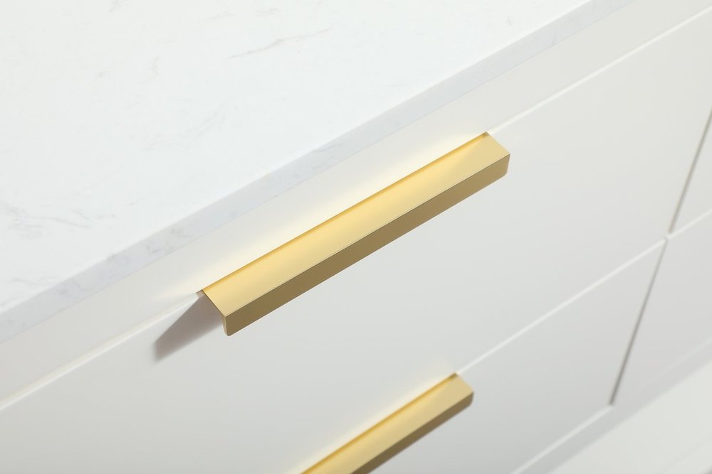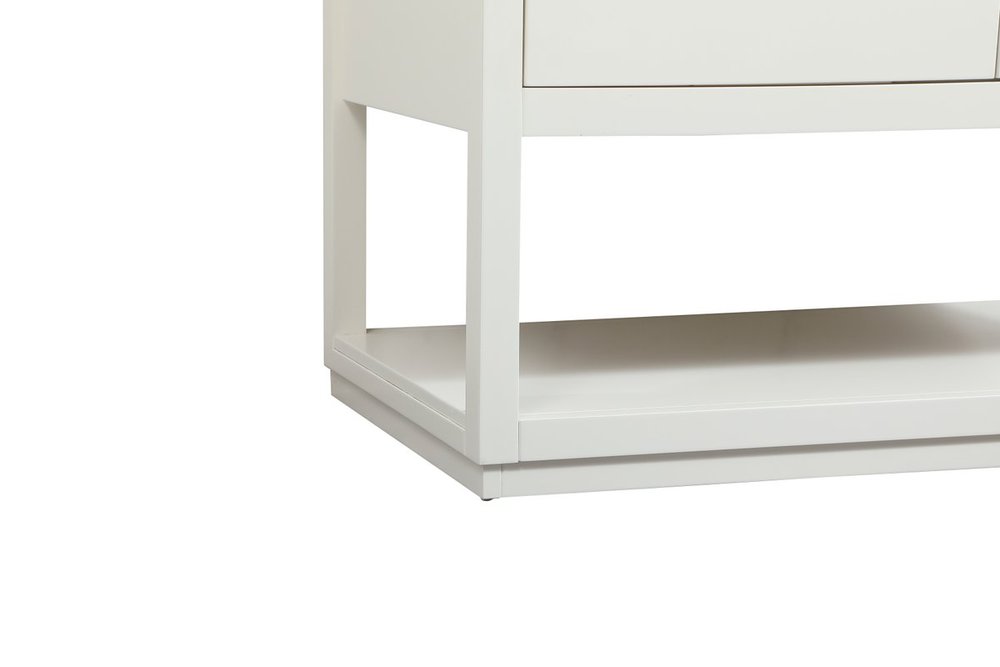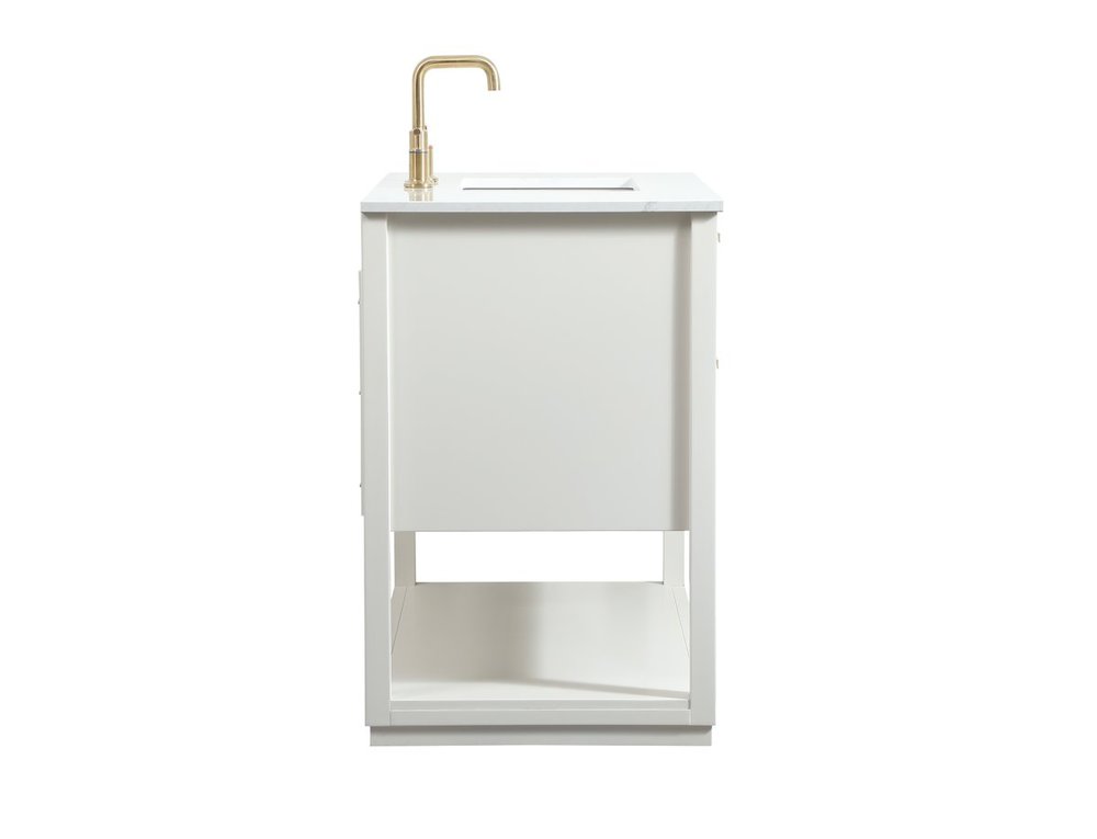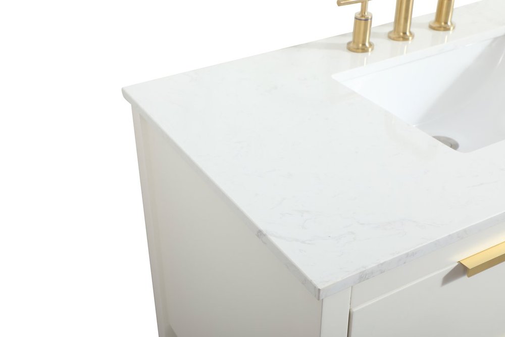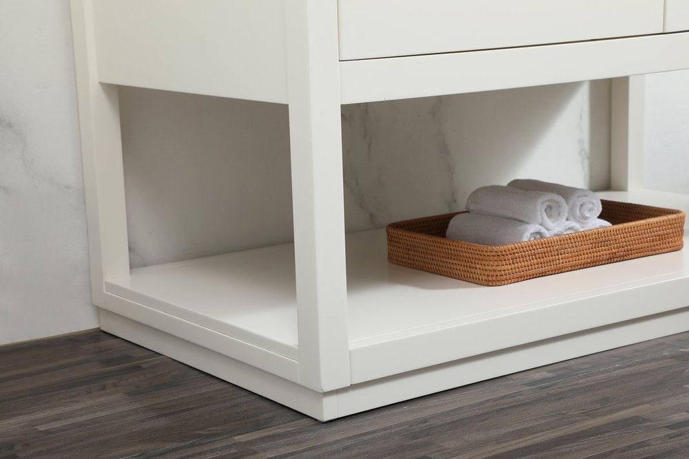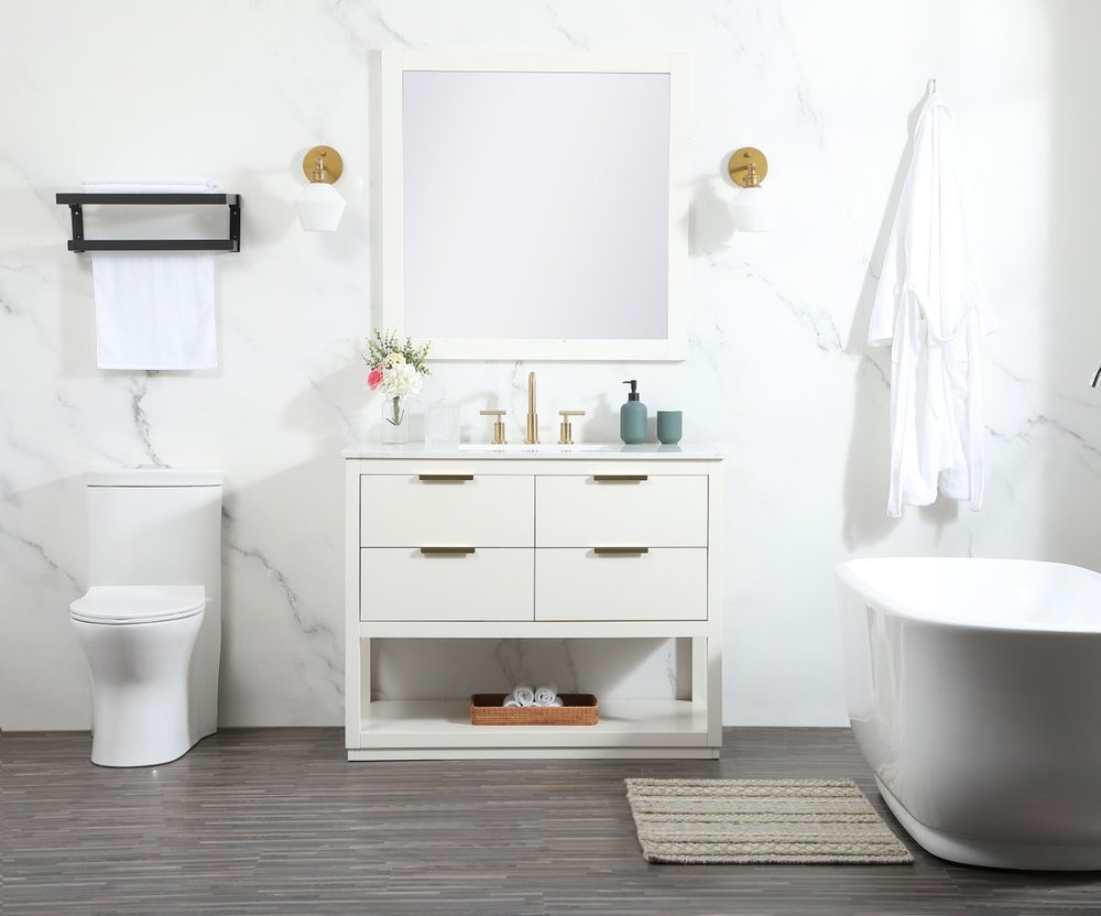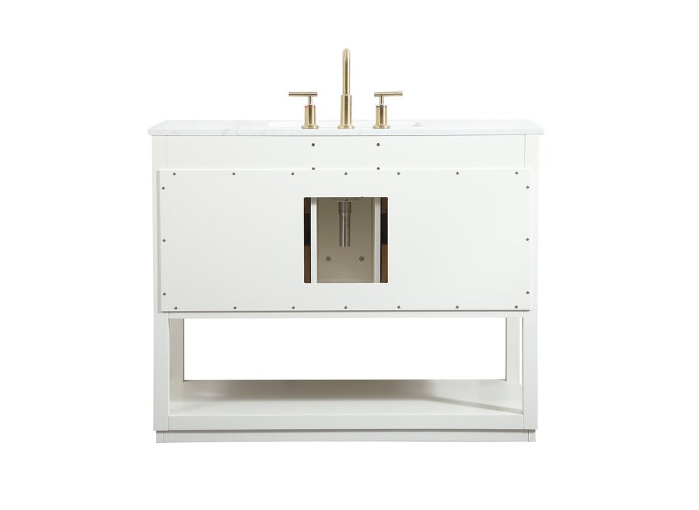 Live in modern comfort with this 42" white finish vanity. Dressed in a white and sleek gold metal hardware, its contemporary style will have your bathroom or powder room elevated in modern sophistication. The open shelf at the base and four drawers reveal ample storage space for your bathroom essentials and miscellany. Clean lines create its own visual interest, adding trendy looks to your already chic room.