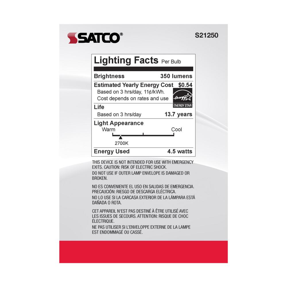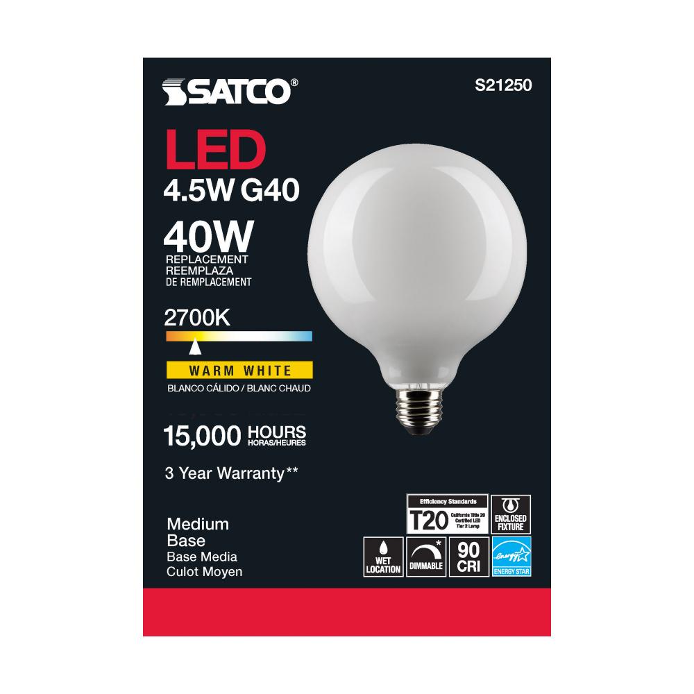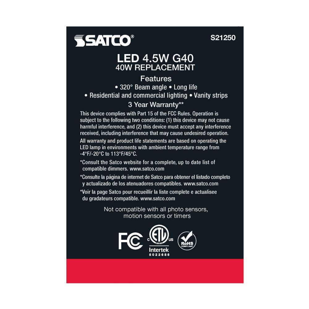 Satco's S21250 4.5-watt LED lamp is traditional, yet contemporary with its sleek finish and energy saving LED technology. Elegantly illuminate any room in the house with this dimmable, globe shaped bulb. Sophisticated and modern, this lamp delivers 15,