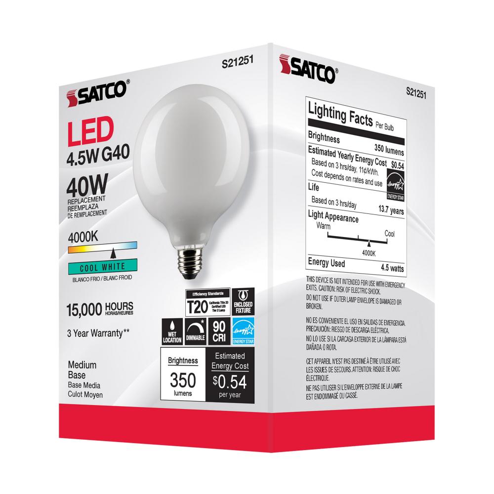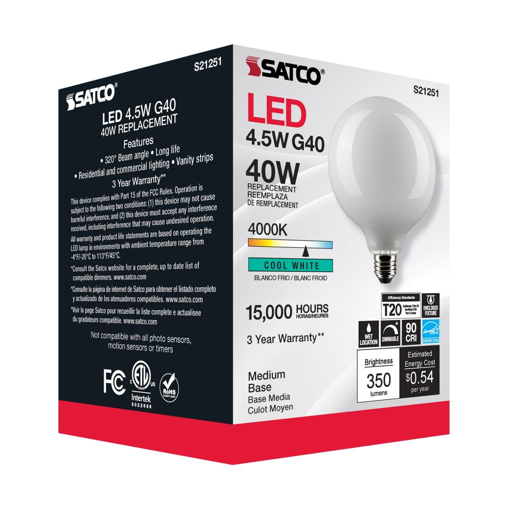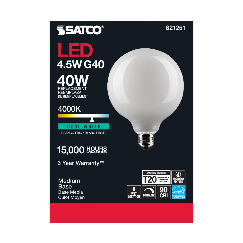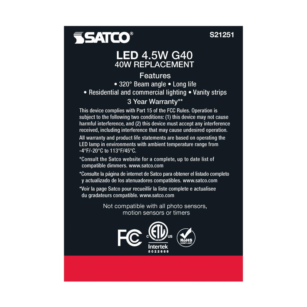 Satco's S21251 4.5-watt LED lamp is traditional, yet contemporary with its sleek finish and energy saving LED technology. Elegantly illuminate any room in the house with this dimmable, globe shaped bulb. Sophisticated and modern, this lamp delivers 15,