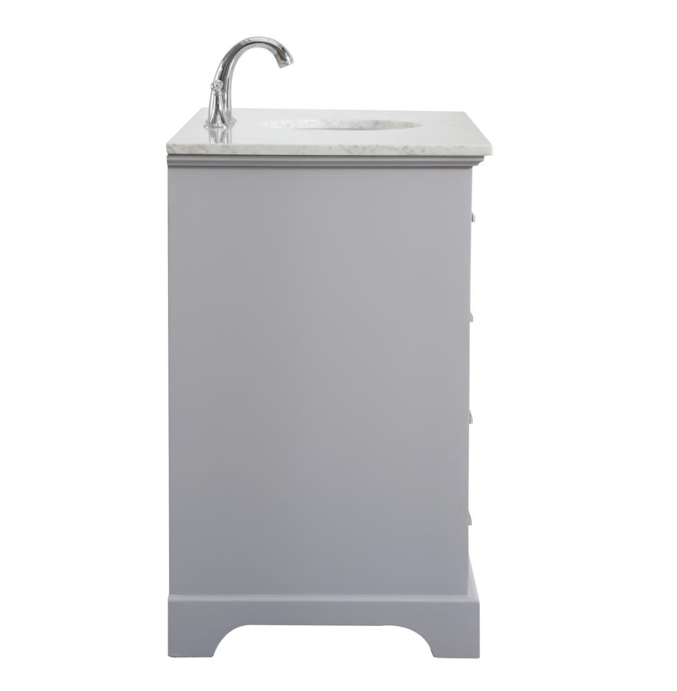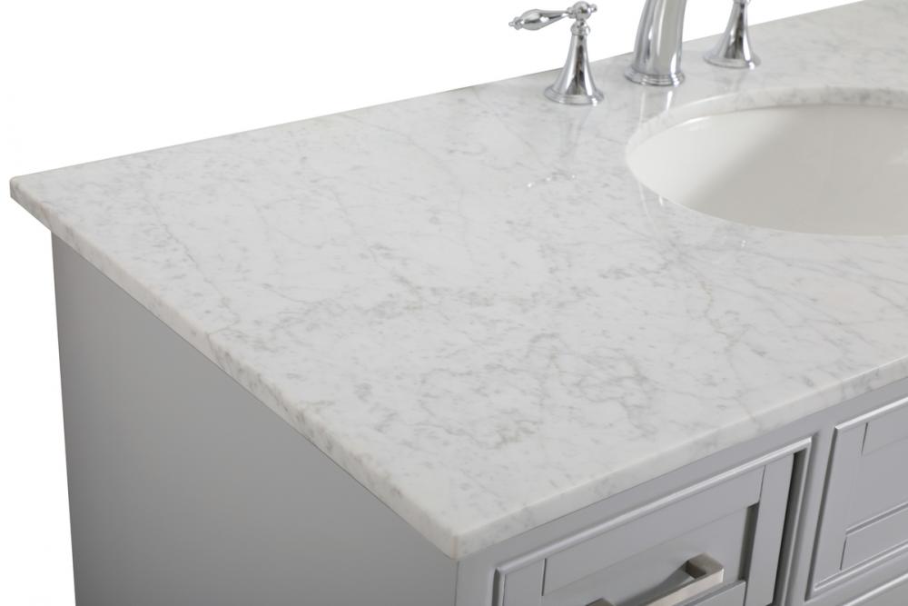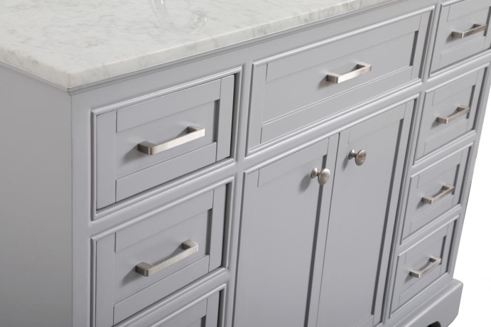 From its Italian Carrara white marble top to its contemporary-styled hand painted soft grey cabinet, this member of our “Americana” vanity collection is sure to enhance either your home or office bathroom. Beneath its lustrous, natural marble top and an oval, white porcelain under mount sink, is a cabinet with 4 handsome drawers on each side and 2 center doors with a Single shelf for all your bathroom essentials, highlighted with recessed panel doors, brushed steel bar handle and knobs, stands on strong solid pedestal feet. A wonderful balance of simplicity and practical function! Measurements: W48”xD21.5”xH35”