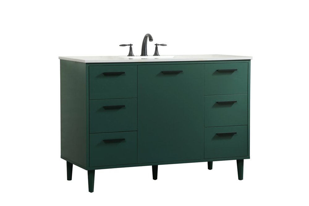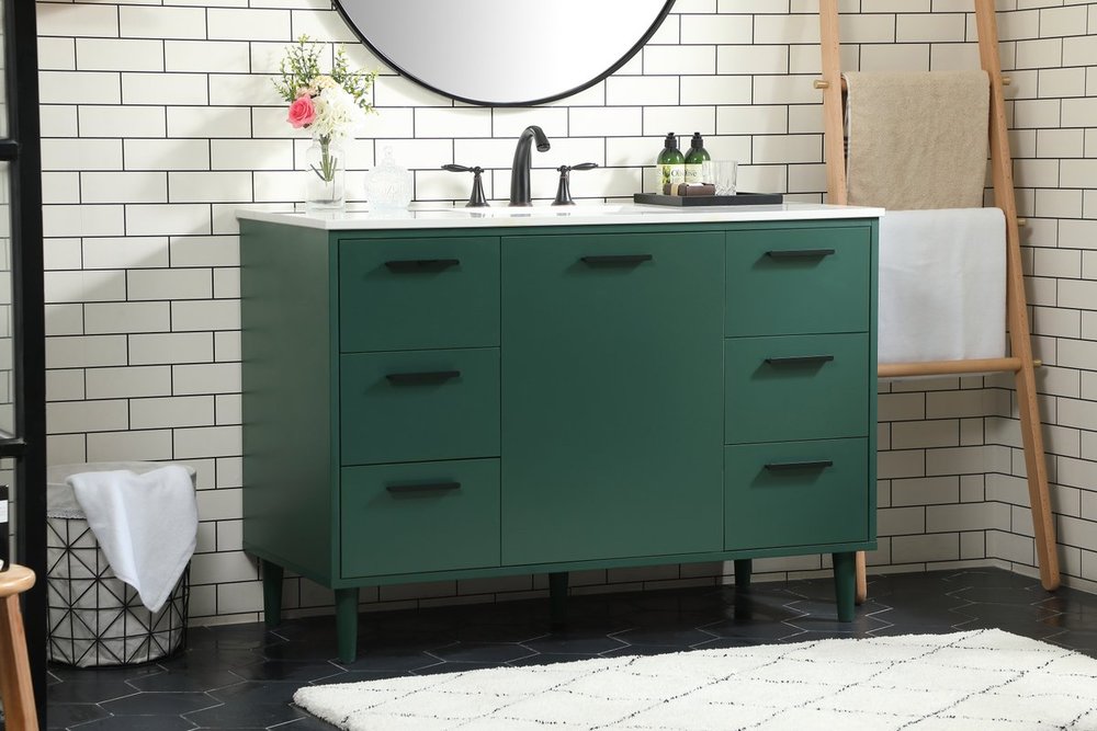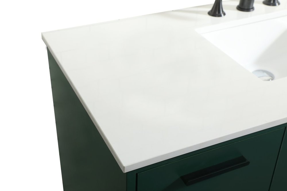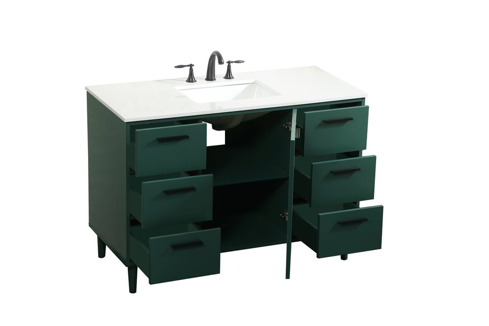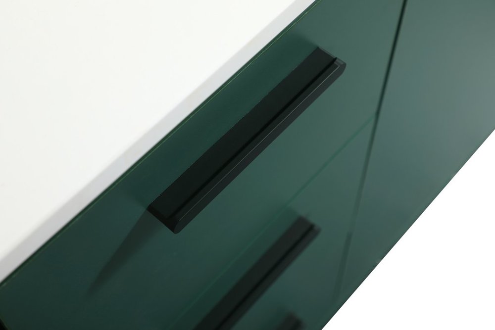 Modern sophistication is defined with the green finish and black barpulls of this vanity and slender tapered legs. Its length makes it the perfect addition to any sized home, and saves space with its storage area hidden behind the Single cabinet door and six drawers. Topped with a highly durable engineered stone countertop and a porcelain undermount sink, this modern design will become your focal point of your bathroom. Equipped with soft-closing drawer and doors adds a quiet functional touch.