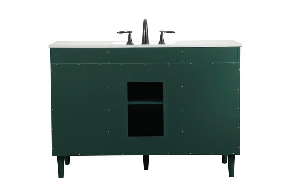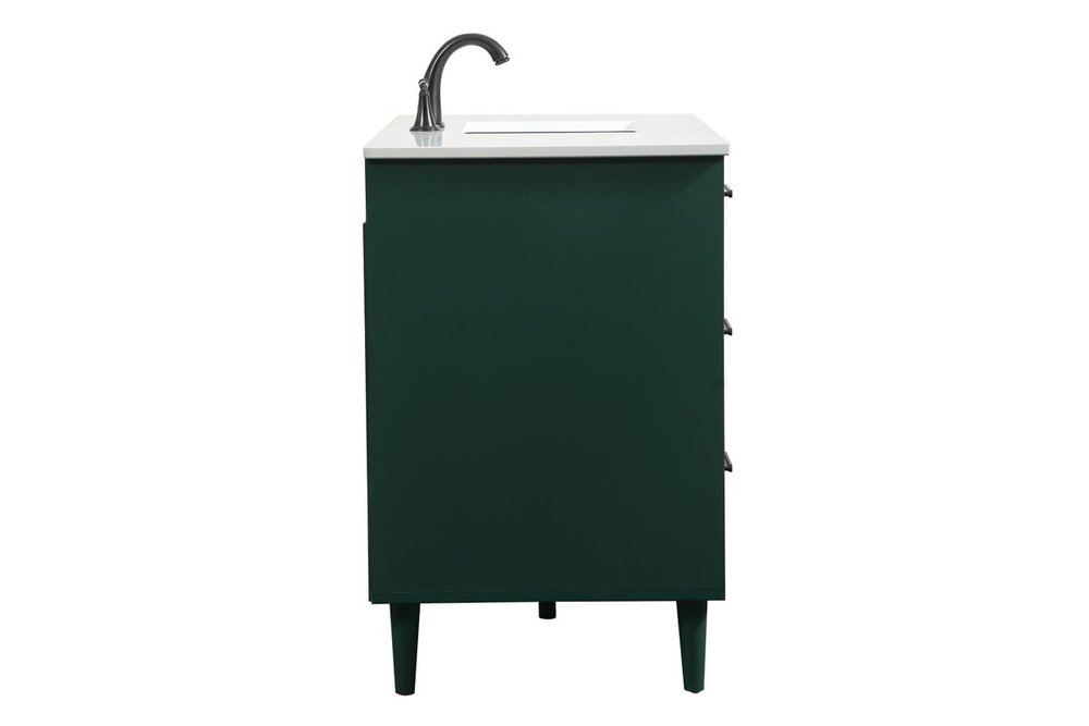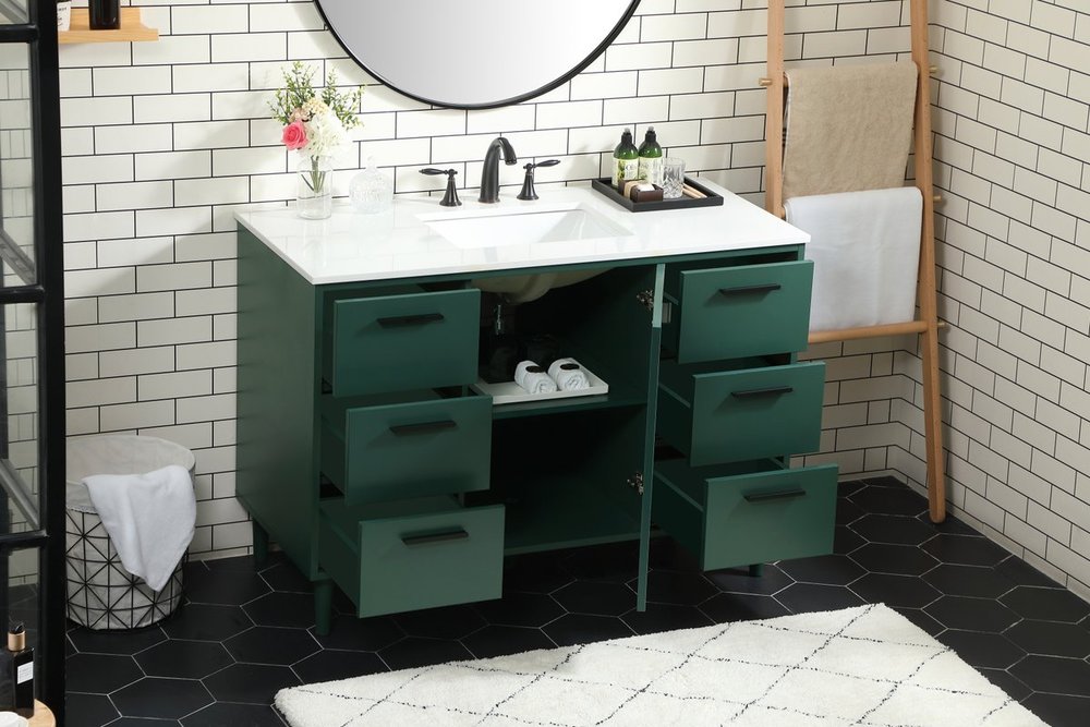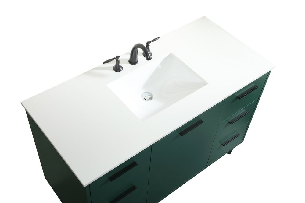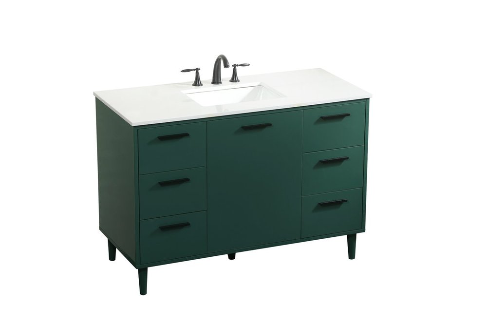 Modern sophistication is defined with the green finish and black barpulls of this vanity and slender tapered legs. Its length makes it the perfect addition to any sized home, and saves space with its storage area hidden behind the Single cabinet door and six drawers. Topped with a highly durable engineered stone countertop and a porcelain undermount sink, this modern design will become your focal point of your bathroom. Equipped with soft-closing drawer and doors adds a quiet functional touch.