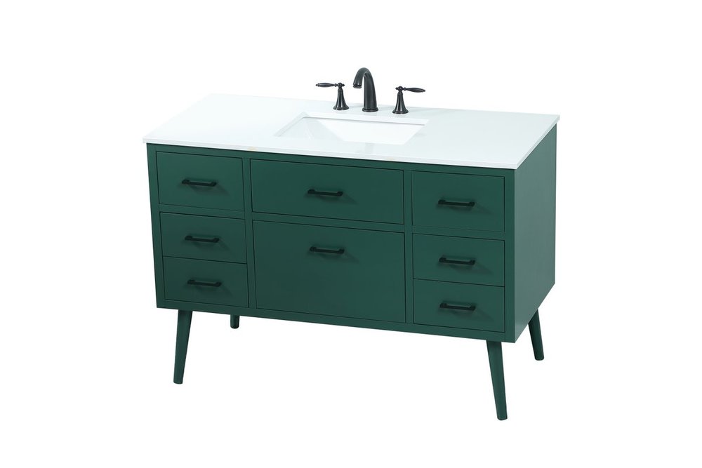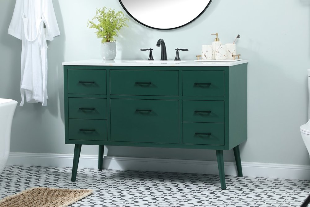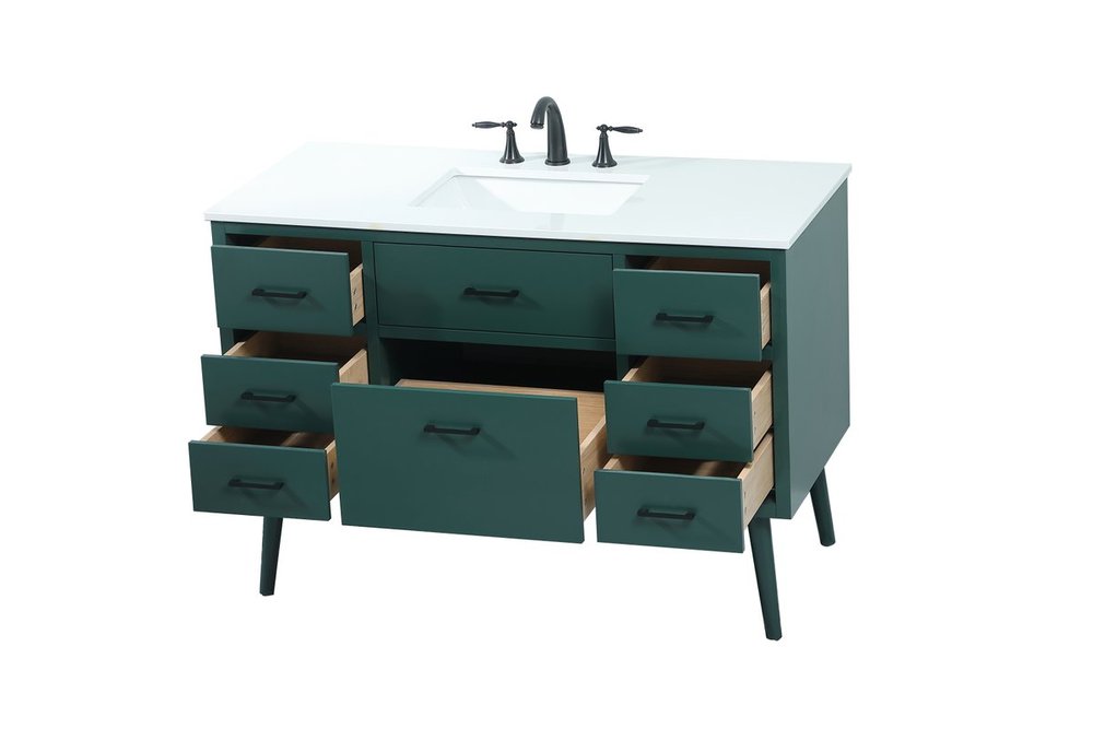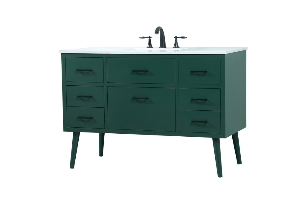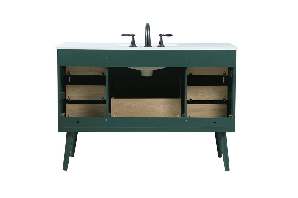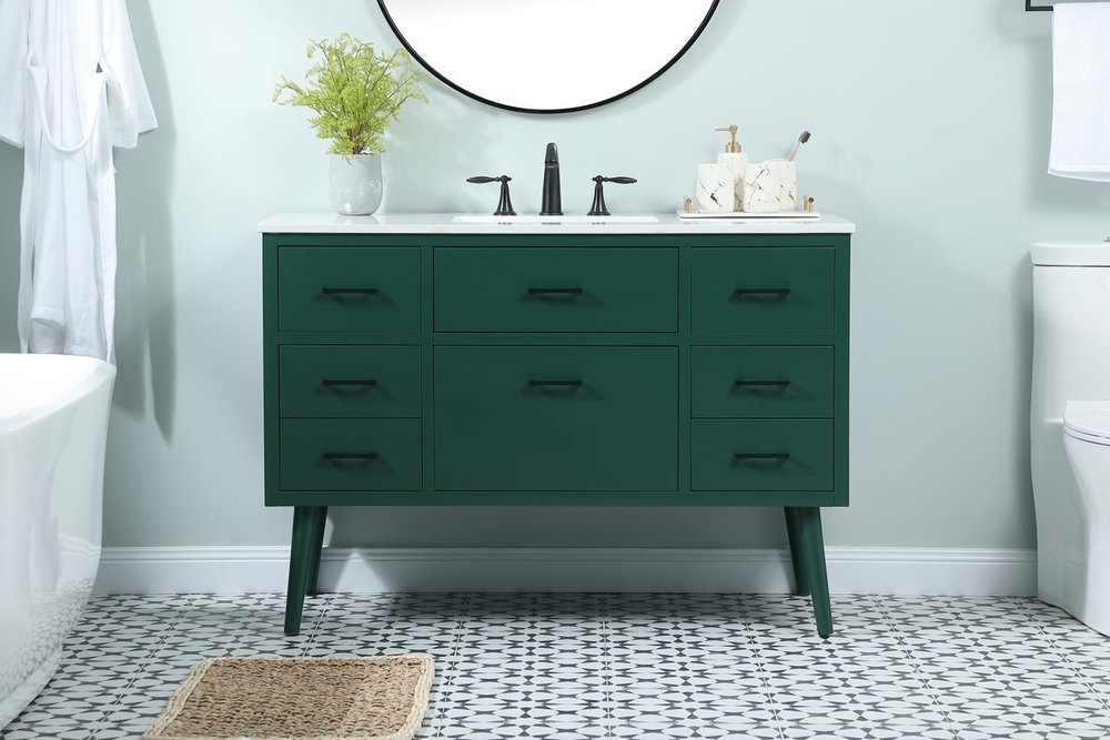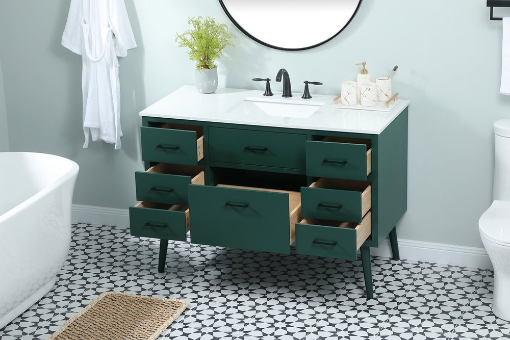 Delve into a world of minimalistic fashion and contemporary styling with this midcentury modern 48" vanity. The clean lines anchors the design, while the oblique tapered cylinder legs add subtle interest. However, the artful juxtaposition between the green and white top creates a blend of bright modernity and classical traditions. A black handle adorns the top fake drawer hiding the base of the undermount porcelain sink while another one allows you to pull the bottom drawer out, letting you store your bathroom necessities and toiletries. The compact size makes it the perfect vanity for any bathroom or powder room, regardless of size.