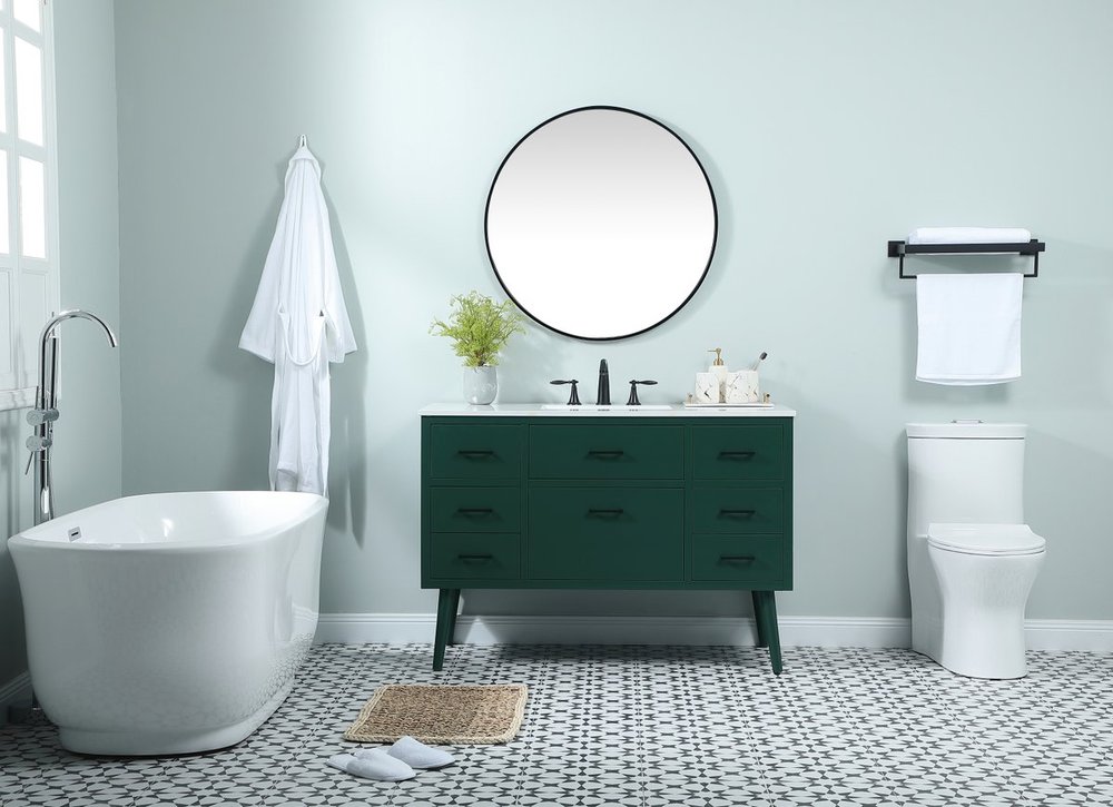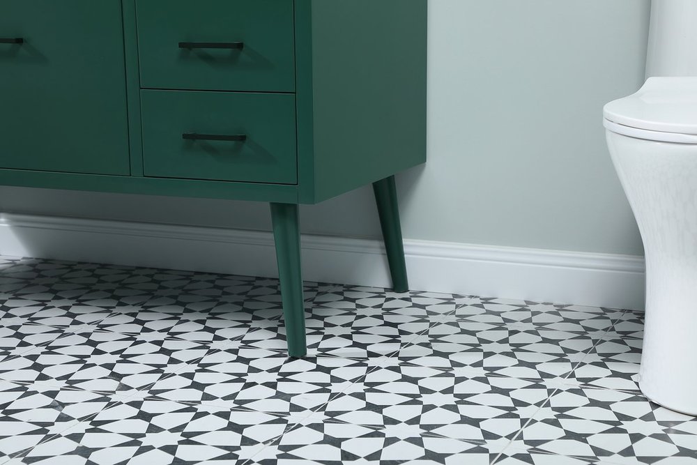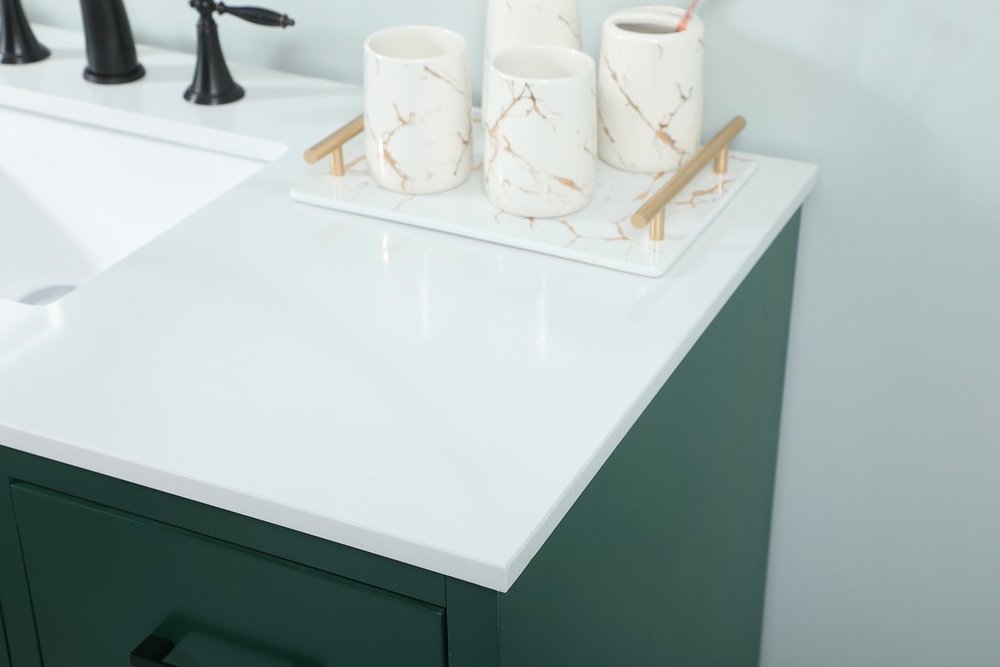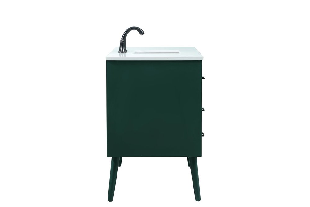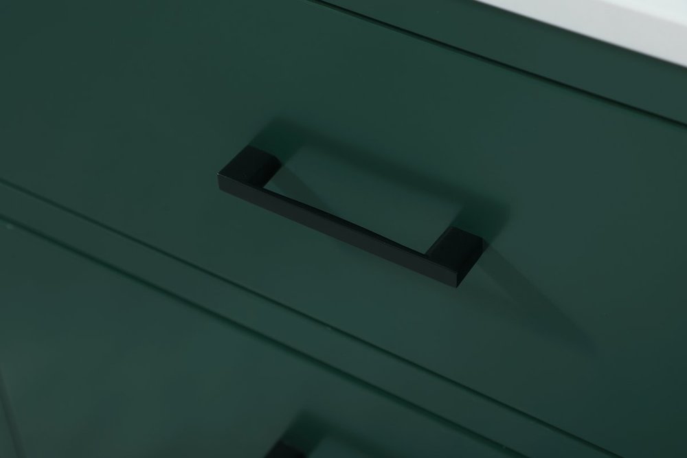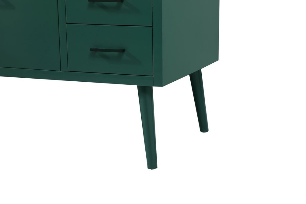 Delve into a world of minimalistic fashion and contemporary styling with this midcentury modern 48" vanity. The clean lines anchors the design, while the oblique tapered cylinder legs add subtle interest. However, the artful juxtaposition between the green and white top creates a blend of bright modernity and classical traditions. A black handle adorns the top fake drawer hiding the base of the undermount porcelain sink while another one allows you to pull the bottom drawer out, letting you store your bathroom necessities and toiletries. The compact size makes it the perfect vanity for any bathroom or powder room, regardless of size.