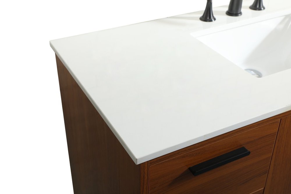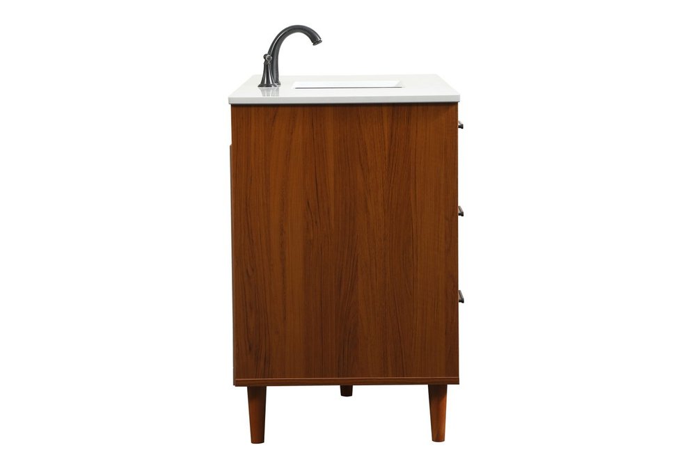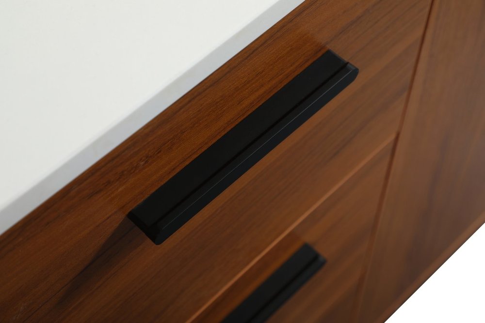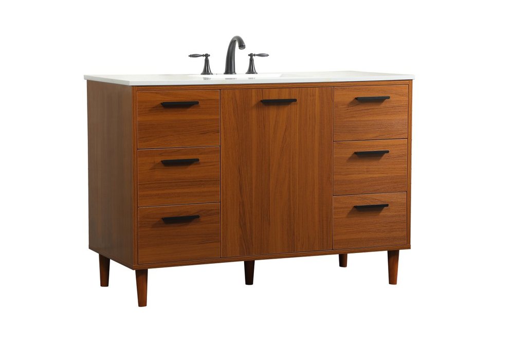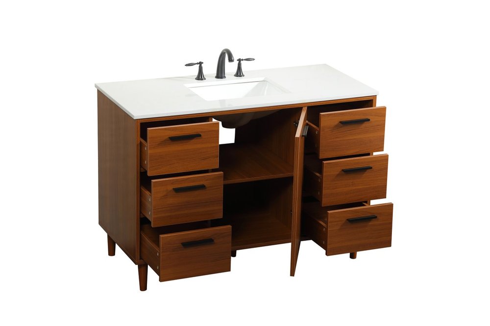 Modern sophistication is defined with the teak finish and black barpulls of this vanity and slender tapered legs. Its length makes it the perfect addition to any sized home, and saves space with its storage area hidden behind the Single cabinet door and six drawers. Topped with a highly durable engineered stone countertop and a porcelain undermount sink, this modern design will become your focal point of your bathroom. Equipped with soft-closing drawer and doors adds a quiet functional touch.