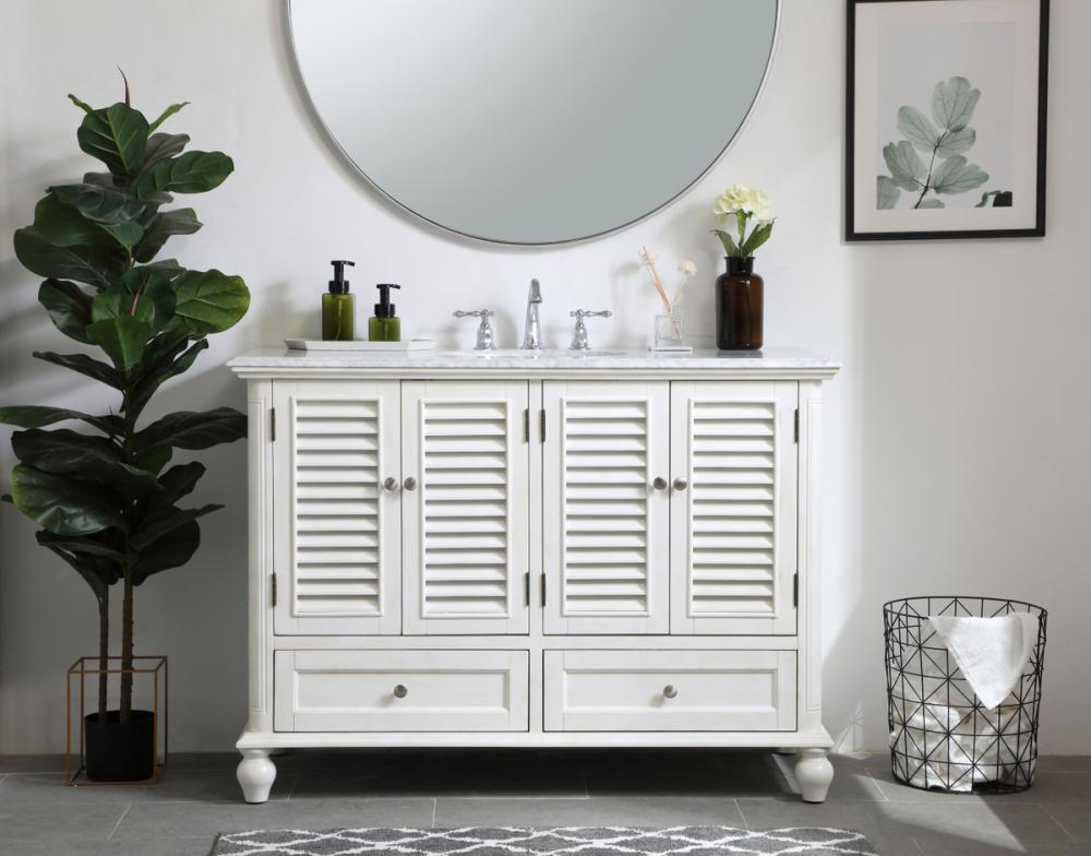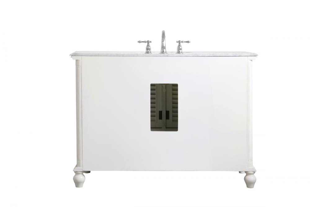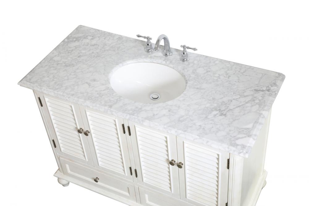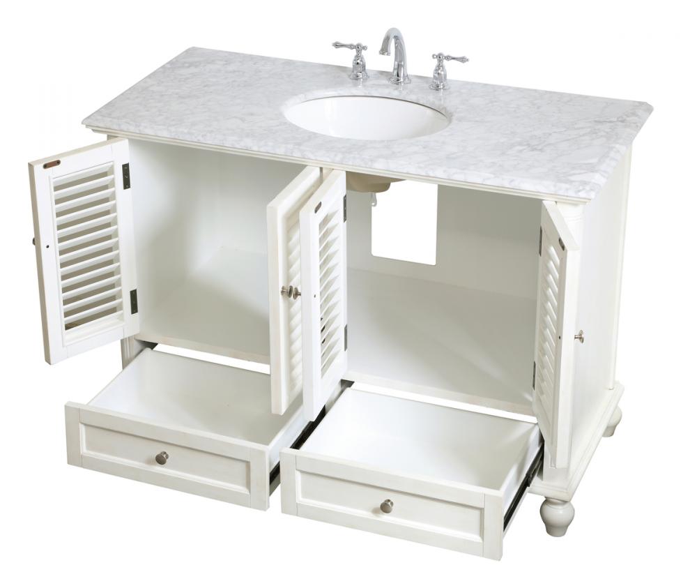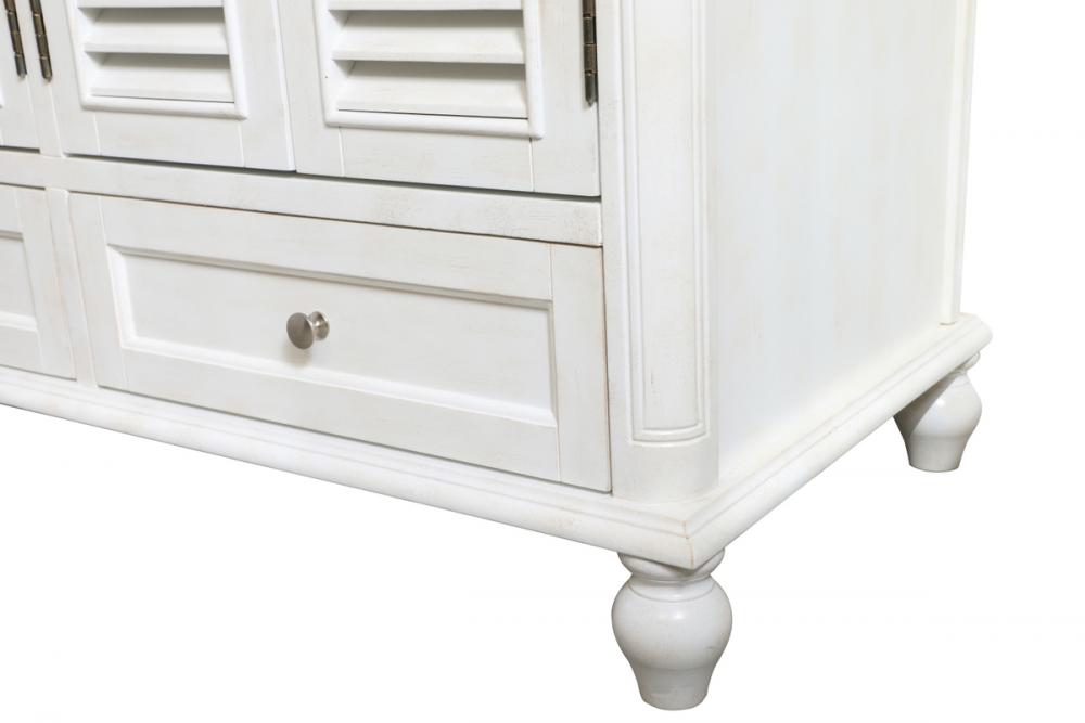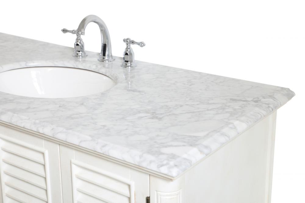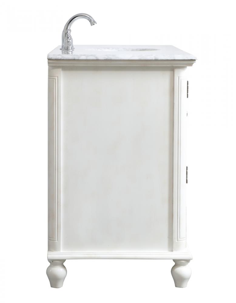 Never compromise beauty--the Rhodes collection stunning vanity in an antique white finish will add lovely sophistication and complement any bathroom or powder room, while utilizing its charm and function to provide you with ample storage spaces. Brushed nickel knobs gently adorn the four shuttered cabinet doors and two long drawers at the base, allowing for you to store away your bathroom essentials. The Carrara white marble countertop, porcelain undermount sink, dignified subtle engravings on the side edges, and rounded legs all come together to create contemporary beauty. Work with your space, and design a beautiful room, no matter the size.