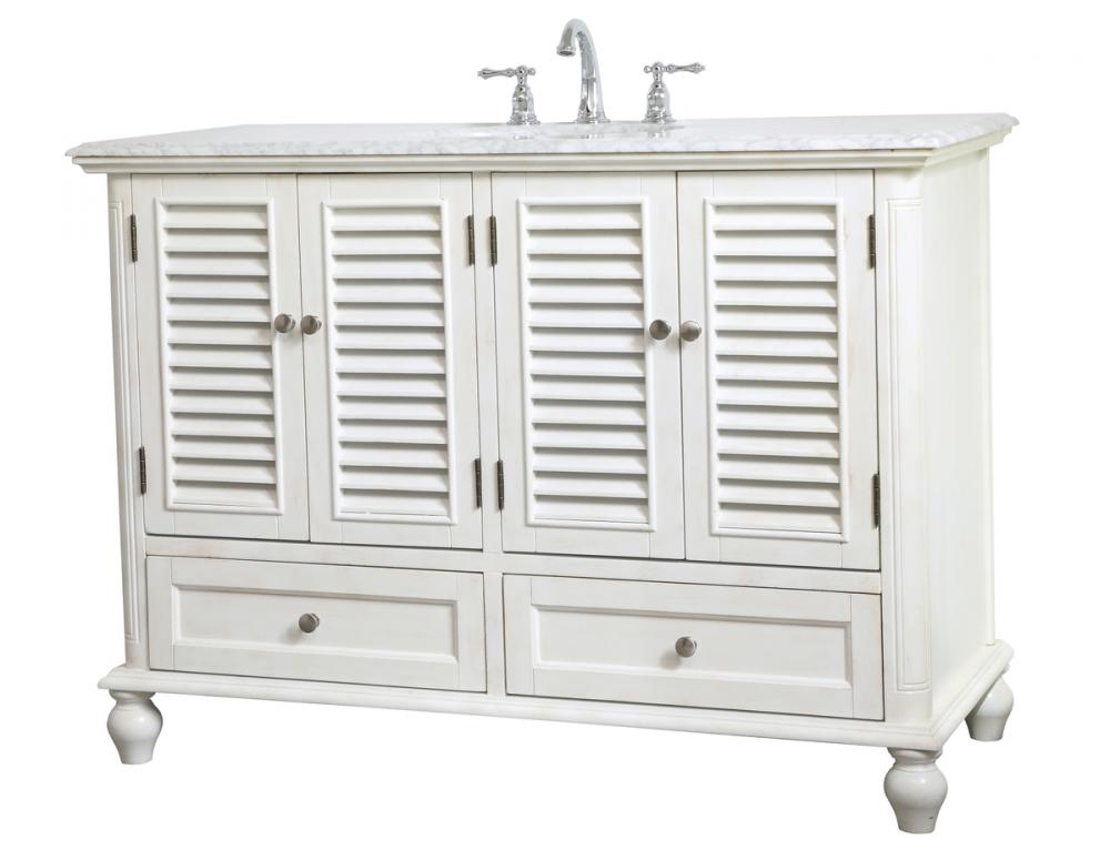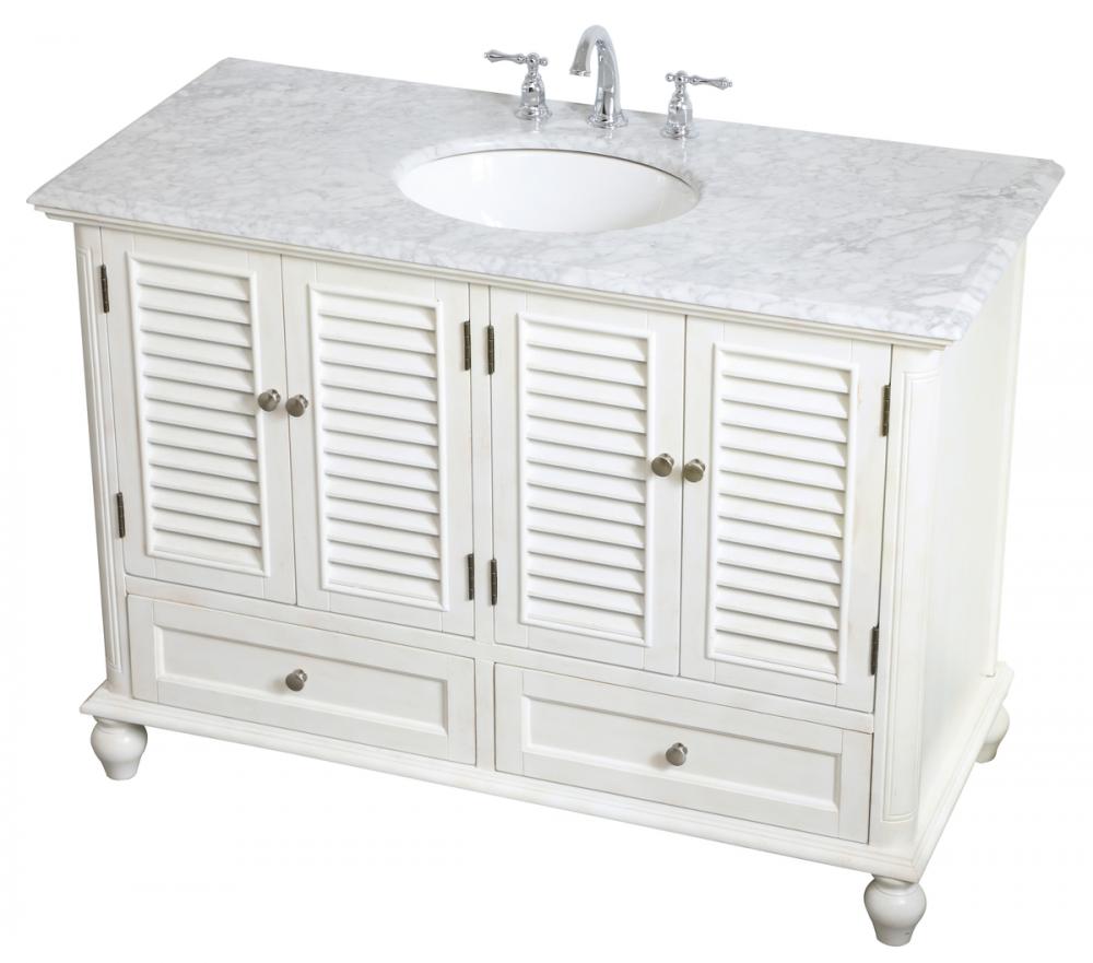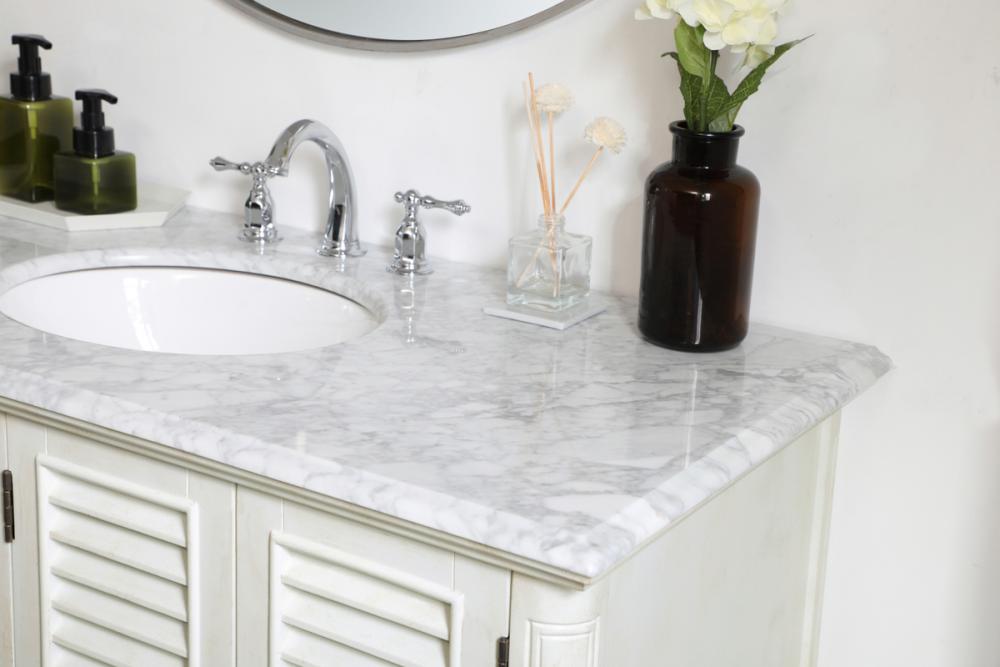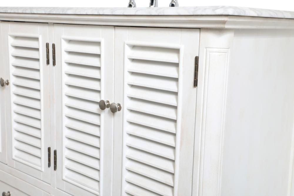 Distressed antique white finish with a luxurious carrara white marble countertop