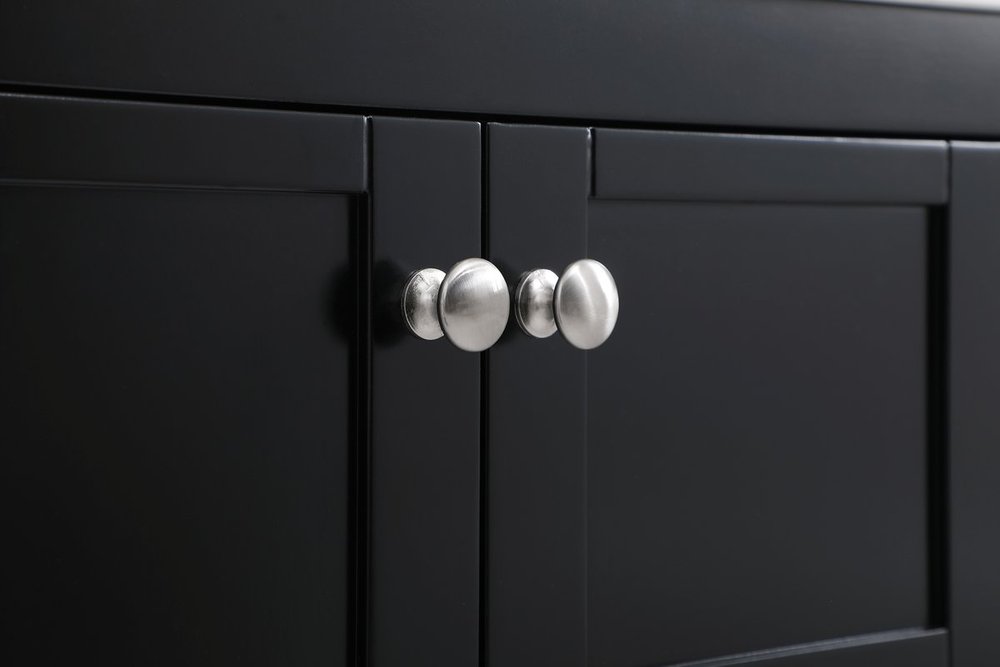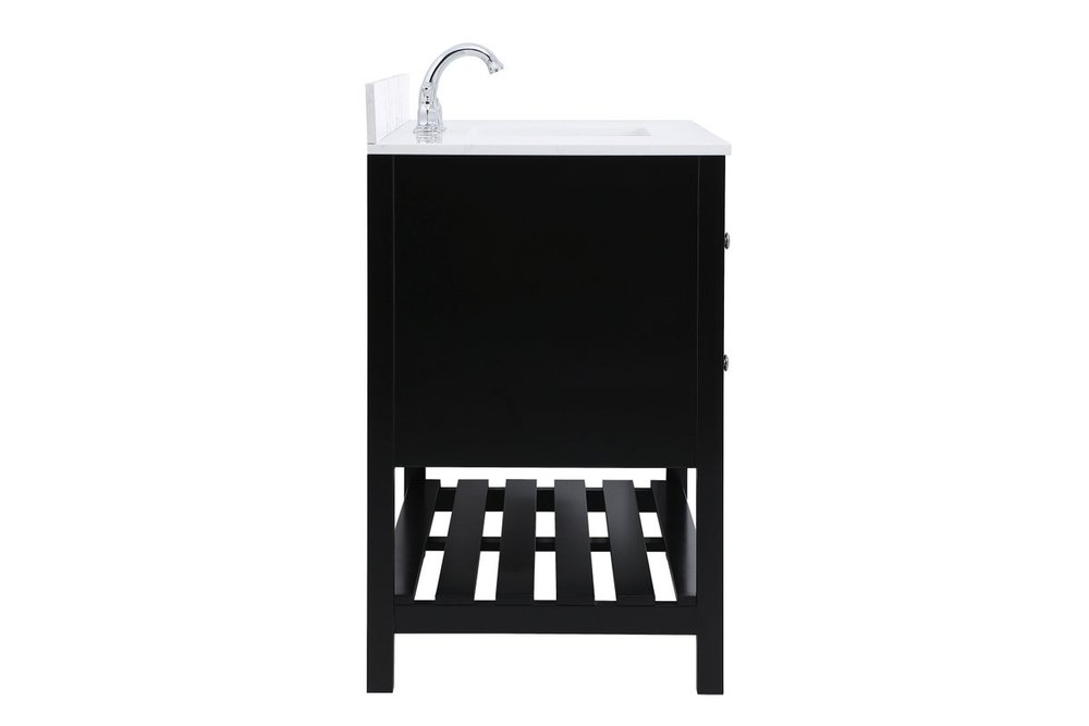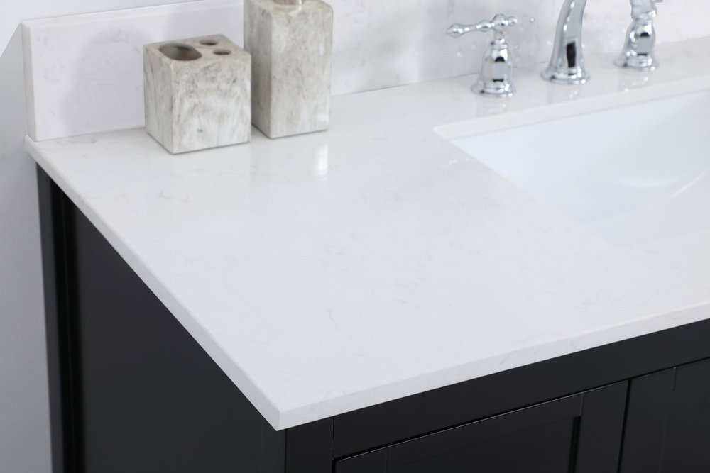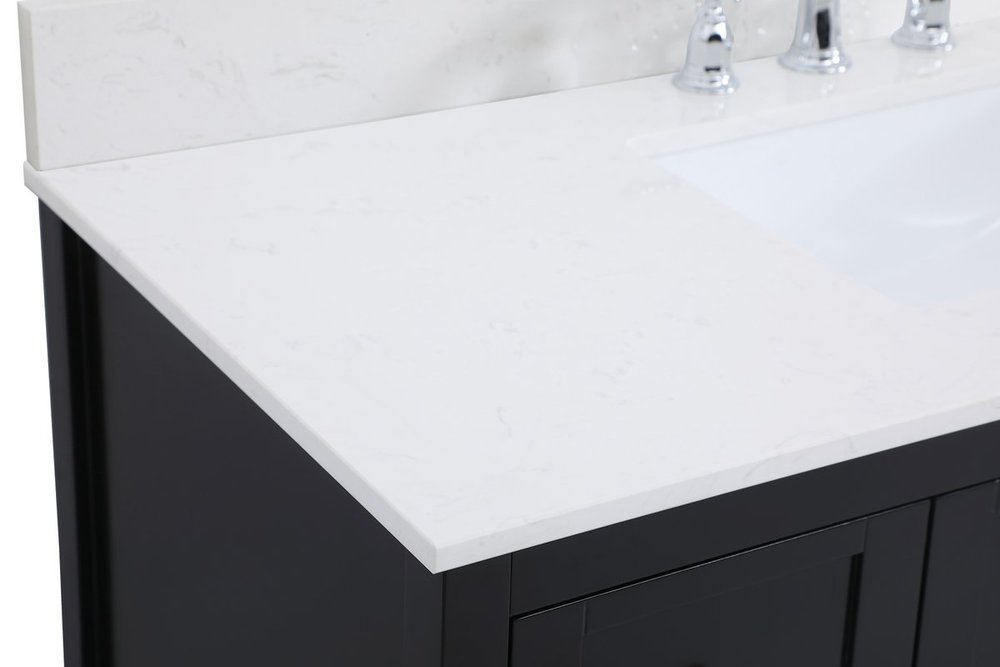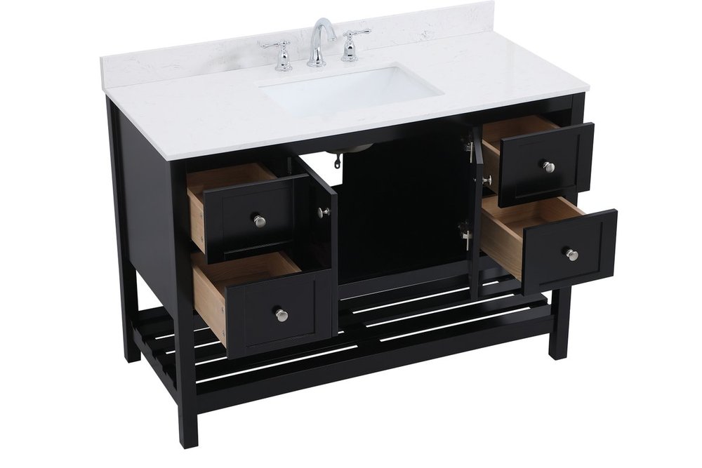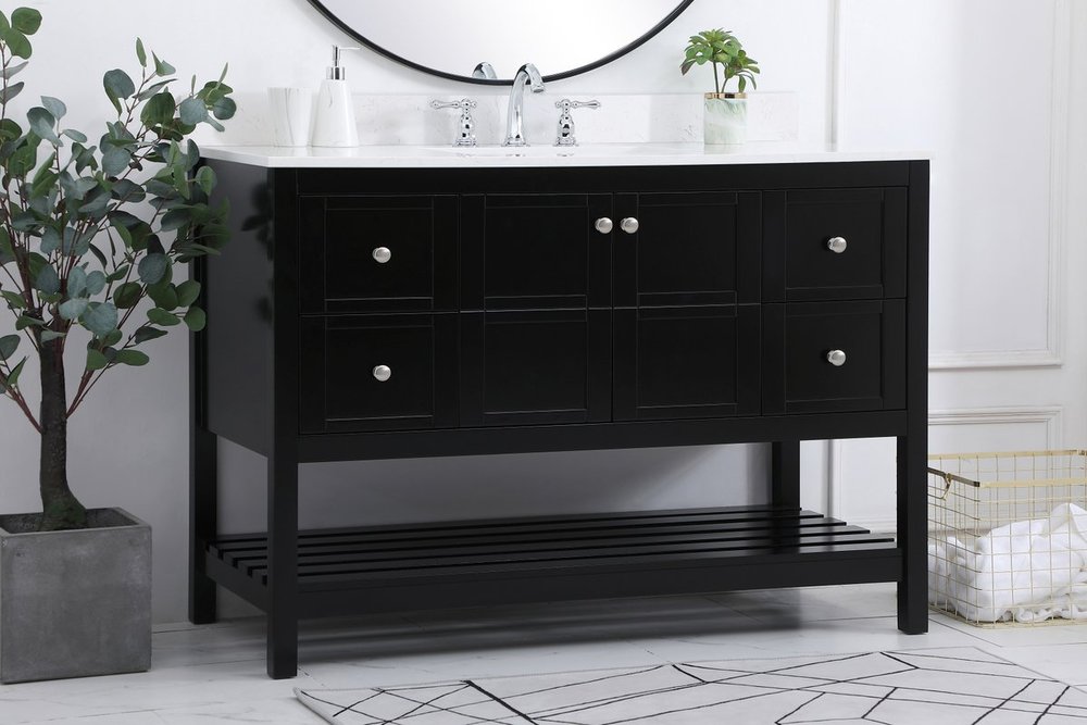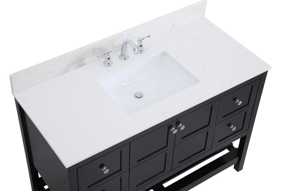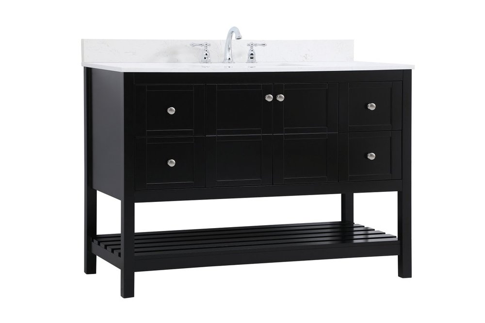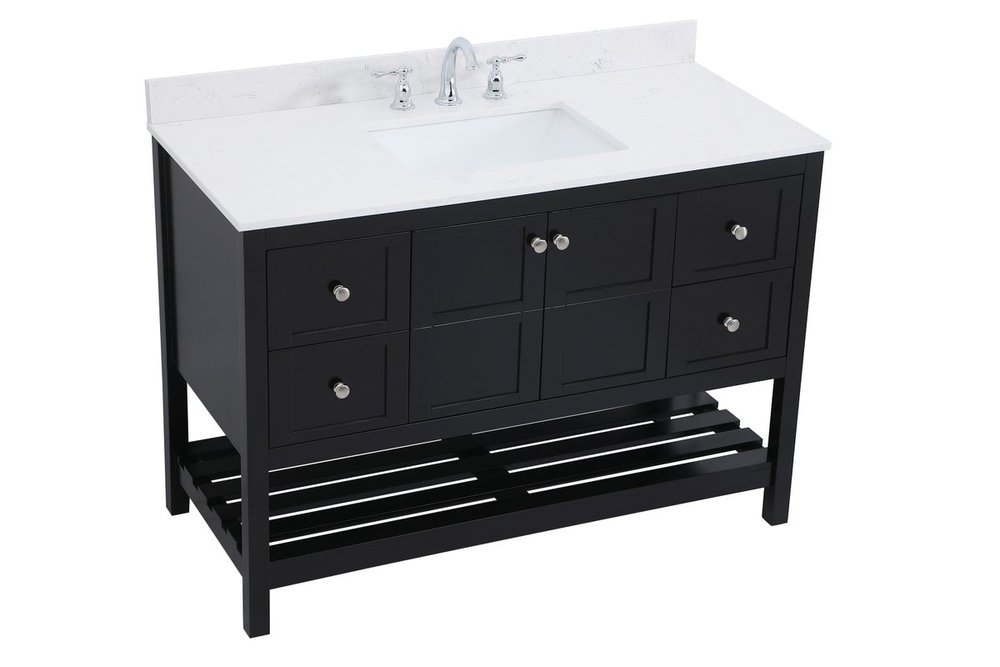 The subtle beauty of the Theo collection 48" vanity in a black finish exudes comfortable luxury. Its modern, yet traditional beauty will surely dress up your bathroom or powder room without any fuss. The white stone countertop and porcelain undermount sink shows quiet opulence, and the legs support upright without fail. Brushed Nickel hardware complements the trendy black finish, with pulls adorning the two cabinet doors and four drawers, showcasing ample storage space within. Slated shelf allows for additional space to organize your towels. Whether this vanity is in your bathroom or for guests, its presence will surely elevate the aesthetics of your room. Comes with a matching backsplash to complete the look and protects your wall.