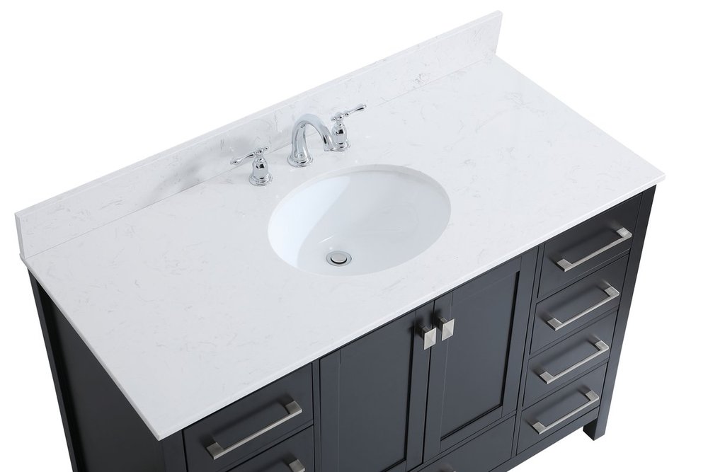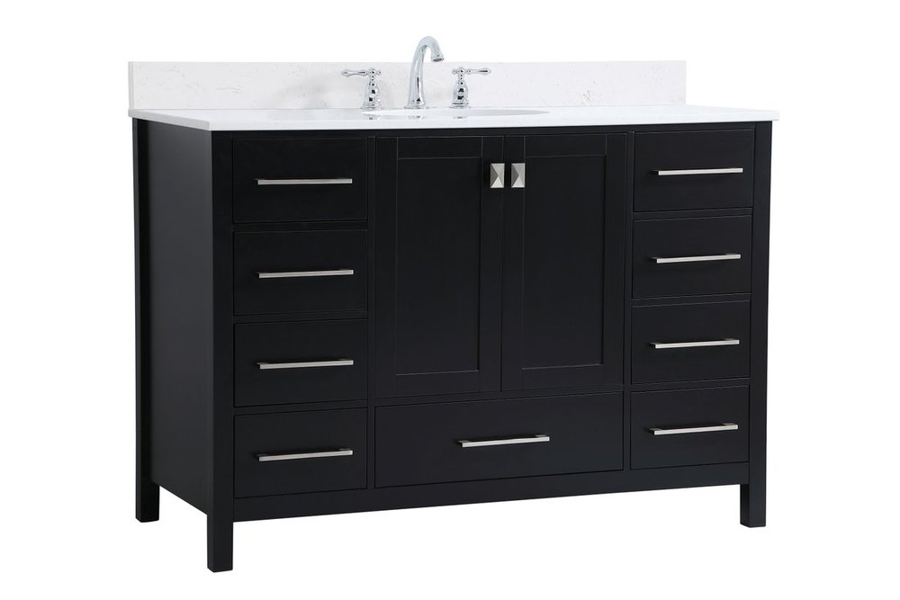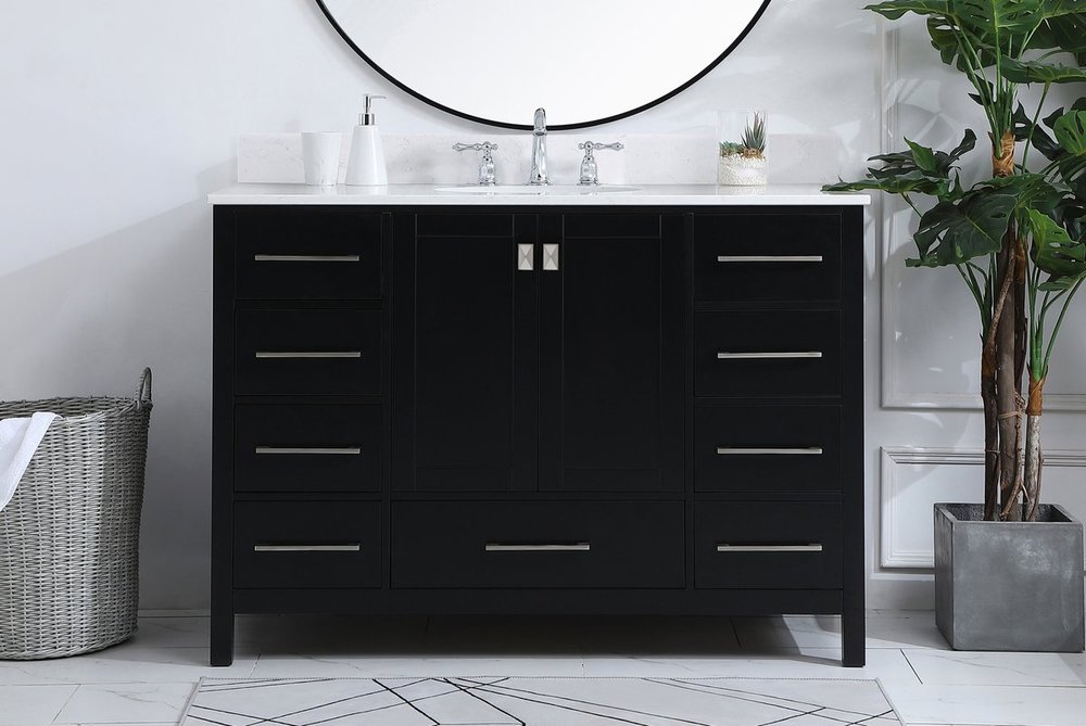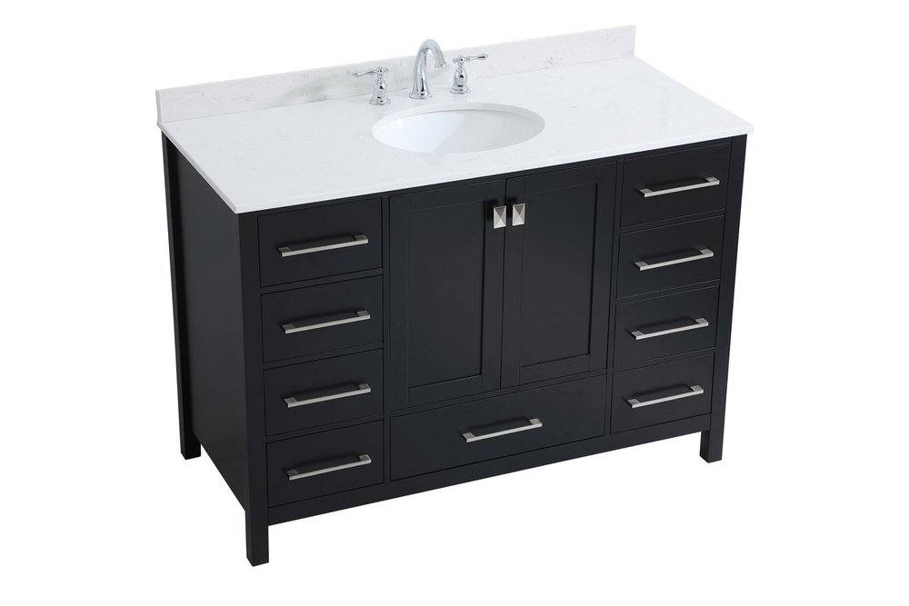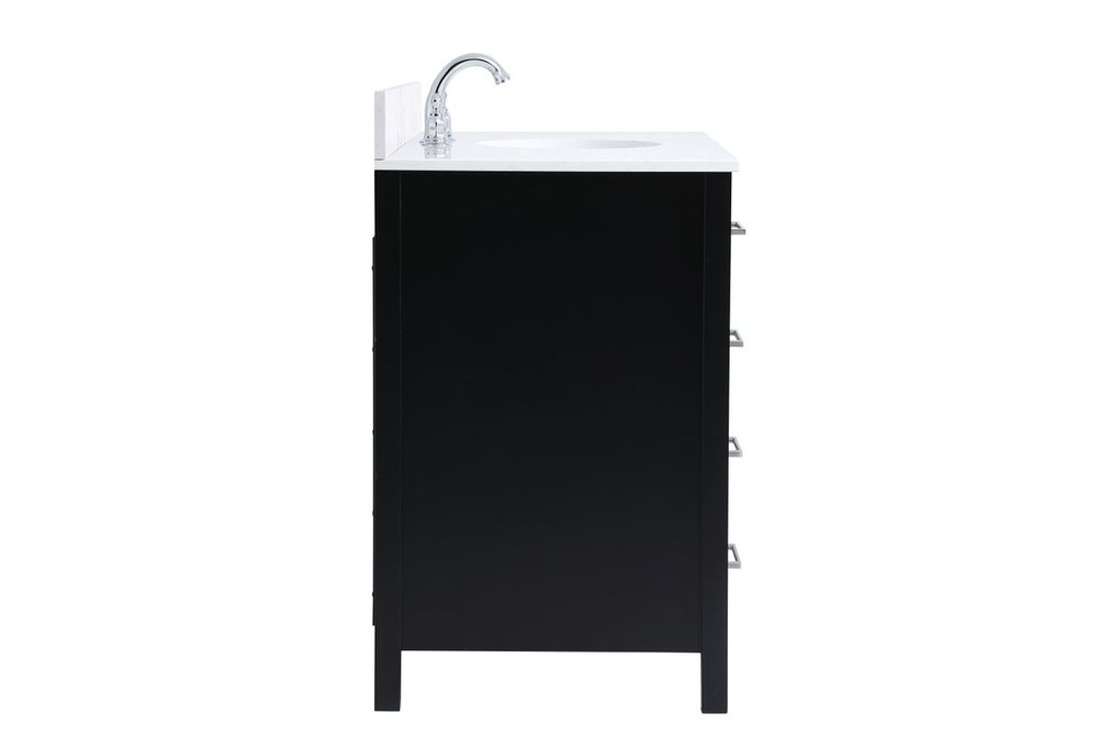 Never compromise beauty--the Irene collection stunning vanity in a black finish will add lovely sophistication and complement any bathroom or powder room, while utilizing its charm and function to provide you with ample storage spaces. Brushed nickel pulls gently adorn the minimalist cabinet doors and drawers at the base, allowing for you to store away your bathroom essentials. The calacatta engineered marble countertop, porcelain undermount sink, dignified subtle engravings on the side edges, and squared legs all come together to create contemporary beauty. Work with your space, and design a beautiful room, no matter the size. Comes with a matching backsplash to complete the look and protects your wall.