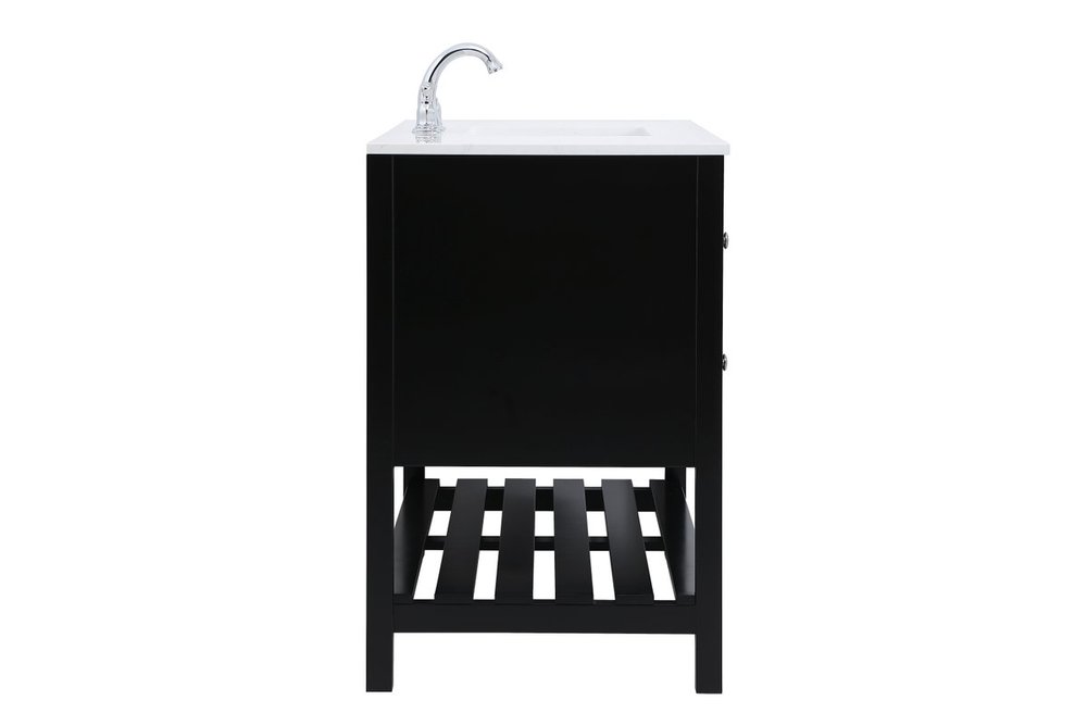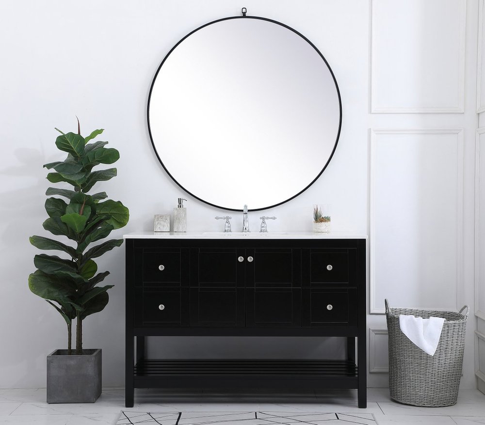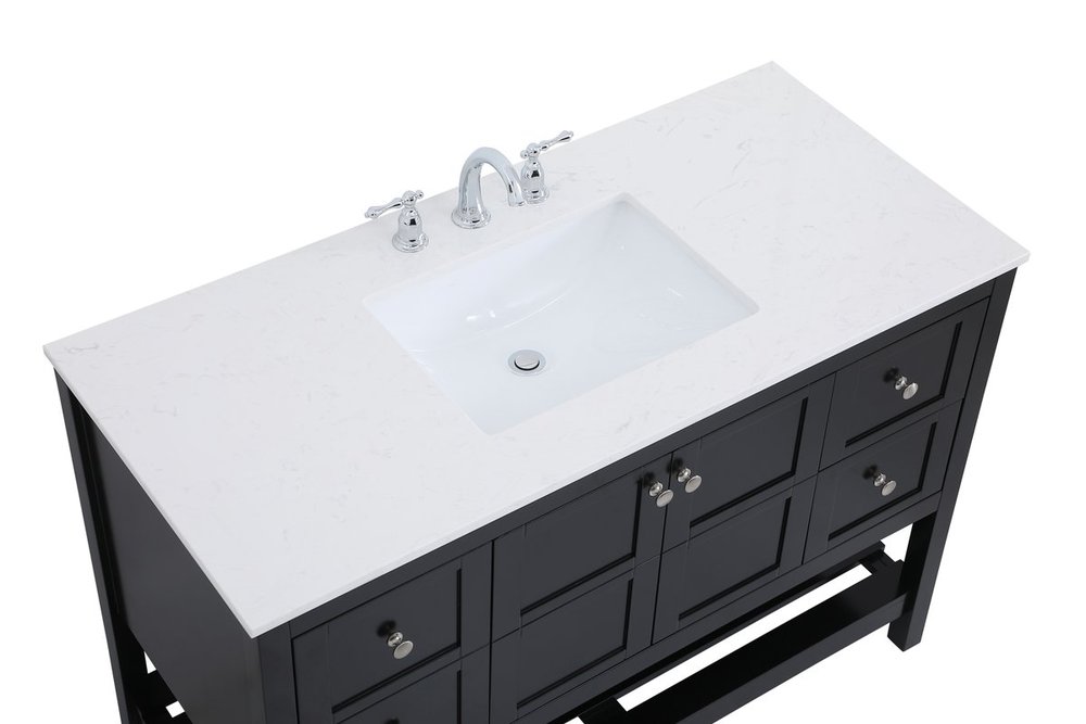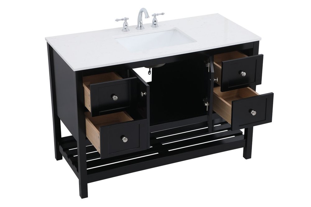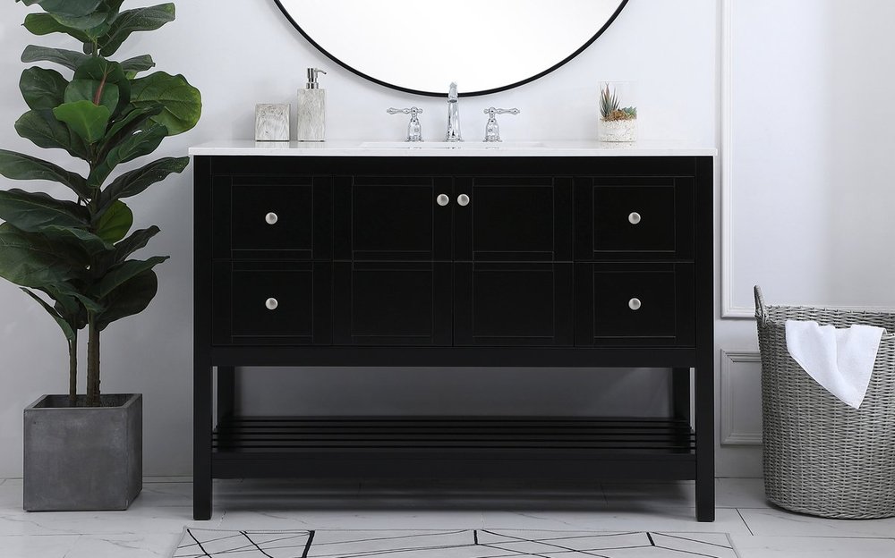 The subtle beauty of the Theo collection 48" vanity in a black finish exudes comfortable luxury. Its modern, yet traditional beauty will surely dress up your bathroom or powder room without any fuss. The white stone countertop and porcelain undermount sink shows quiet opulence, and the legs support upright without fail. Brushed Nickel hardware complements the trendy black finish, with pulls adorning the two cabinet doors and four drawers, showcasing ample storage space within. Slated shelf allows for additional space to organize your towels. Whether this vanity is in your bathroom or for guests, its presence will surely elevate the aesthetics of your room.