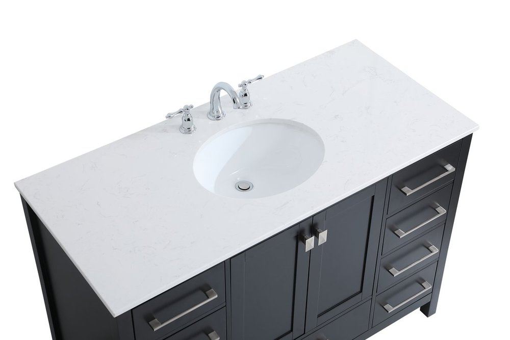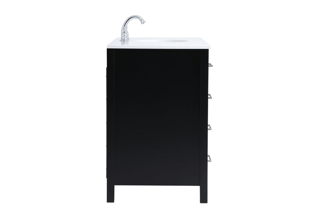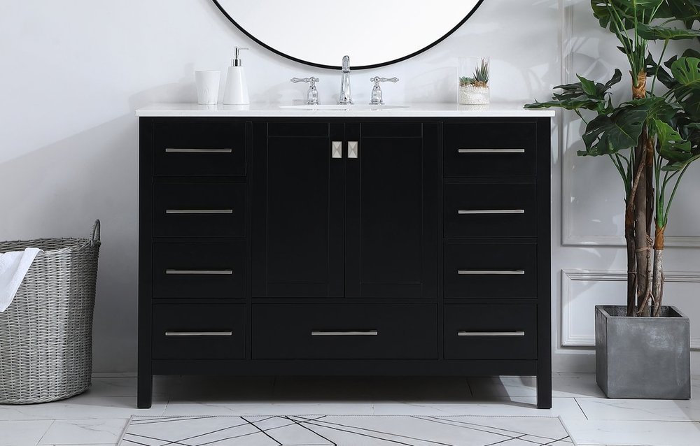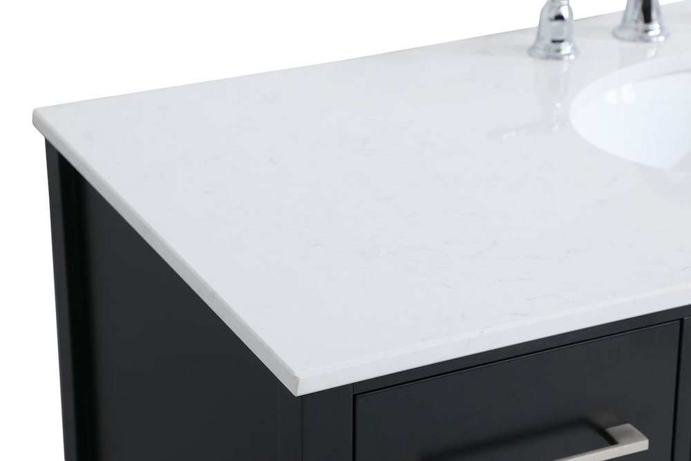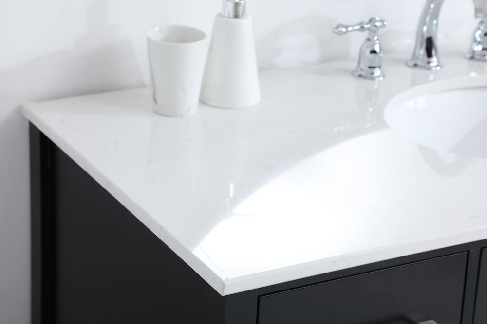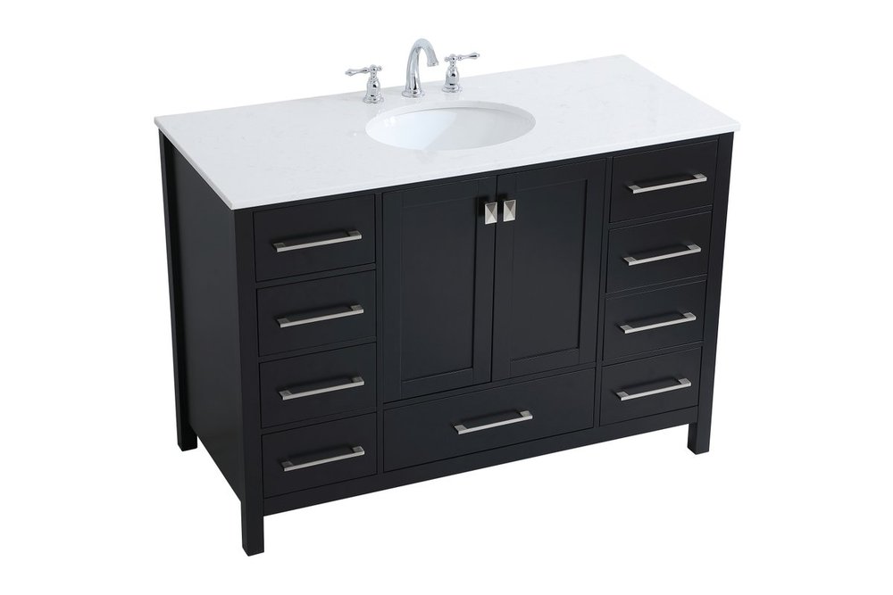 Never compromise beauty--the Irene collection stunning vanity in a black finish will add lovely sophistication and complement any bathroom or powder room, while utilizing its charm and function to provide you with ample storage spaces. Brushed nickel pulls gently adorn the minimalist cabinet doors and drawers at the base, allowing for you to store away your bathroom essentials. The calacatta engineered marble countertop, porcelain undermount sink, dignified subtle engravings on the side edges, and squared legs all come together to create contemporary beauty. Work with your space, and design a beautiful room, no matter the size.