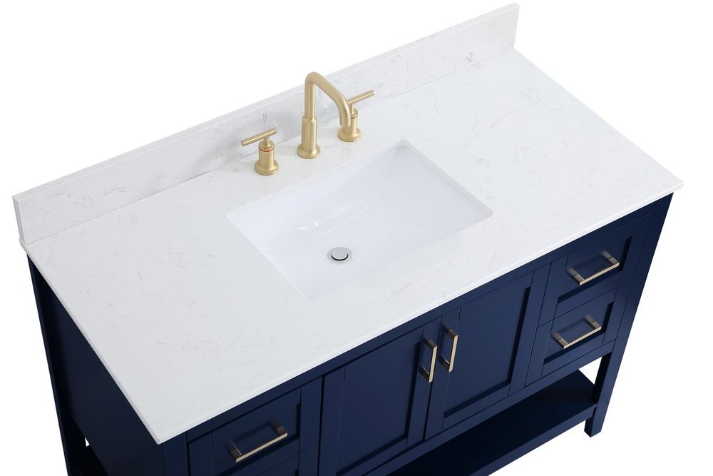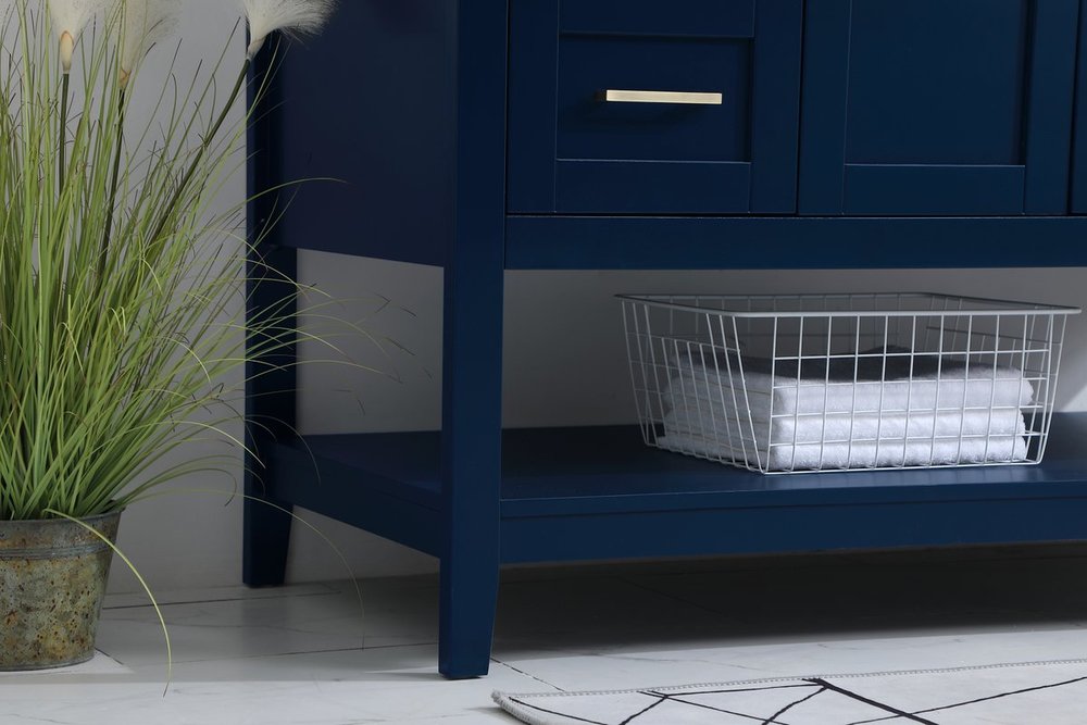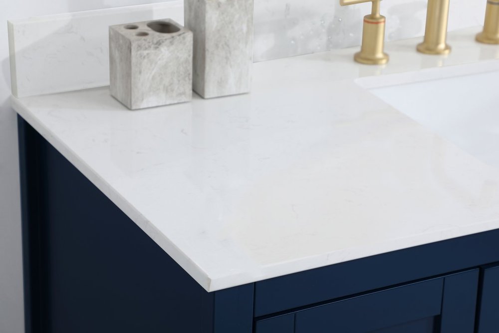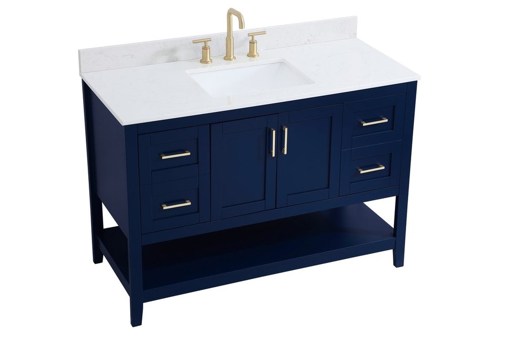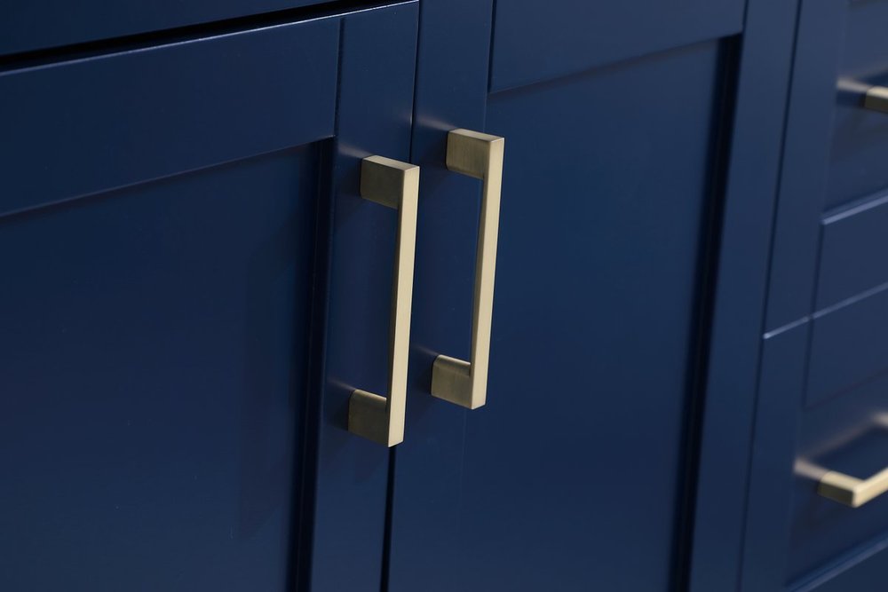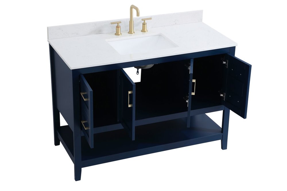 The nonchalant attitude of this 42" traditional Blue finish vanity will have you wanting more. The slender gold handle bars open the center double cabinet and two side cabinet doors to reveal ample storage space to put away and store bathroom essentials, and the open space below allows for you to place clean towels on the rack. Topped with a Calacatta engineered marble countertop, you and your guests will enjoy this easy going vanity. Comes with a matching backsplash to complete the look and protects your wall.