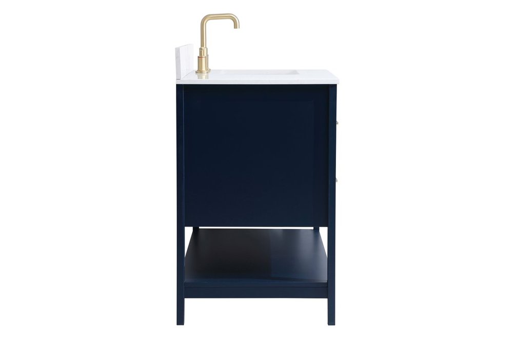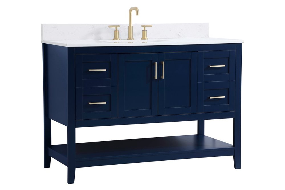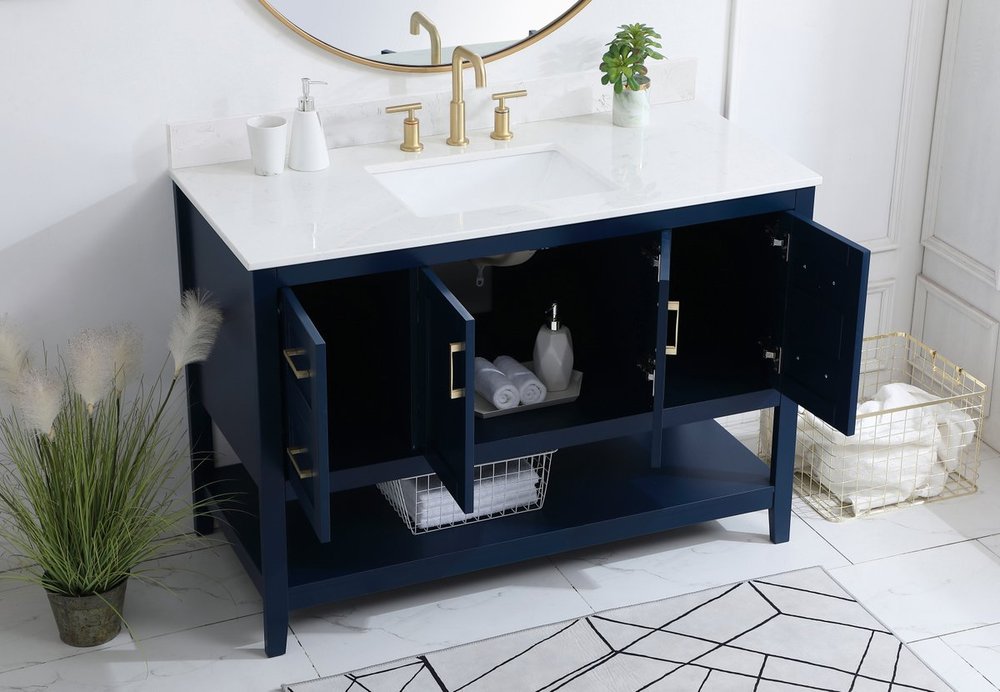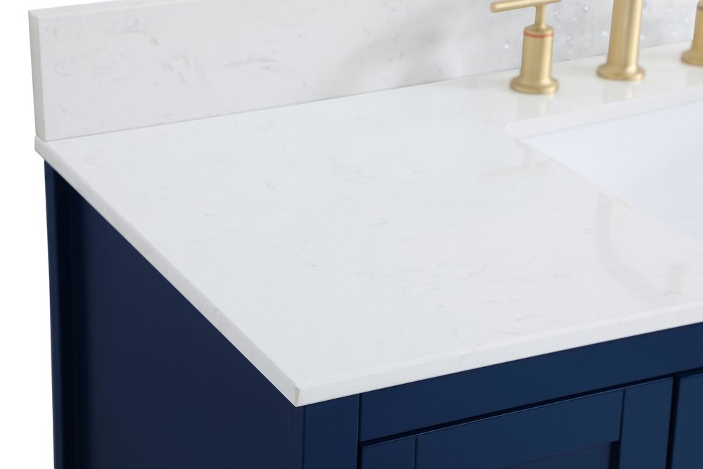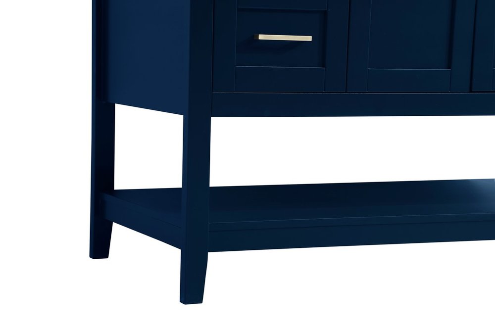 The nonchalant attitude of this 42" traditional Blue finish vanity will have you wanting more. The slender gold handle bars open the center double cabinet and two side cabinet doors to reveal ample storage space to put away and store bathroom essentials, and the open space below allows for you to place clean towels on the rack. Topped with a Calacatta engineered marble countertop, you and your guests will enjoy this easy going vanity. Comes with a matching backsplash to complete the look and protects your wall.