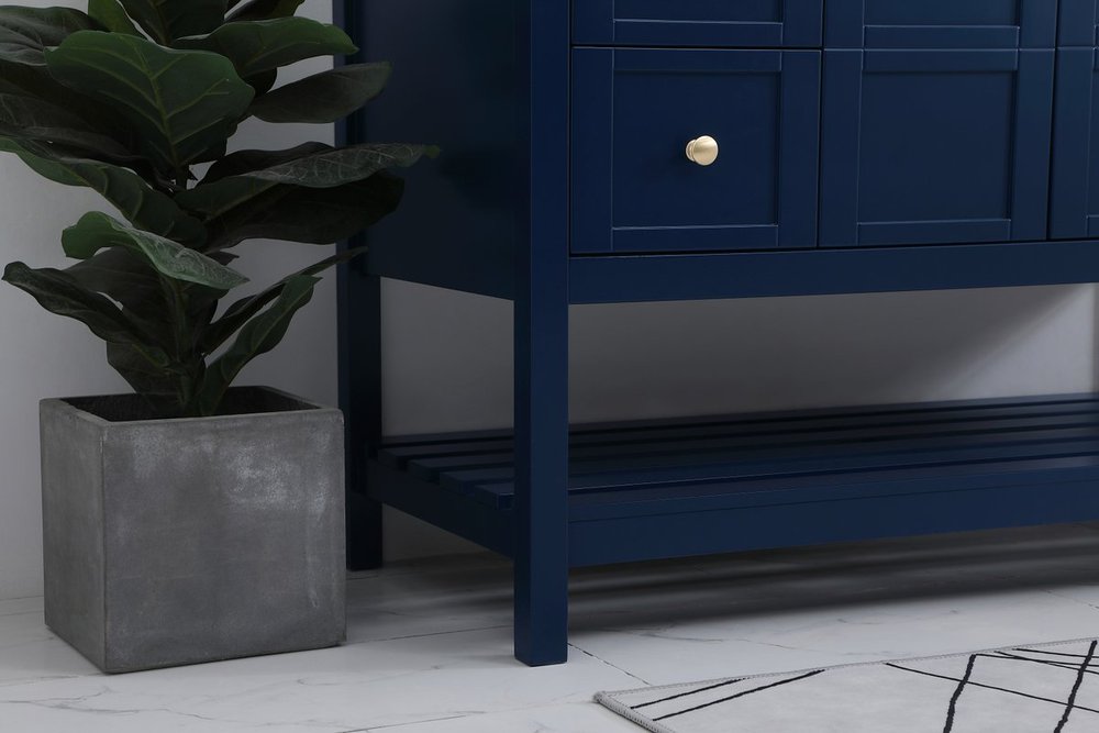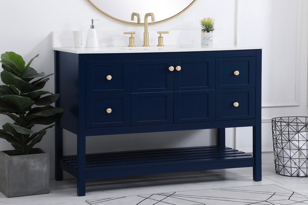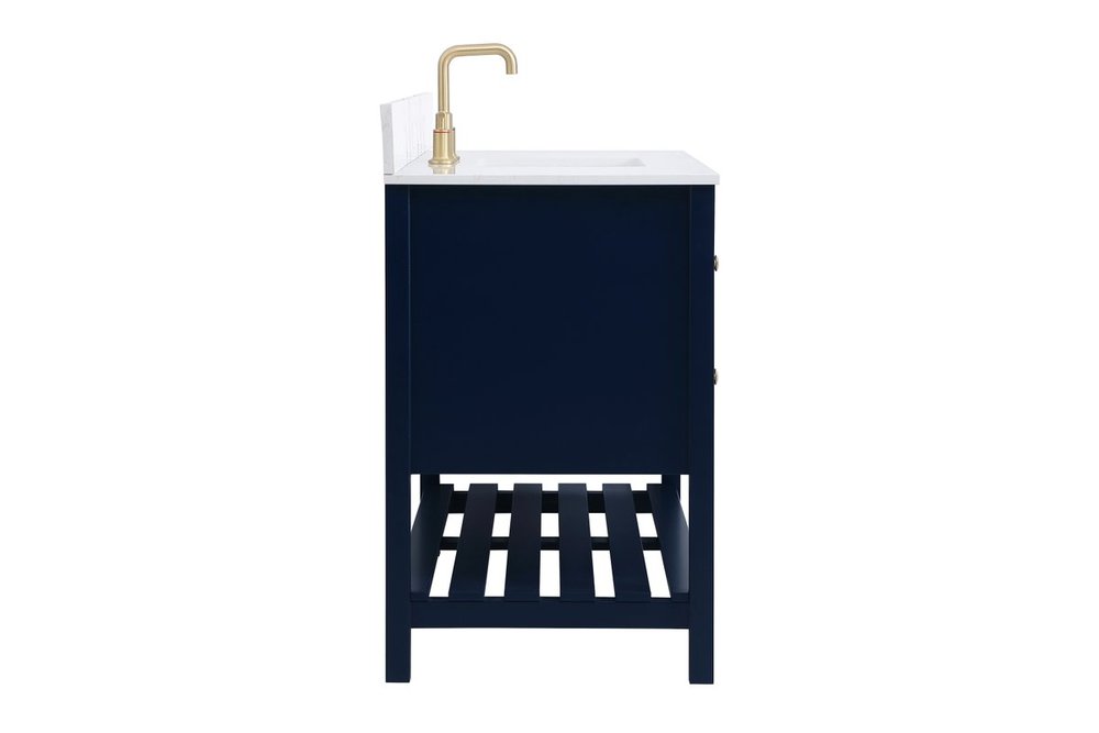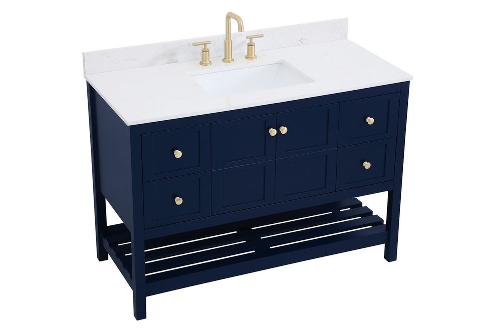 The subtle beauty of the Theo collection 48" vanity in a blue finish exudes comfortable luxury. Its modern, yet traditional beauty will surely dress up your bathroom or powder room without any fuss. The white stone countertop and porcelain undermount sink shows quiet opulence, and the legs support upright without fail. Gold hardware complements the trendy blue finish, with pulls adorning the two cabinet doors and four drawers, showcasing ample storage space within. Slated shelf allows for additional space to organize your towels. Whether this vanity is in your bathroom or for guests, its presence will surely elevate the aesthetics of your room. Comes with a matching backsplash to complete the look and protects your wall.
