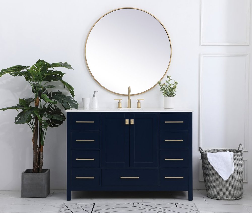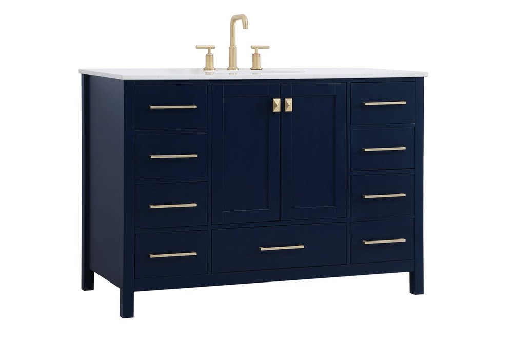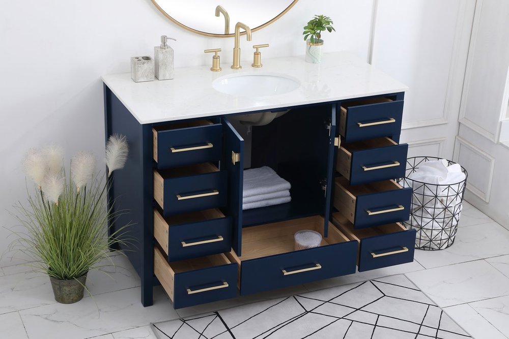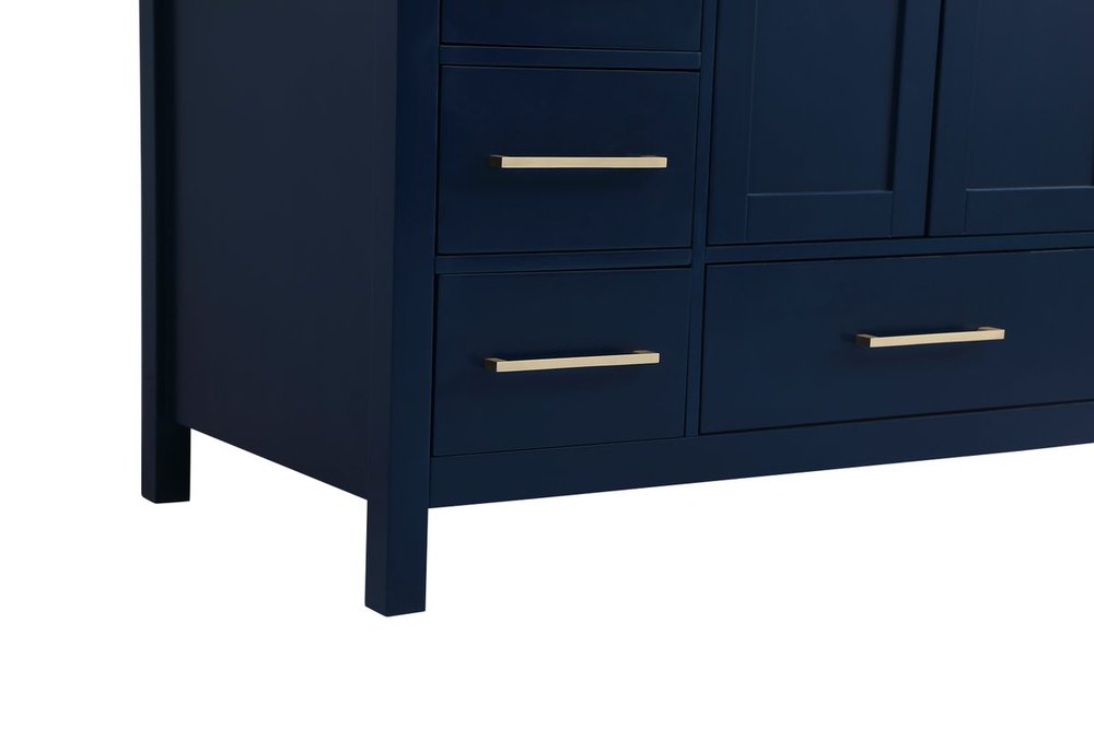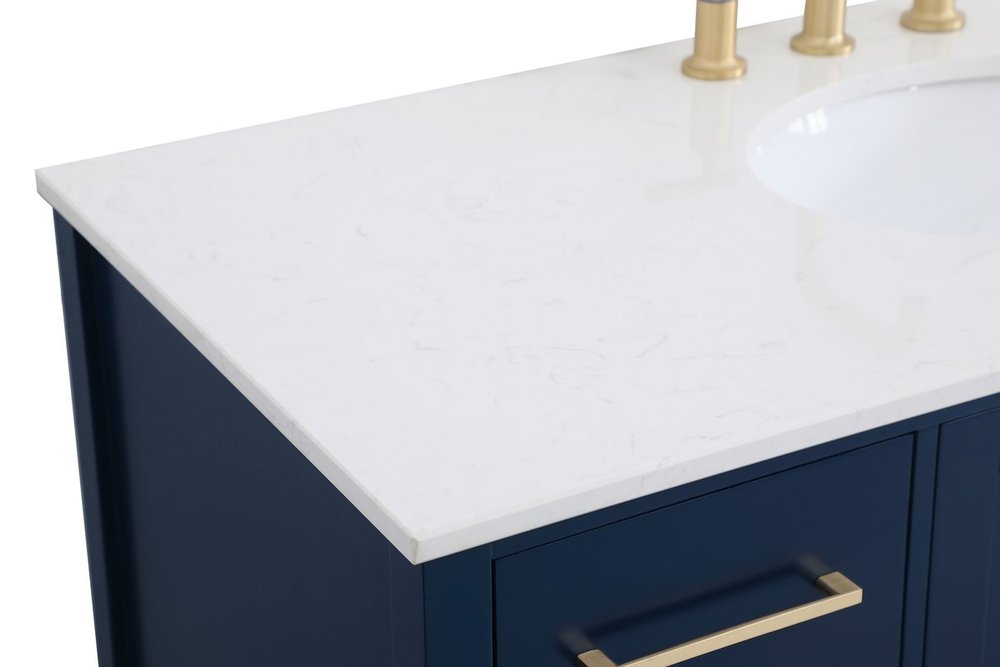 Never compromise beauty--the Irene collection stunning vanity in a blue finish will add lovely sophistication and complement any bathroom or powder room, while utilizing its charm and function to provide you with ample storage spaces. Satin gold pulls gently adorn the minimalist cabinet doors and drawers at the base, allowing for you to store away your bathroom essentials. The calacatta engineered marble countertop, porcelain undermount sink, dignified subtle engravings on the side edges, and squared legs all come together to create contemporary beauty. Work with your space, and design a beautiful room, no matter the size.