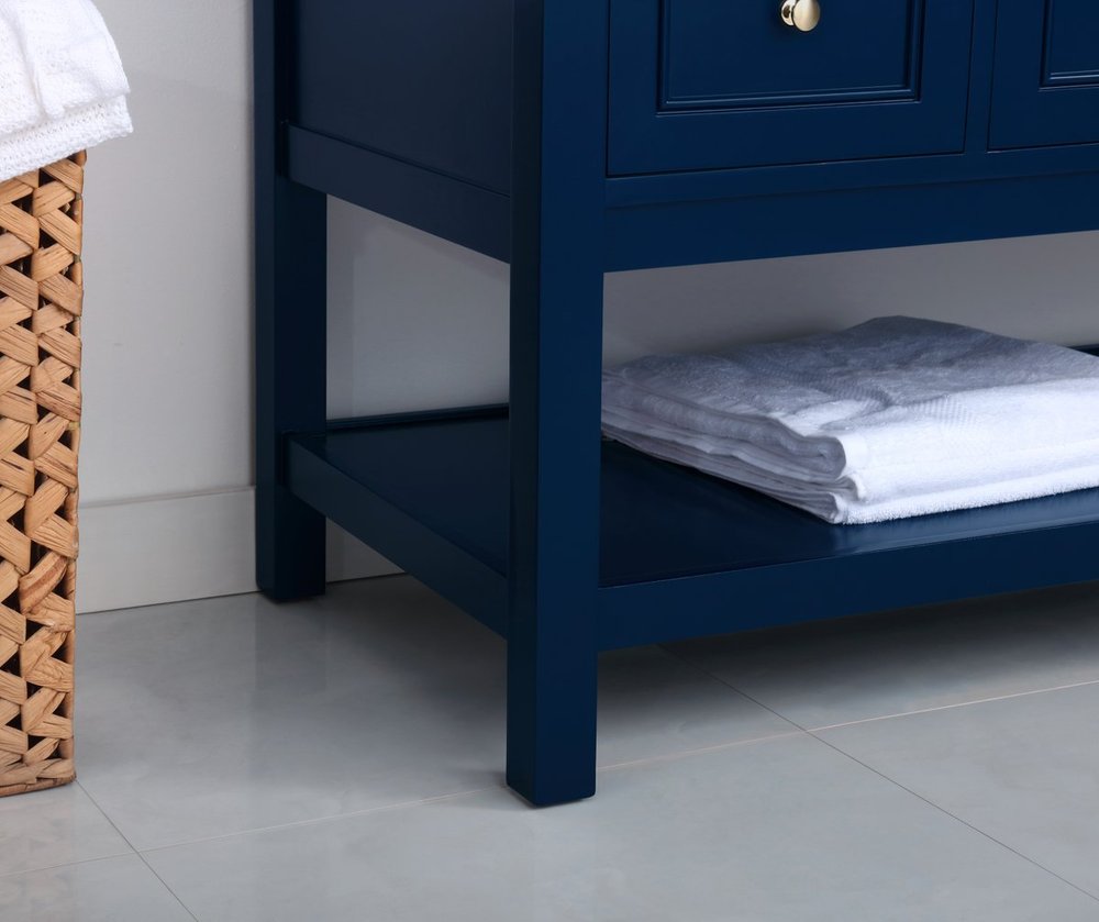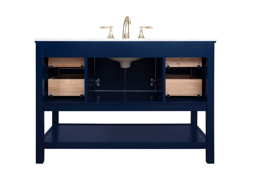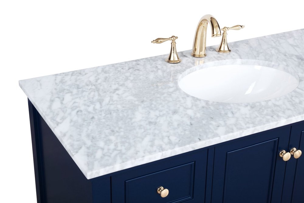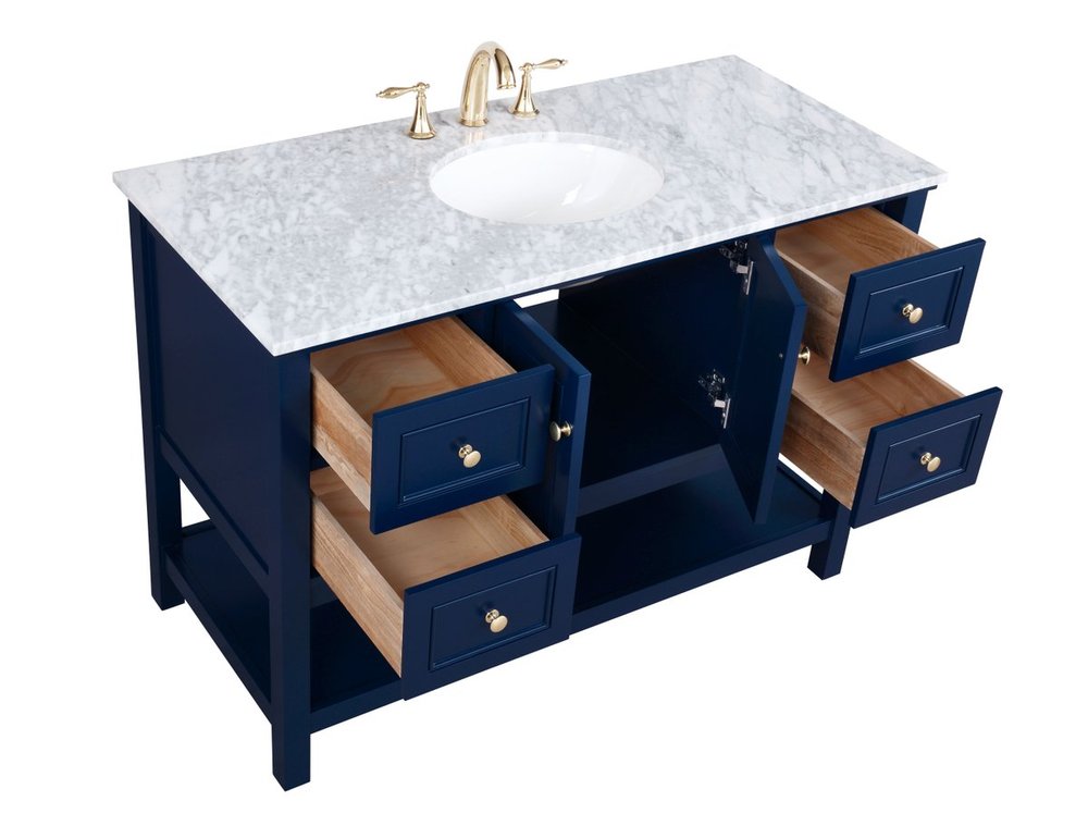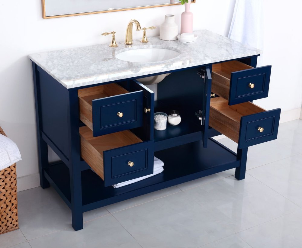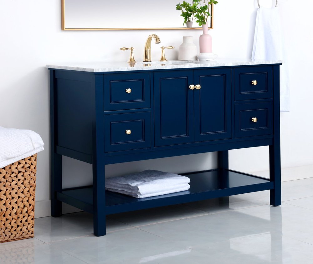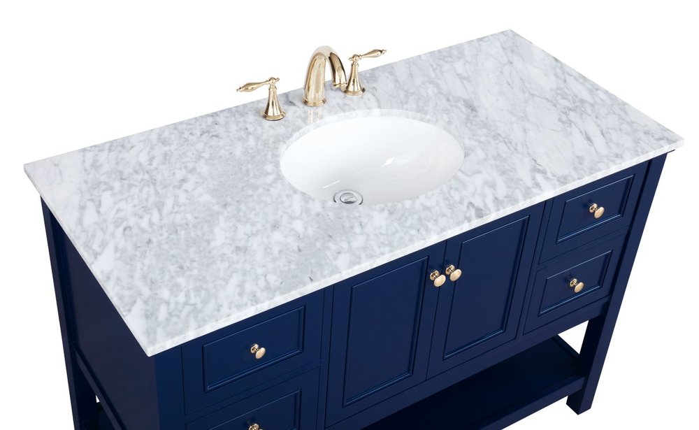 Create a refined and relaxing bath space with this contemporary design vanity, presenting its simplicity and clean straight lines in a minimalist appeal. This 48" freestanding vanity, crafted of solid poplar wood in a soft-grey finish, provides ample storage within its double center door and 4 side drawers, all equipted with soft closing mechanism and accentuated with gleaming chrome hardware. Rounding out the design is a luxurious Itallian Carrara white marble counter top and a white porcelain under-mount oval sink.