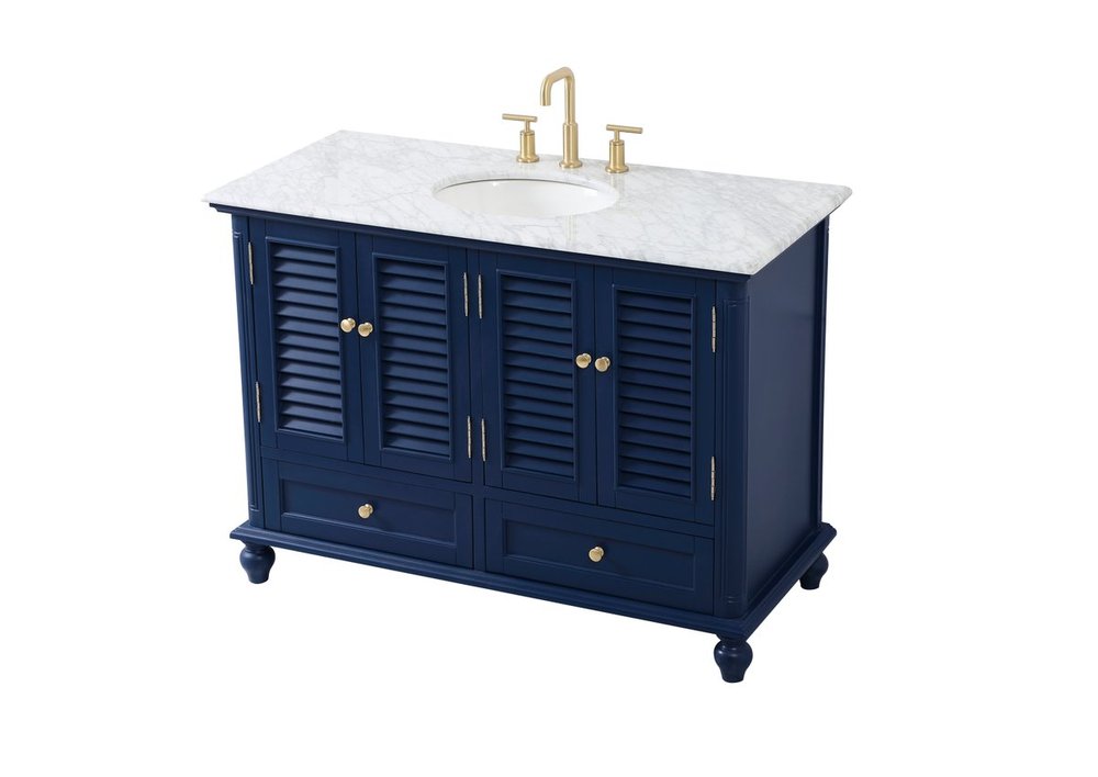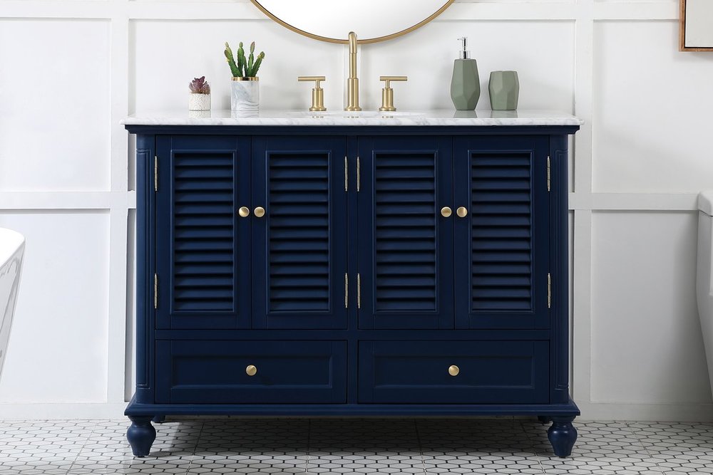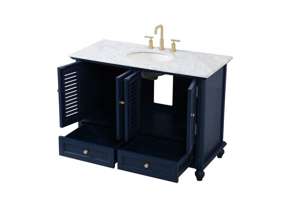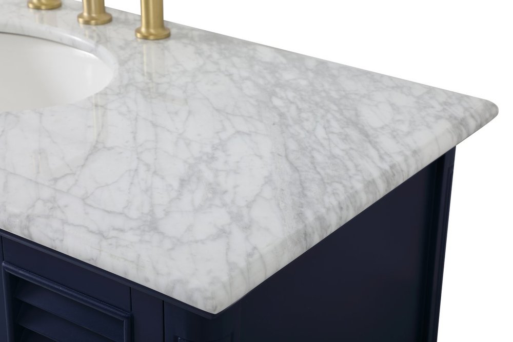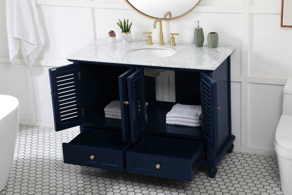 The Rhodes collection compact vanity will add lovely sophistication and complement any small bathroom or powder room, while utilizing its charm and function to provide you with ample storage spaces. Metal round knobs gently adorn the shuttered cabinet door and drawer at the base, allowing for you to store away your bathroom essentials. The Carrara white marble countertop, porcelain undermount sink, dignified subtle engravings on the side edges, and rounded legs all come together to create contemporary beauty. Work with your space, and design a beautiful room, no matter the size.