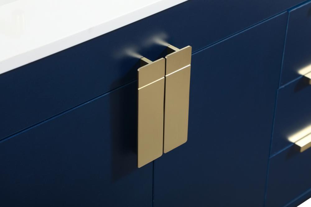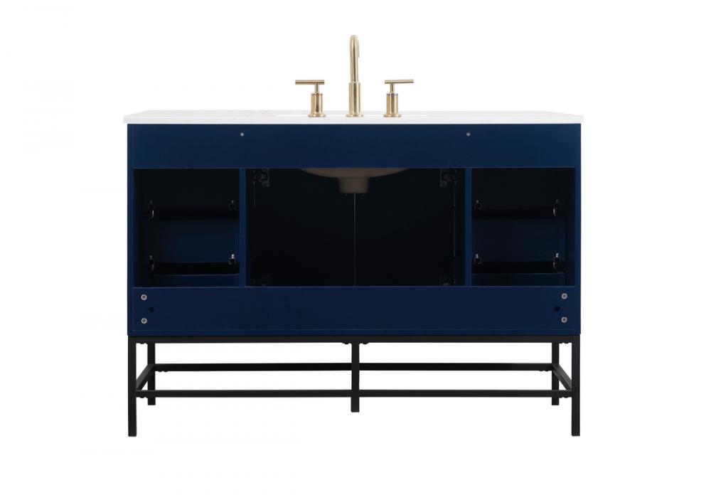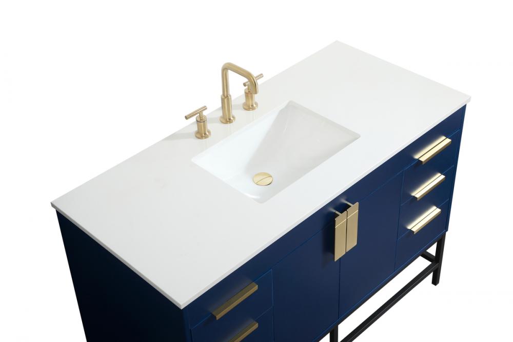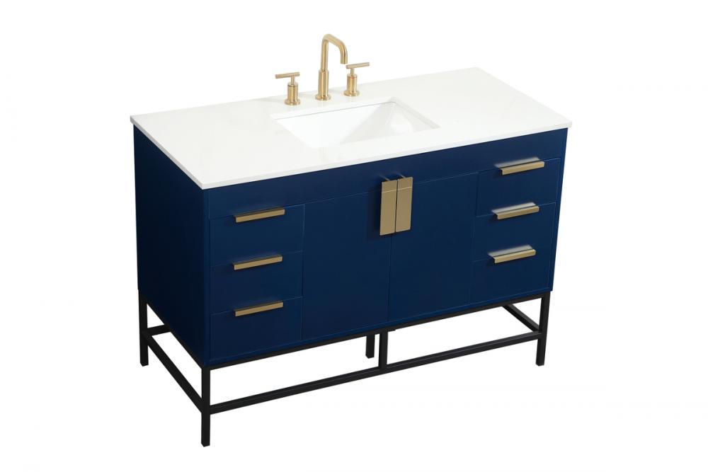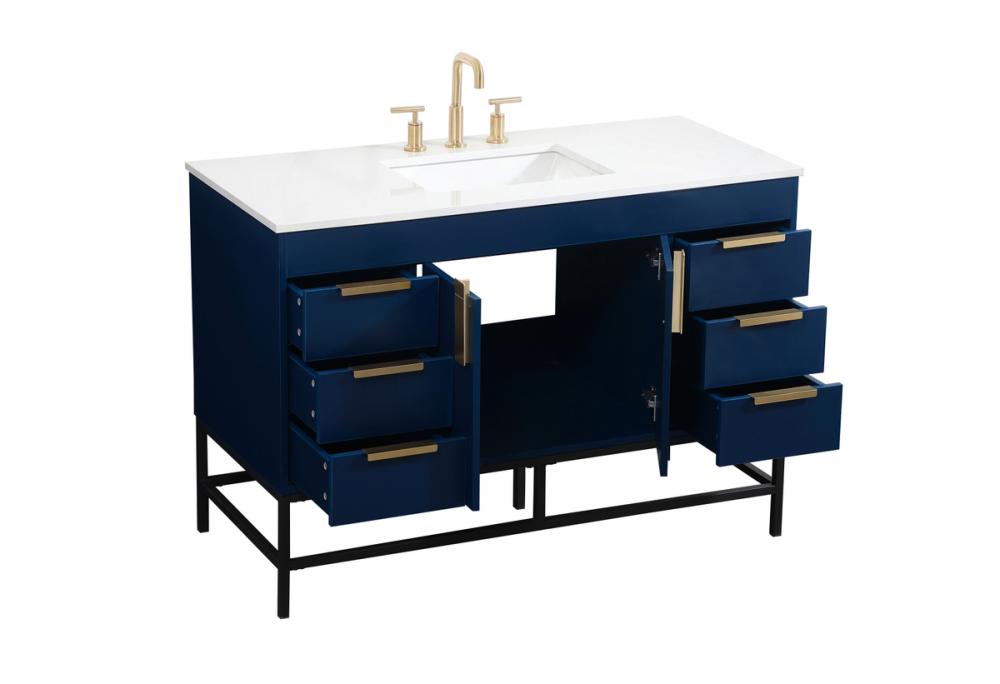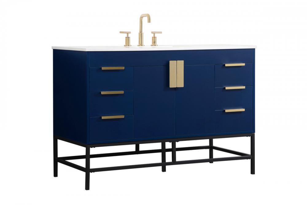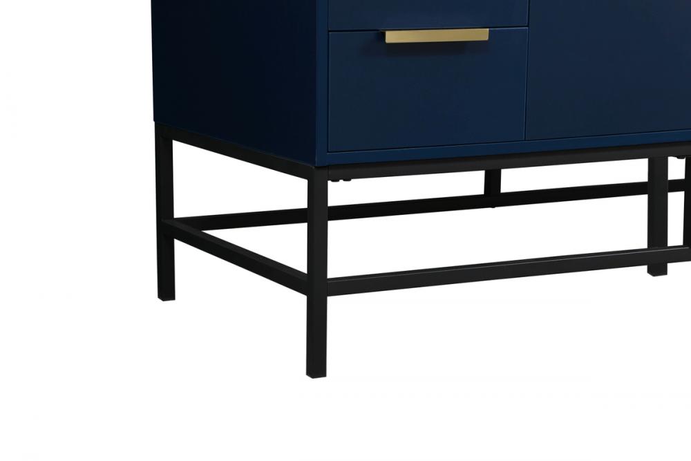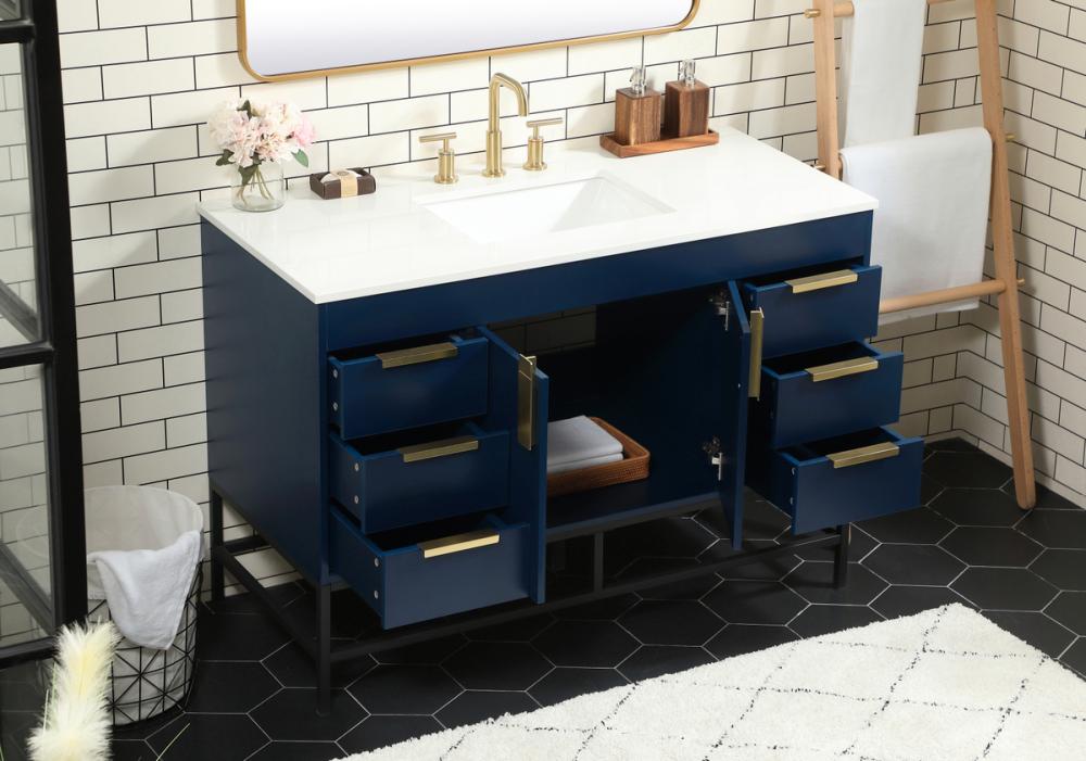 This vanity is a sleek-looking piece of bathroom furniture that is easy to incorporate into your design scheme. The cabinet features a smooth door panel with an oversized steel handle and soft close hinges provide ample room for accessories. Packed with multiple side drawers with soft close glides for added comfort and full access to bath supplies. Constructed of engineered wood, the powder-coated metal rod legs are an urban industrial look that we love. Minor assembly of the metal legs needed to get this vanity up and running.