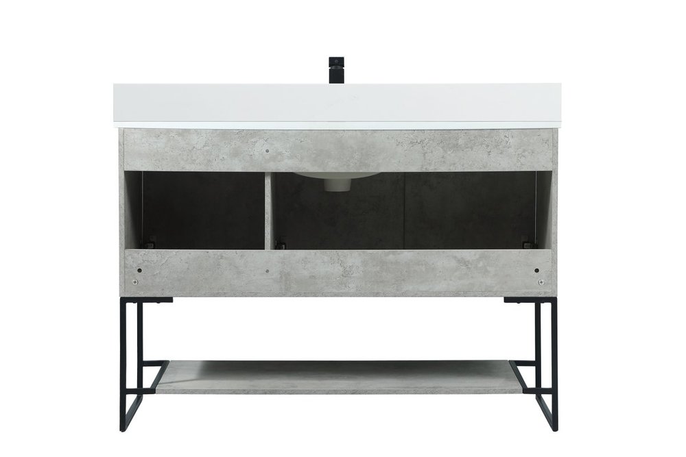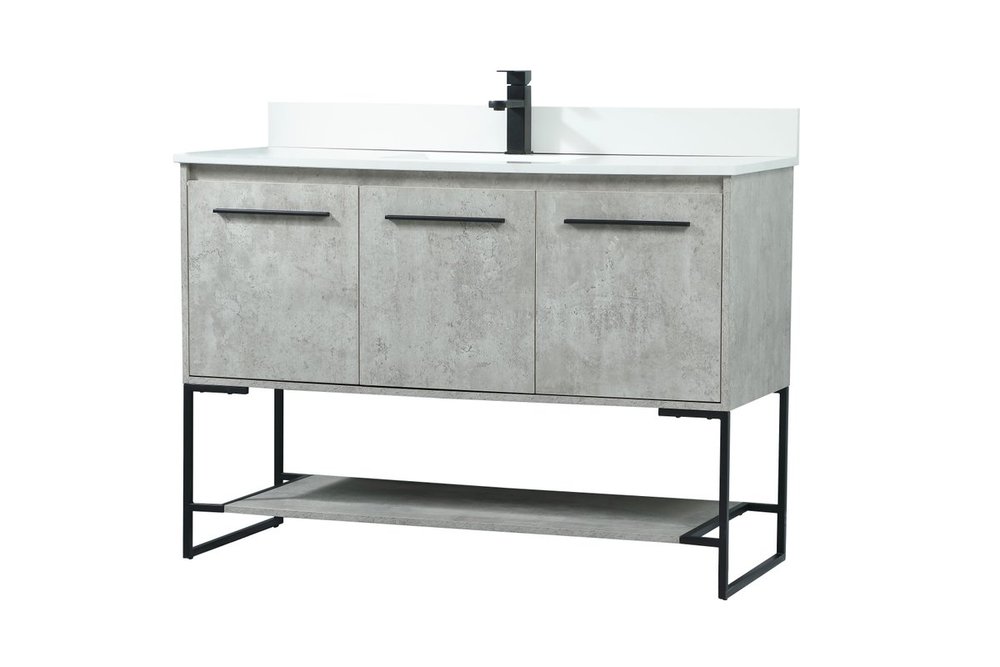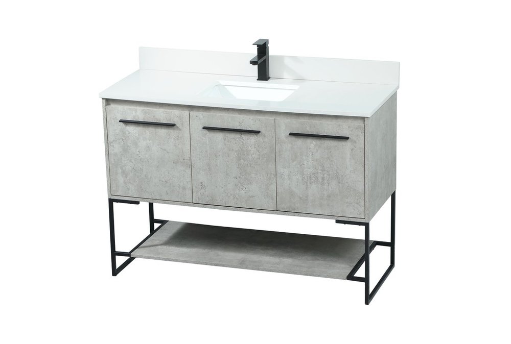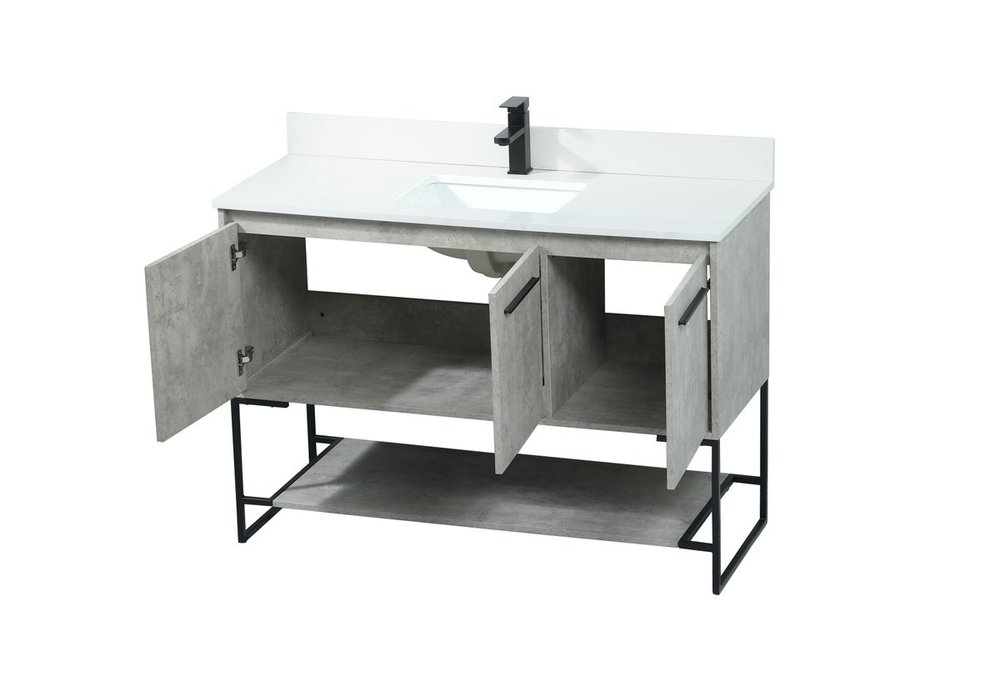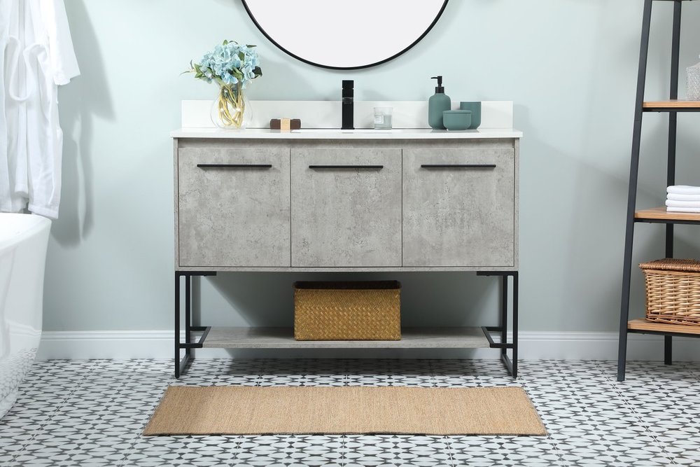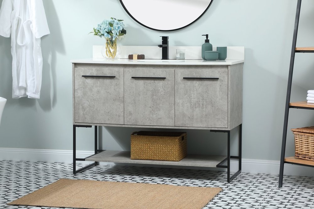 Live in modern comfort with this 48" concrete grey finish vanity. Dressed in a concrete grey and sleek black metal hardware, its contemporary style will have your bathroom or powder room elevated in industrial sophistication. The open shelf at the base and three doors reveal ample storage space for your bathroom essentials and miscellany. Clean lines create its own visual interest, adding trendy looks to your already chic room. Comes with a matching backsplash to complete the look and protects your wall.