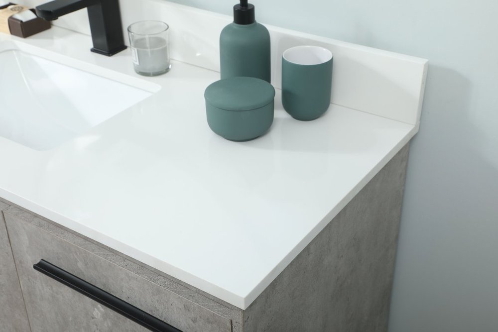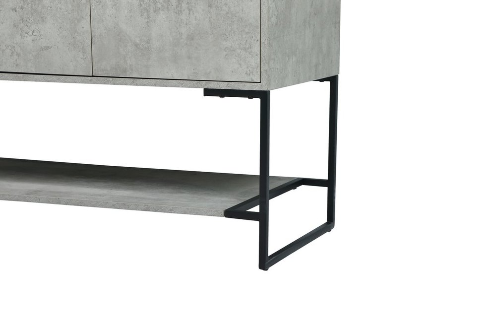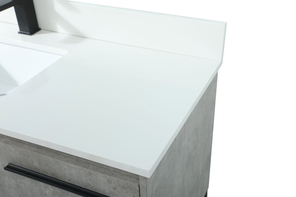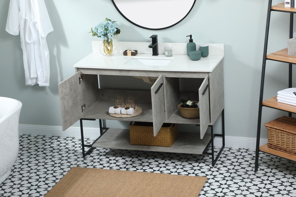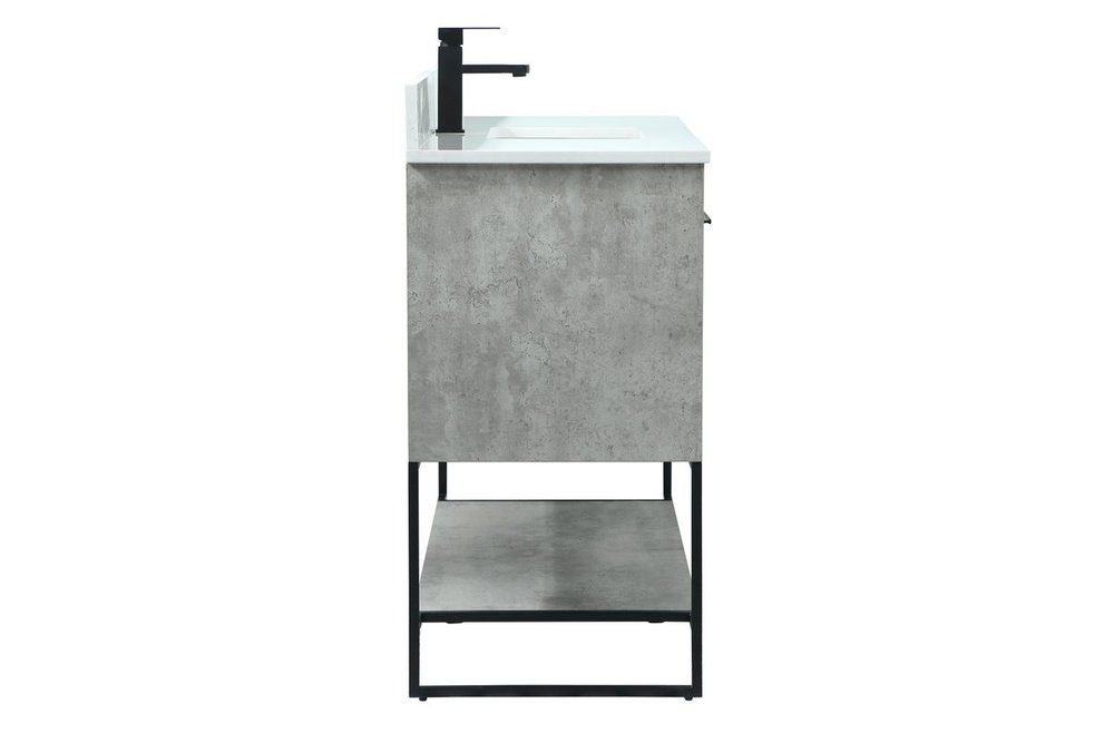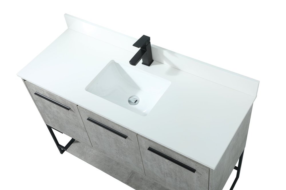 Live in modern comfort with this 48" concrete grey finish vanity. Dressed in a concrete grey and sleek black metal hardware, its contemporary style will have your bathroom or powder room elevated in industrial sophistication. The open shelf at the base and three doors reveal ample storage space for your bathroom essentials and miscellany. Clean lines create its own visual interest, adding trendy looks to your already chic room. Comes with a matching backsplash to complete the look and protects your wall.