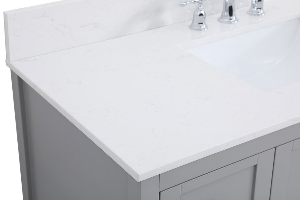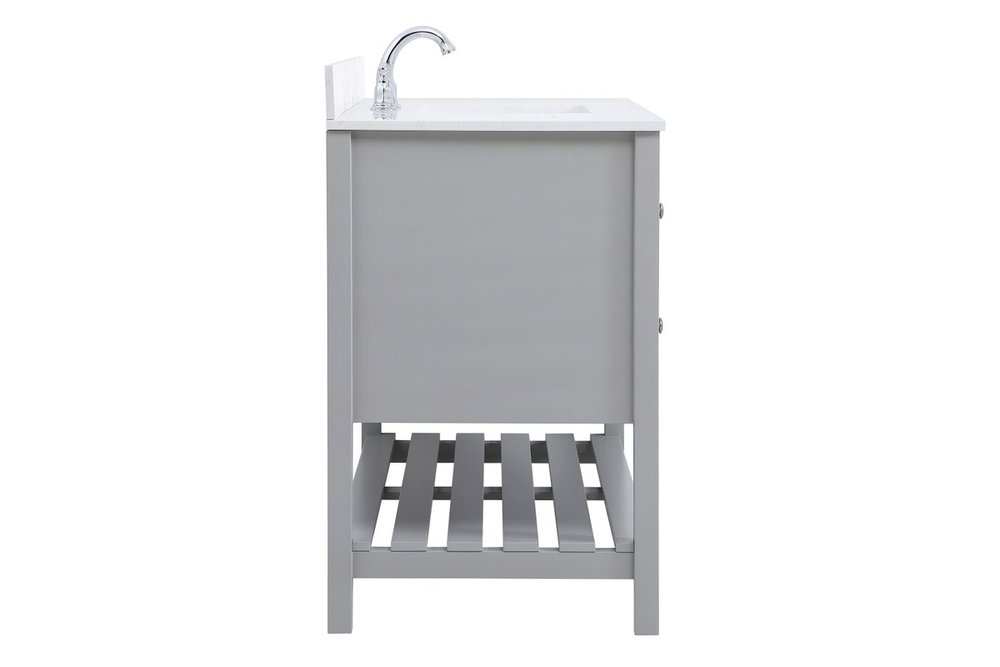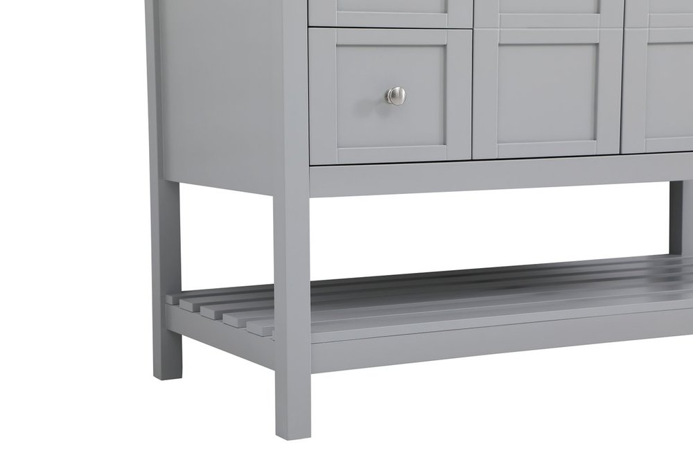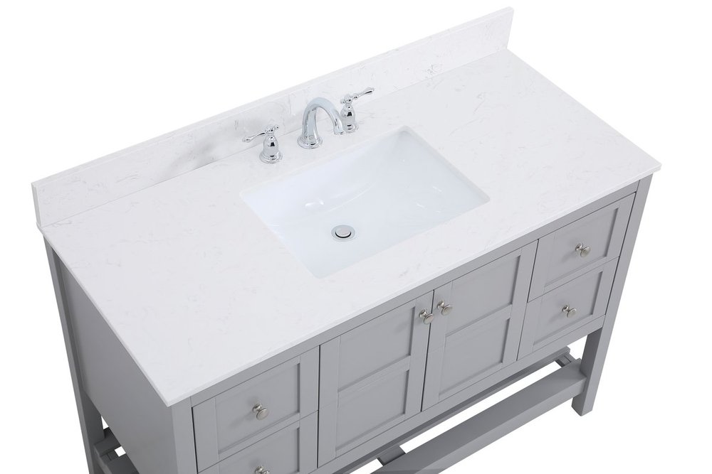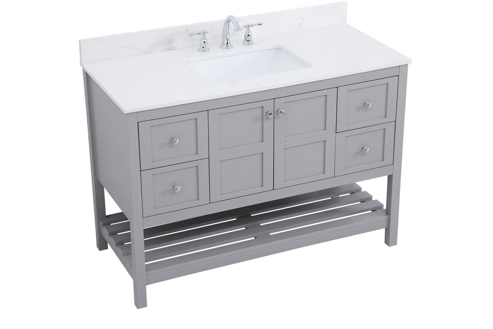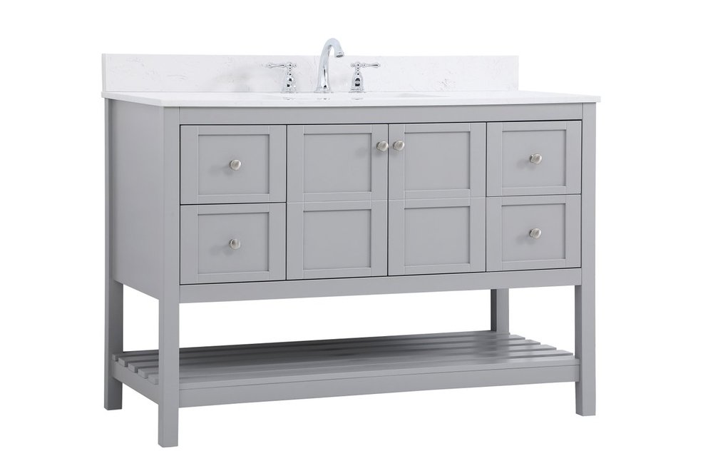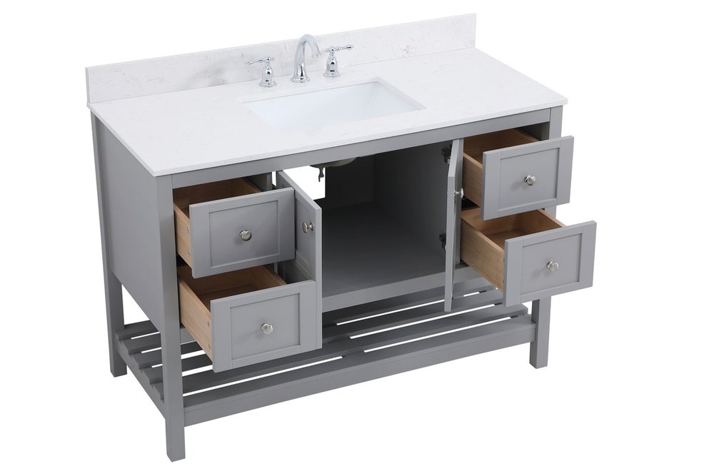 The subtle beauty of the Theo collection 48" vanity in a gray finish exudes comfortable luxury. Its modern, yet traditional beauty will surely dress up your bathroom or powder room without any fuss. The white stone countertop and porcelain undermount sink shows quiet opulence, and the legs support upright without fail. Brushed Nickel hardware complements the trendy gray finish, with pulls adorning the two cabinet doors and four drawers, showcasing ample storage space within. Slated shelf allows for additional space to organize your towels. Whether this vanity is in your bathroom or for guests, its presence will surely elevate the aesthetics of your room. Comes with a matching backsplash to complete the look and protects your wall.