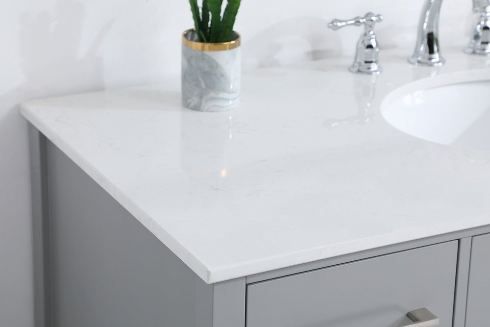 Never compromise beauty--the Irene collection stunning vanity in a gray finish will add lovely sophistication and complement any bathroom or powder room, while utilizing its charm and function to provide you with ample storage spaces. Brushed nickel pulls gently adorn the minimalist cabinet doors and drawers at the base, allowing for you to store away your bathroom essentials. The calacatta engineered marble countertop, porcelain undermount sink, dignified subtle engravings on the side edges, and squared legs all come together to create contemporary beauty. Work with your space, and design a beautiful room, no matter the size.