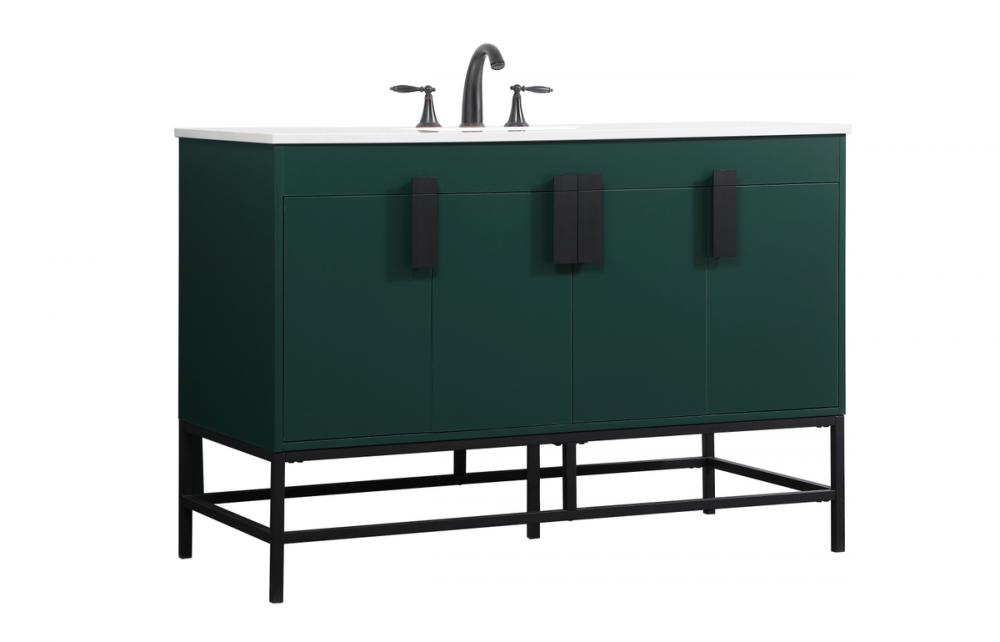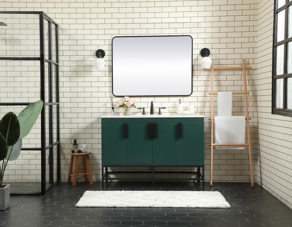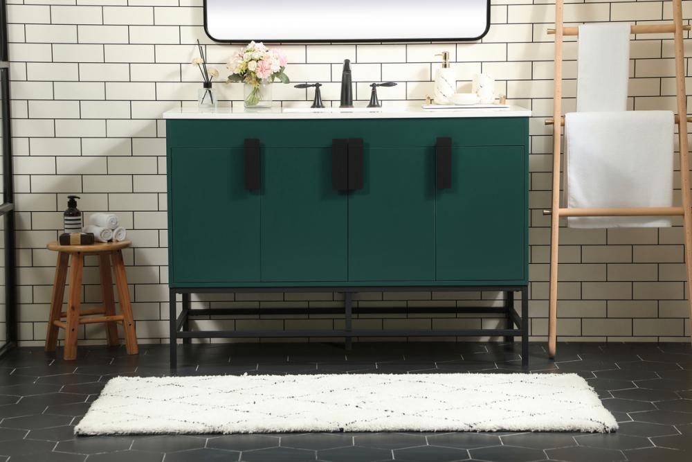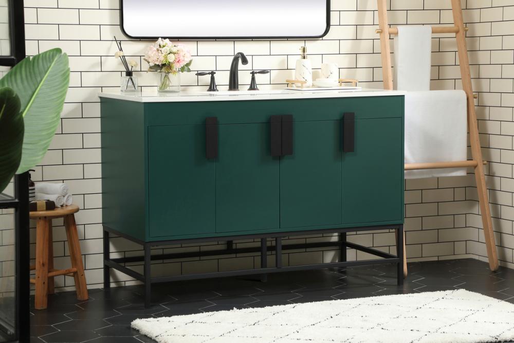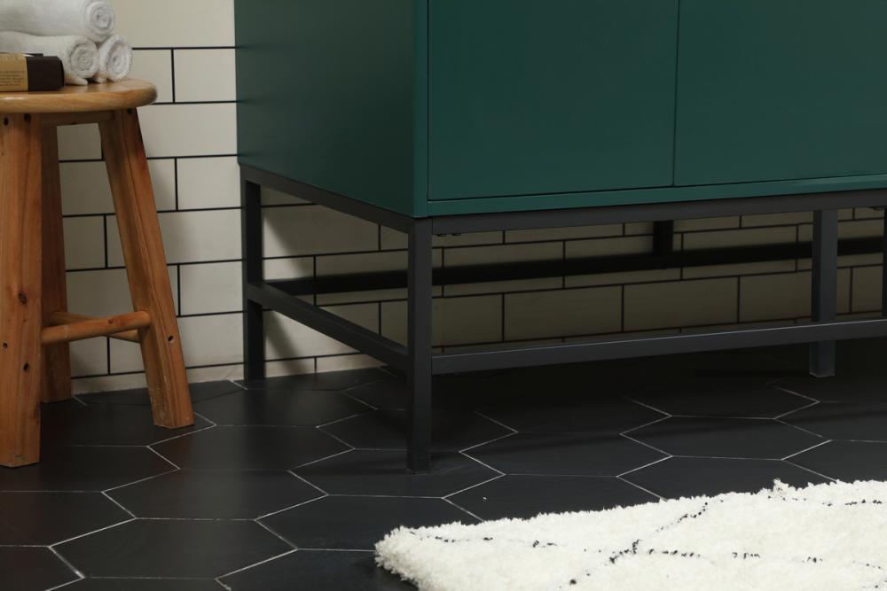 This vanity is a sleek-looking piece of bathroom furniture that is easy to incorporate into your design scheme. The cabinet features a smooth door panel with an oversized steel handle and soft close hinges provide ample room for accessories. Constructed of engineered wood, the powder-coated metal rod legs are an urban industrial look that we love. Minor assembly of the metal legs needed to get this vanity up and running.