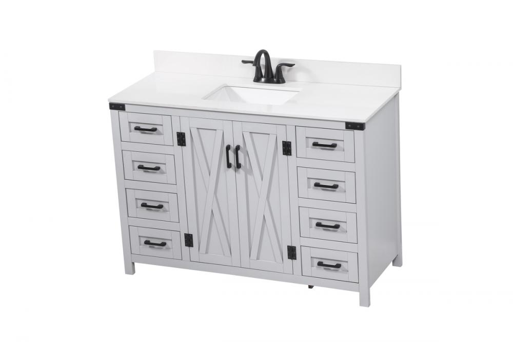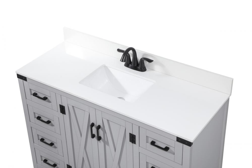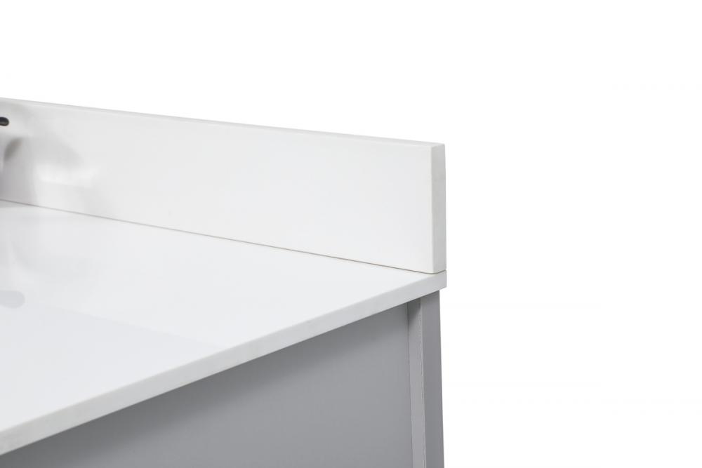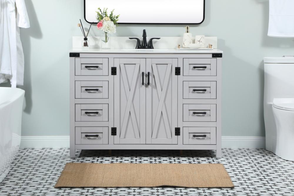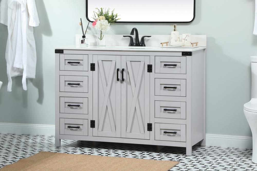Reminiscent of barn doors, the two door cabinet and eight drawers adds both stylistic charm and function with its plethora of storage options for all your bathroom essentials. Whether for your bathroom or the guests', everyone will marvel at its classic look for traditional and farmhouse aesthetics. A slab of engineered marble rounds out the piece up top, as well as the porcelain under mount sink and predrilled faucet holes. This vanity arrives fully assembled. Comes with a matching backsplash to complete the look and protects your wall.