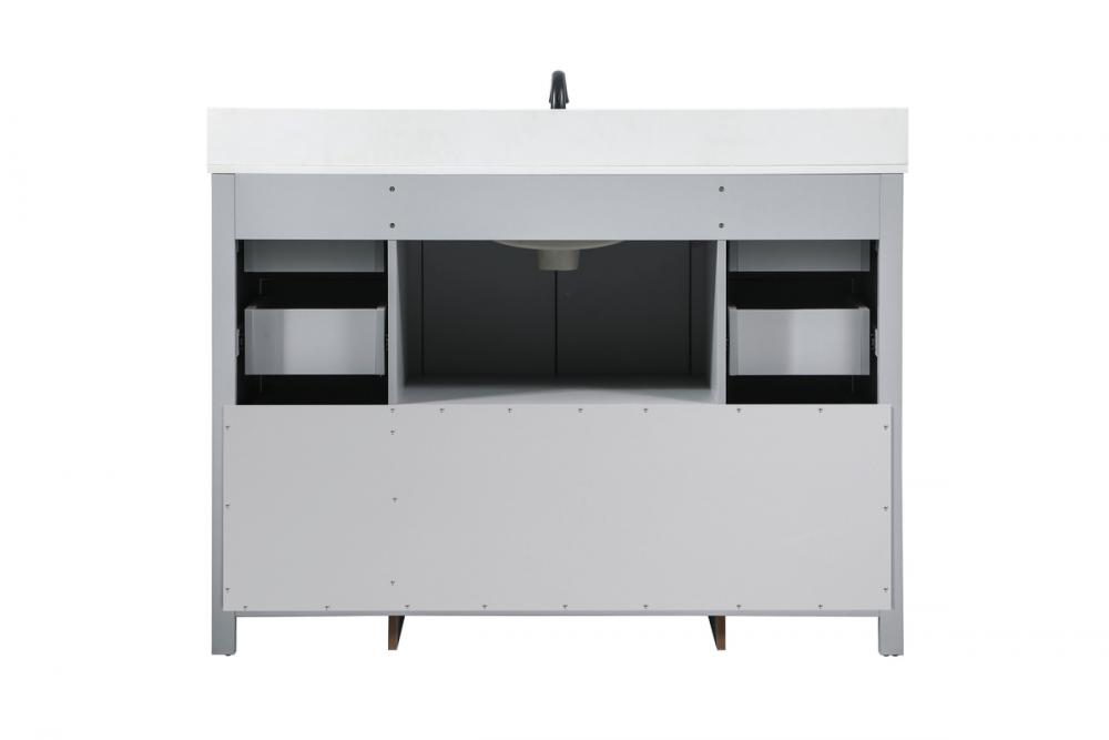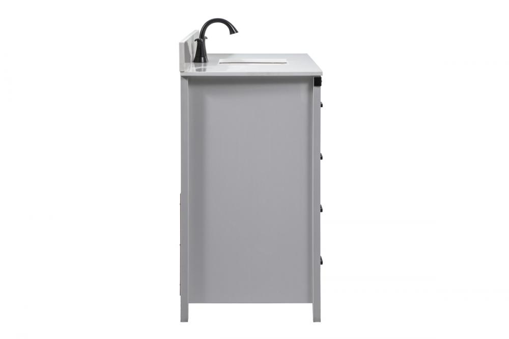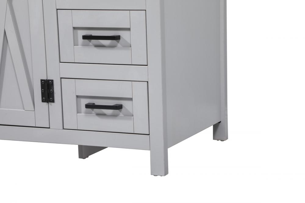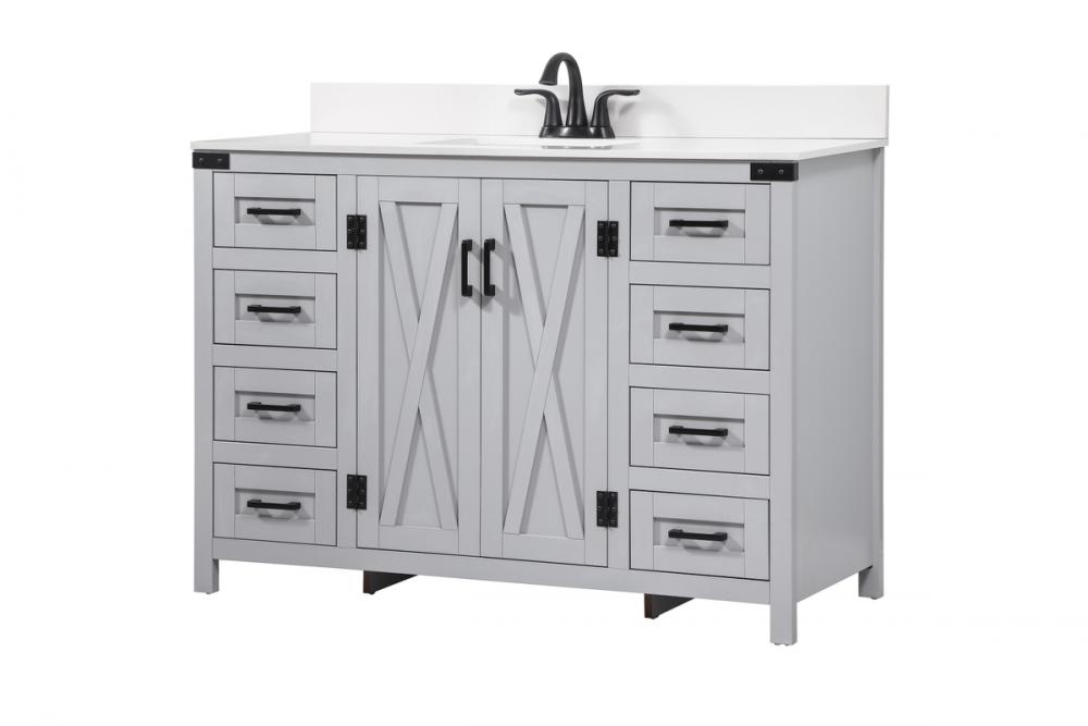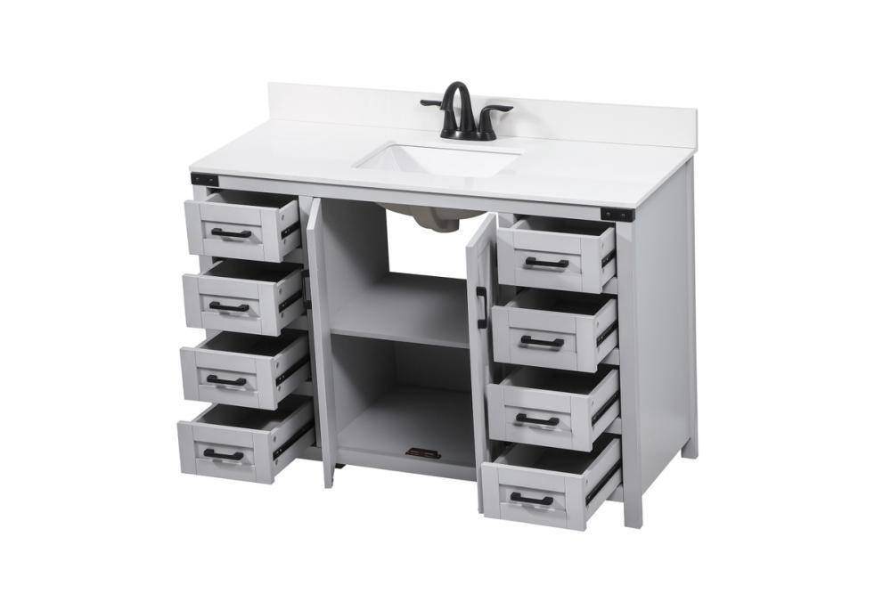 Reminiscent of barn doors, the two door cabinet and eight drawers adds both stylistic charm and function with its plethora of storage options for all your bathroom essentials. Whether for your bathroom or the guests', everyone will marvel at its classic look for traditional and farmhouse aesthetics. A slab of engineered marble rounds out the piece up top, as well as the porcelain under mount sink and predrilled faucet holes. This vanity arrives fully assembled. Comes with a matching backsplash to complete the look and protects your wall.