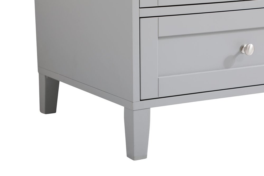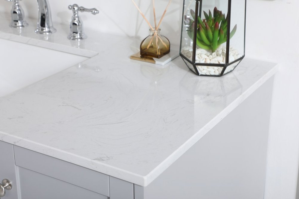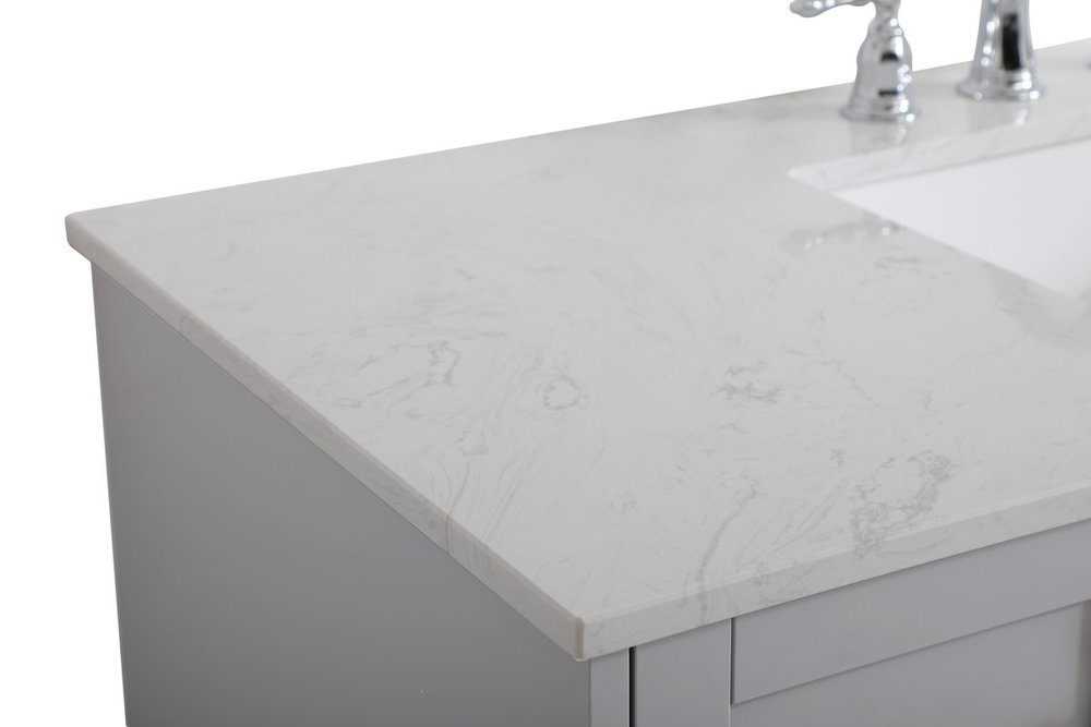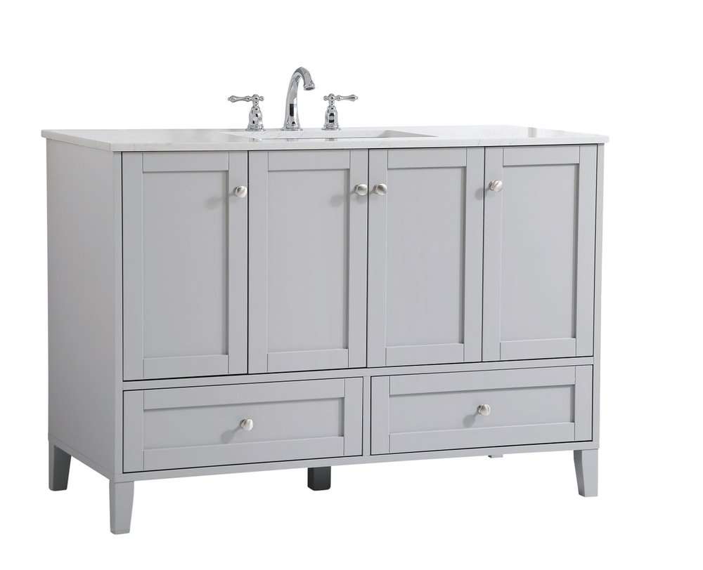 While unassuming, this 48" vanity in a grey finish sure knows how to redefine luxury. The sleek brushed nickel knobs adorn the 4 cabinet doors and 2 bottom drawers which allow you to store your bathroom toiletries and necessities. Standing strong on oblique legs and dressed with a Calacatta engineered marble countertop, this vanity will surely create beauty and casual elegance in your bathroom or powder room.