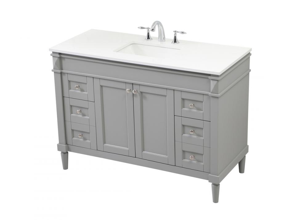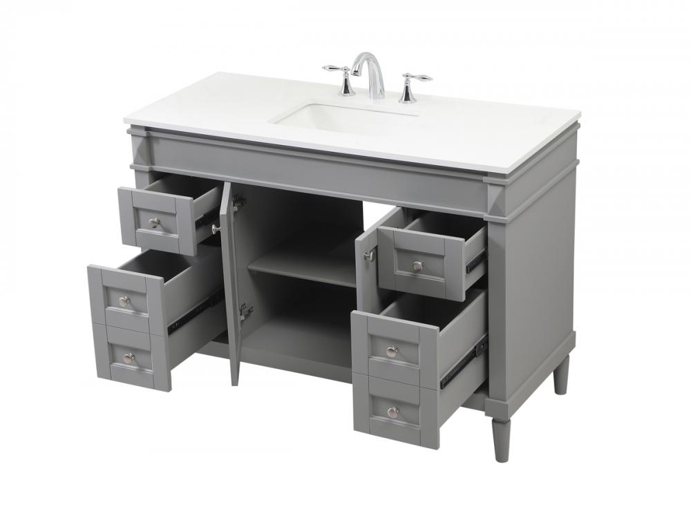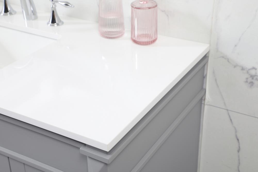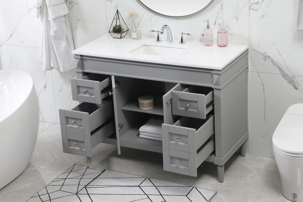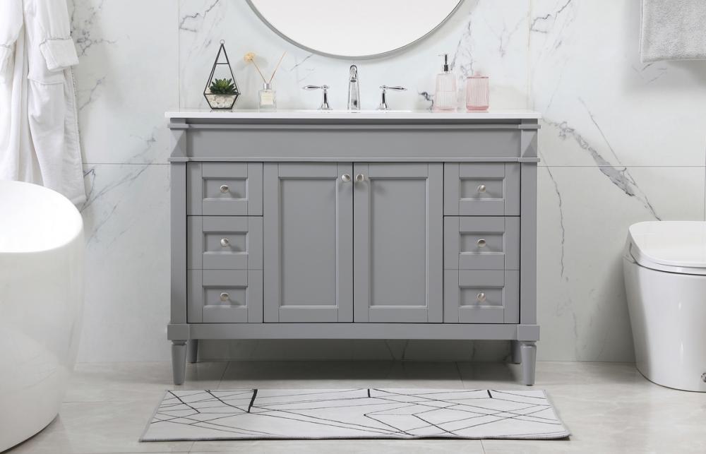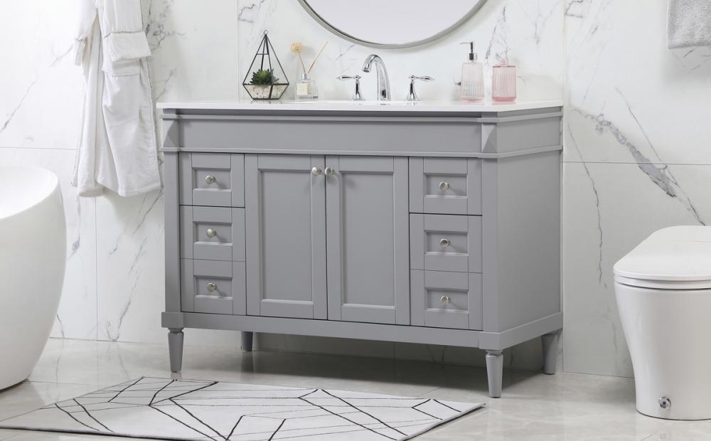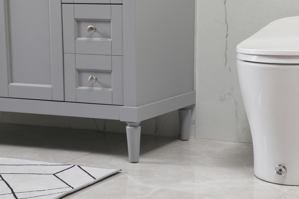This transitional vanity is a beautiful piece of bathroom furniture will look amazing in your design scheme. The cabinet features a shaker style smooth door panel with simple round knobs and soft close hinges provide ample room for accessories. Packed with multiple side drawers with soft close glides for added comfort and full access to bath supplies. Convenient deep drawer stores all of your tall bath essentials. Constructed of engineered wood and solid wood legs with hand painted finish. The durable engineered marble countertop is a versatile material in an ivory white finish. Minor assembly of the legs needed to get this vanity up and running.