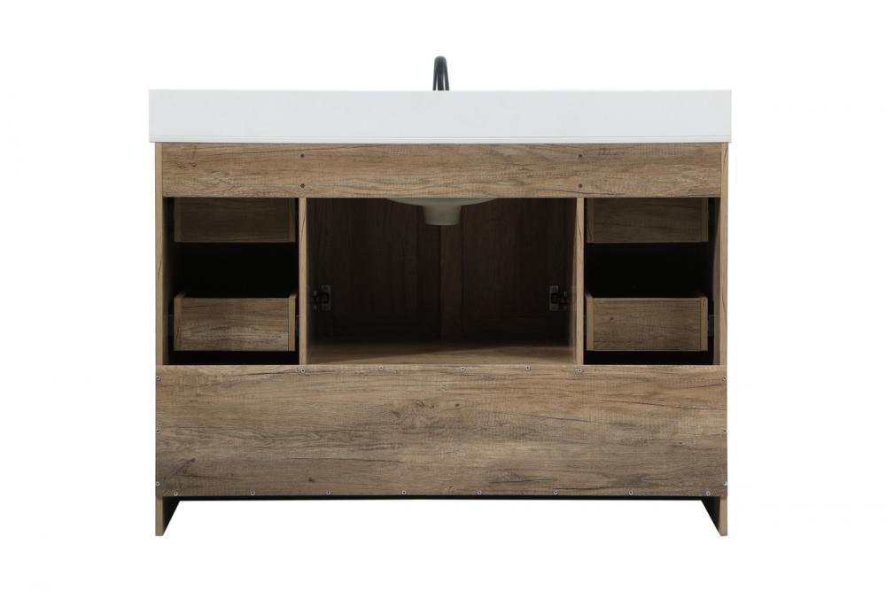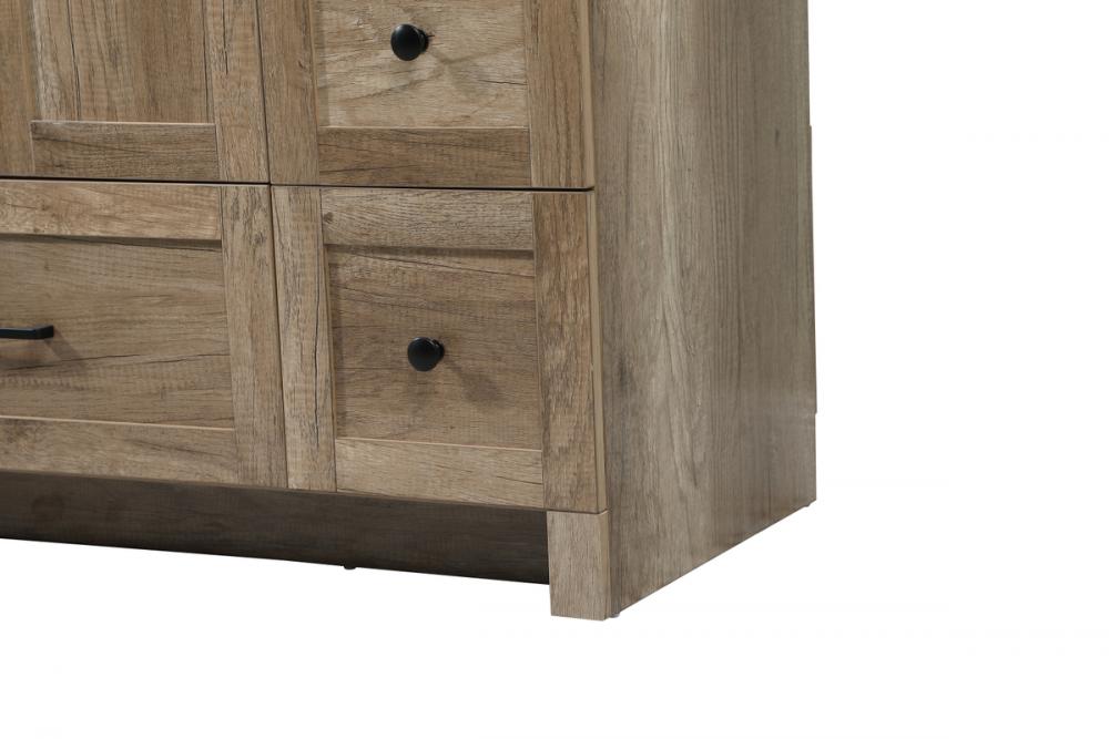 Delve into a world of minimalistic fashion and contemporary styling with this farmhouse 48" vanity. The clean faux lines anchors the weathered design. Black handle adorns the two doors hiding the base of the integrated porcelain sink while the bottom drawer and side drawers allow you to store your bathroom necessities and toiletries. It is the perfect vanity for any bathroom, regardless of size. Comes with a matching backsplash to complete the look and protects your wall.