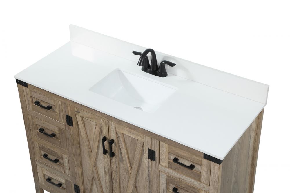 Reminiscent of barn doors, the two door cabinet and eight drawers adds both stylistic charm and function with its plethora of storage options for all your bathroom essentials. Whether for your bathroom or the guests', everyone will marvel at its classic look for traditional and farmhouse aesthetics. A slab of engineered marble rounds out the piece up top, as well as the porcelain under mount sink and predrilled faucet holes. This vanity arrives fully assembled. Comes with a matching backsplash to complete the look and protects your wall.