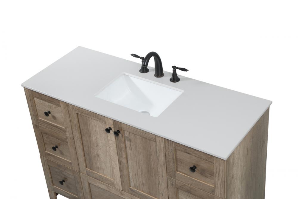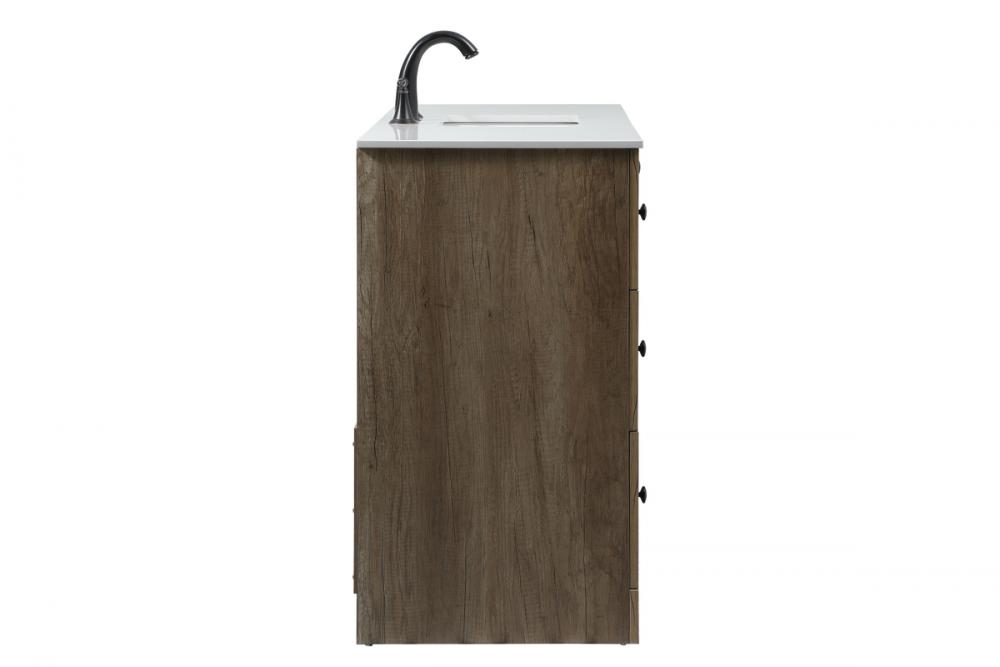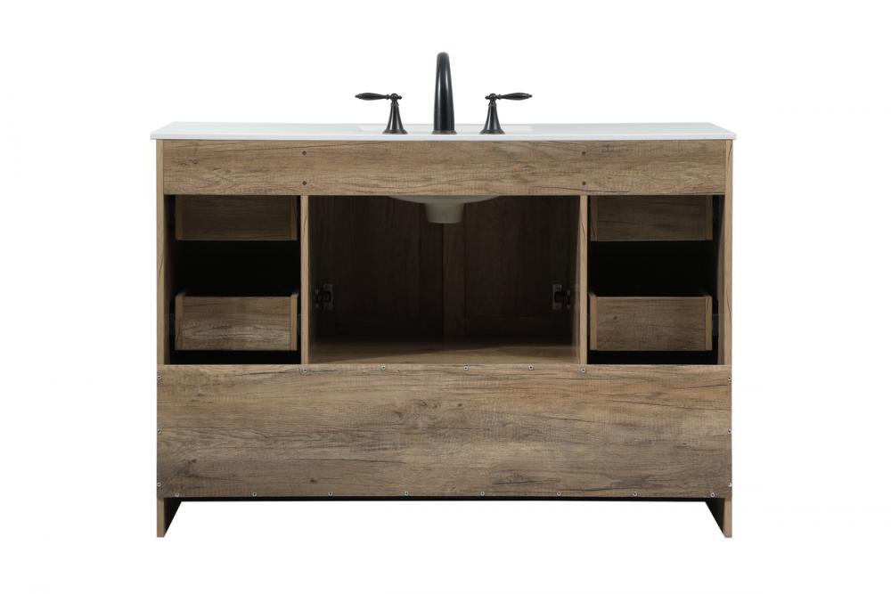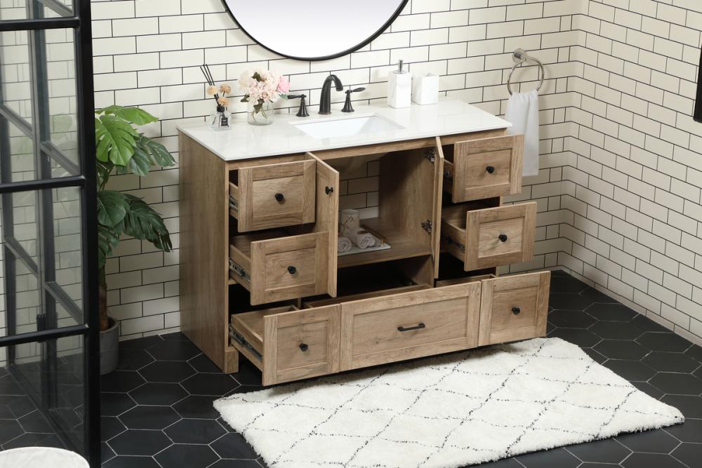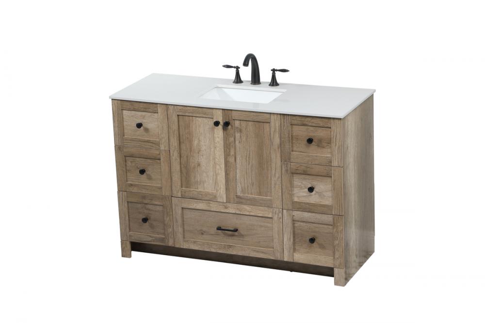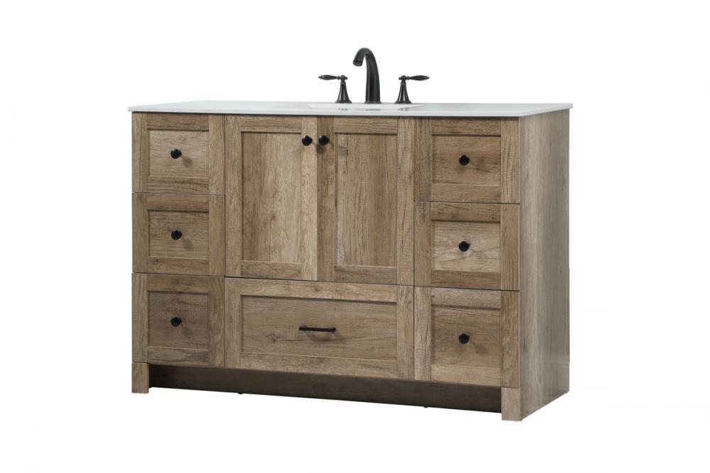 Delve into a world of minimalistic fashion and contemporary styling with this farmhouse 48" vanity. The clean faux lines anchors the weathered design. Black handle adorns the two doors hiding the base of the integrated porcelain sink while the bottom drawer and side drawers allow you to store your bathroom necessities and toiletries. It is the perfect vanity for any bathroom, regardless of size.