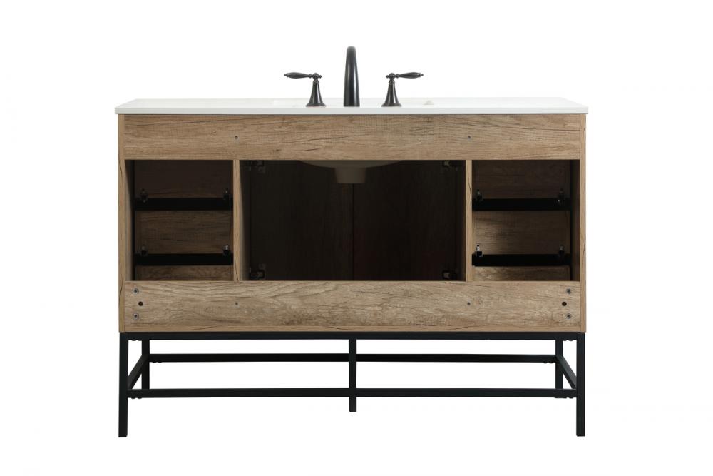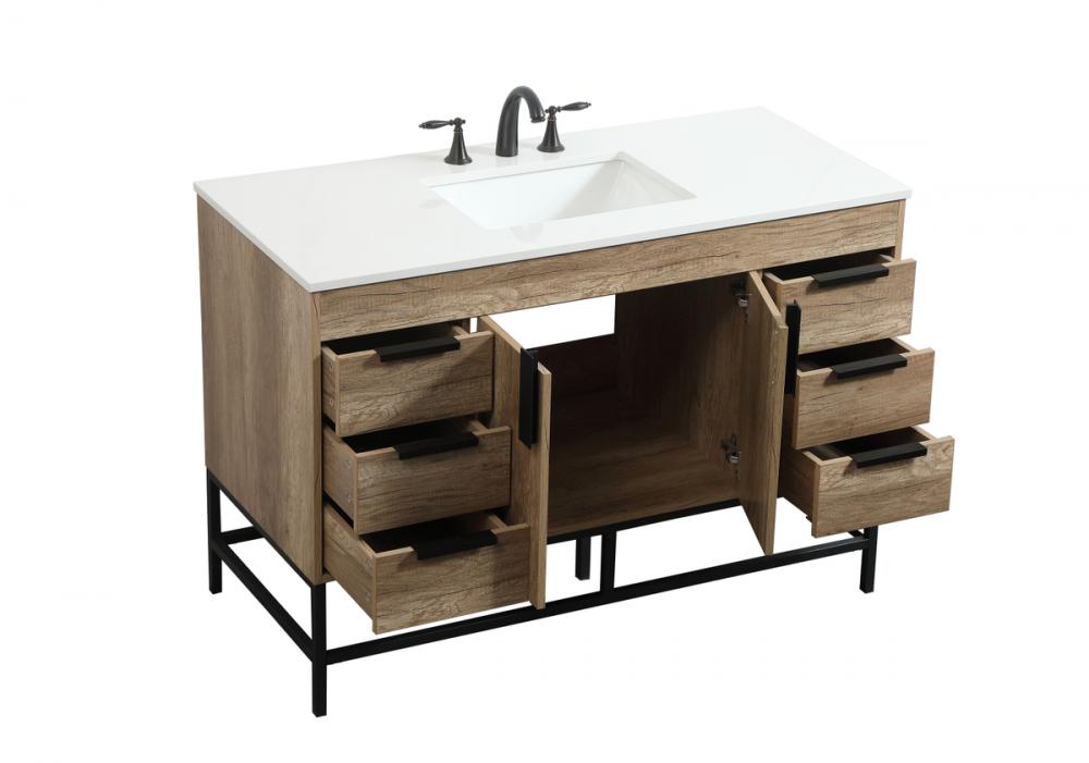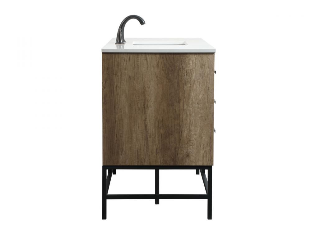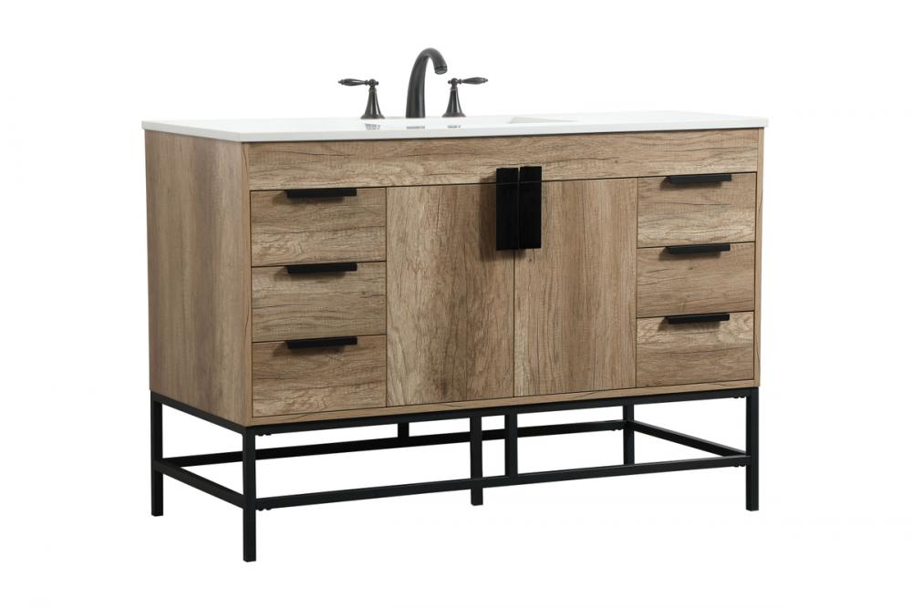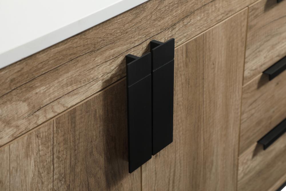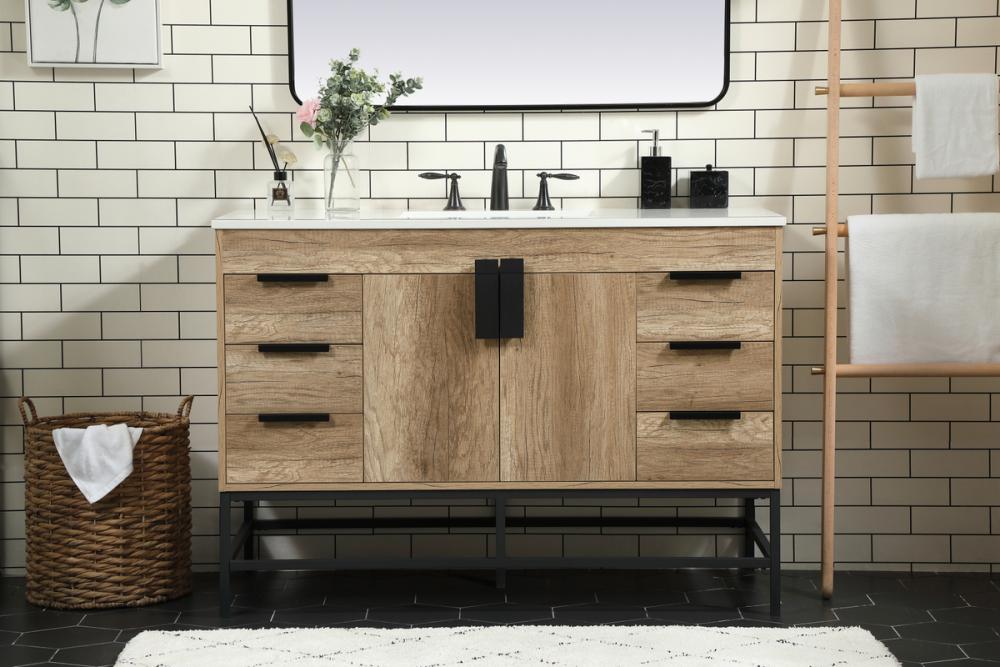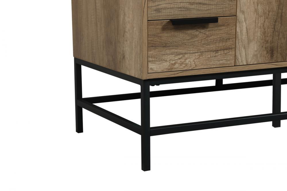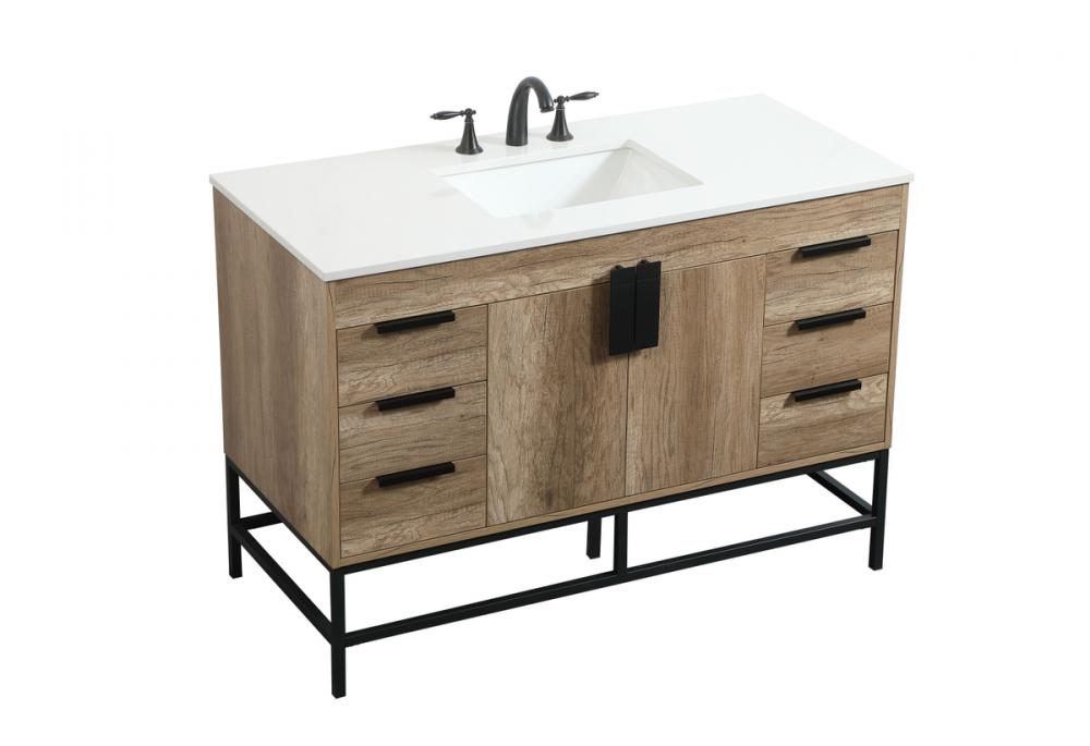 This vanity is a sleek-looking piece of bathroom furniture that is easy to incorporate into your design scheme. The cabinet features a smooth door panel with an oversized steel handle and soft close hinges provide ample room for accessories. Packed with multiple side drawers with soft close glides for added comfort and full access to bath supplies. Constructed of engineered wood, the powder-coated metal rod legs are an urban industrial look that we love. Minor assembly of the metal legs needed to get this vanity up and running. Comes with a matching backsplash to complete the look and protects your wall.