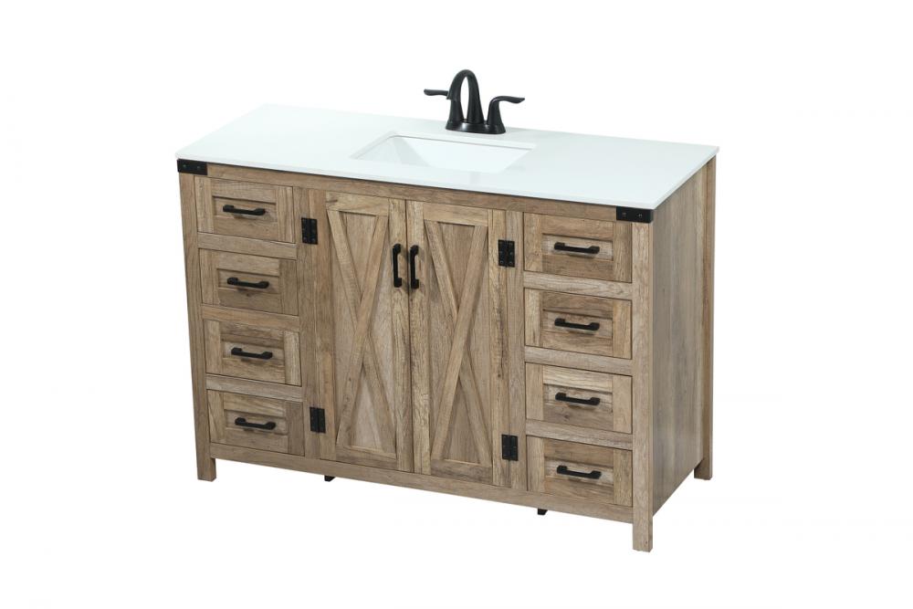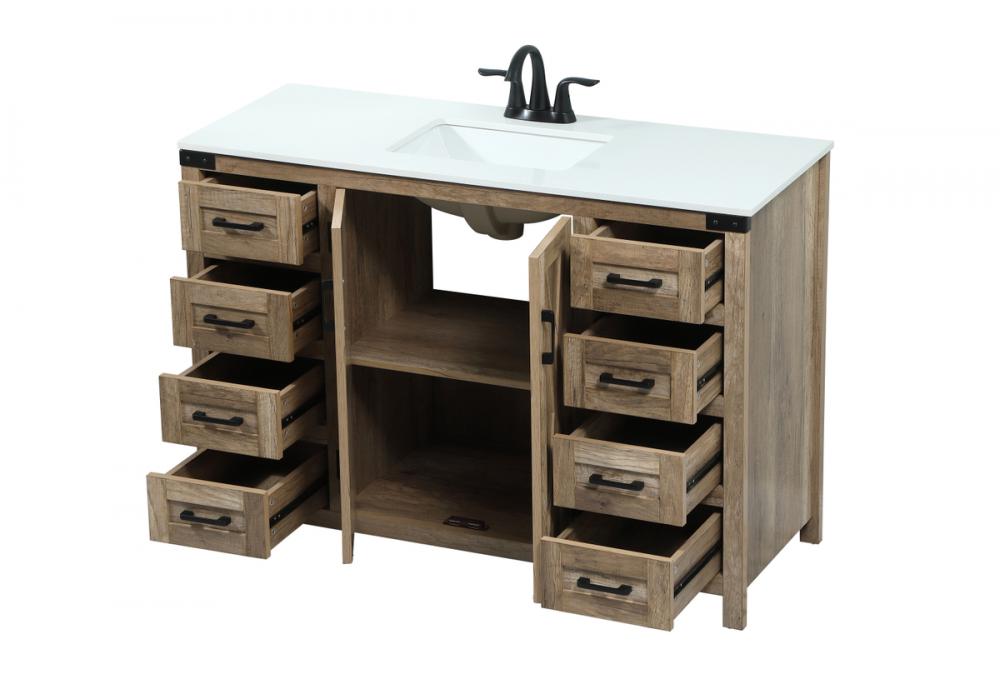 Reminiscent of barn doors, the two door cabinet and eight drawers adds both stylistic charm and function with its plethora of storage options for all your bathroom essentials. Whether for your bathroom or the guests', everyone will marvel at its classic look for traditional and farmhouse aesthetics. A slab of engineered marble rounds out the piece up top, as well as the porcelain under mount sink and predrilled faucet holes. This vanity arrives fully assembled.