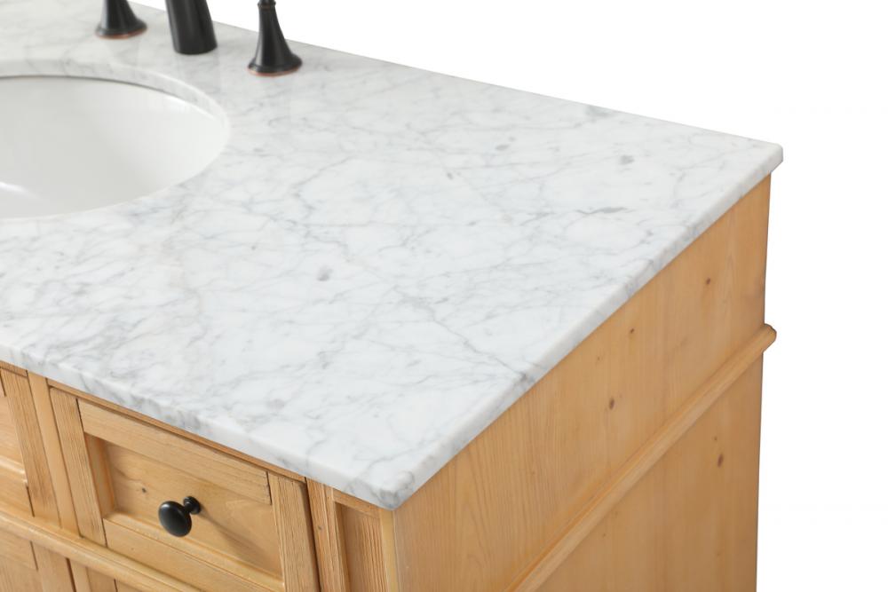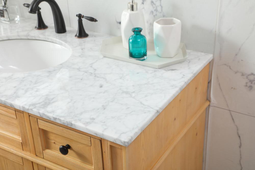 Comes with an undermount porcelain sink and a carrara white marble countertop