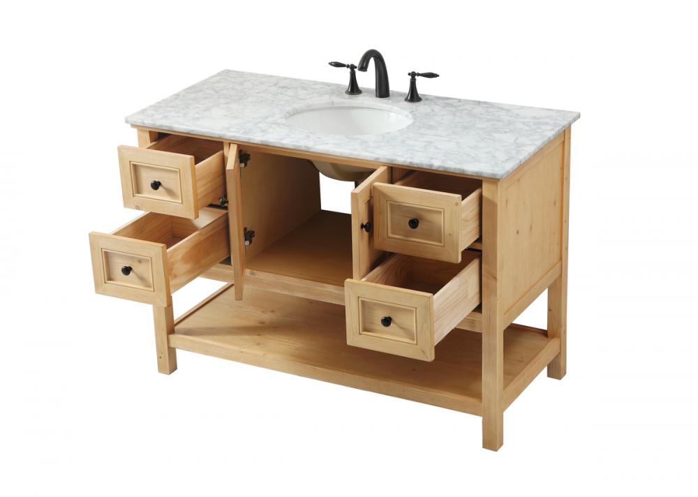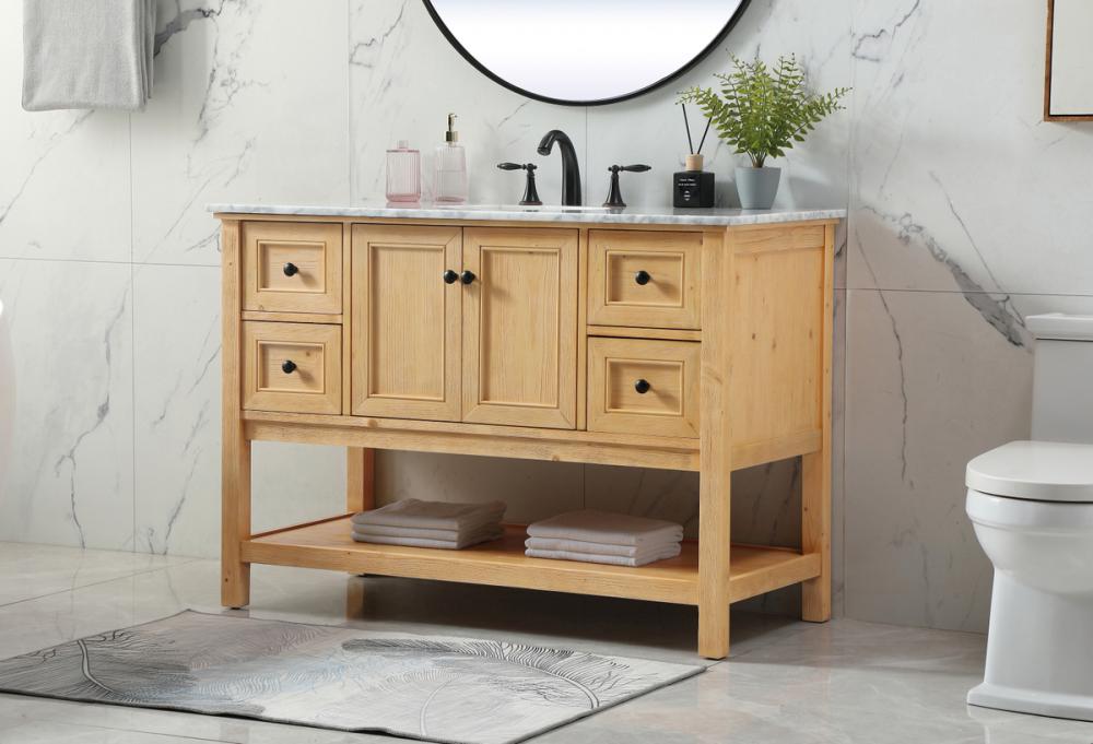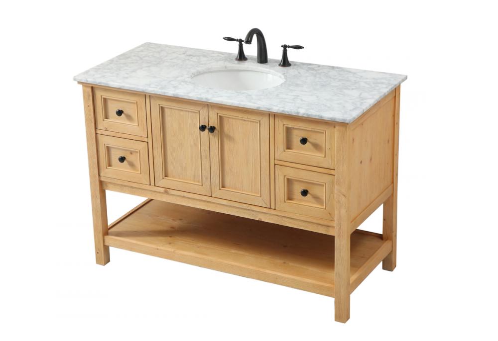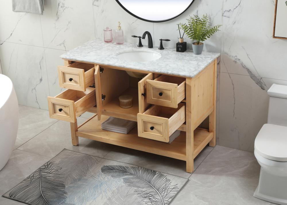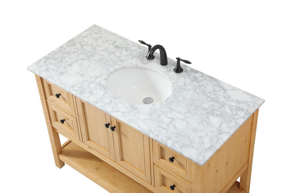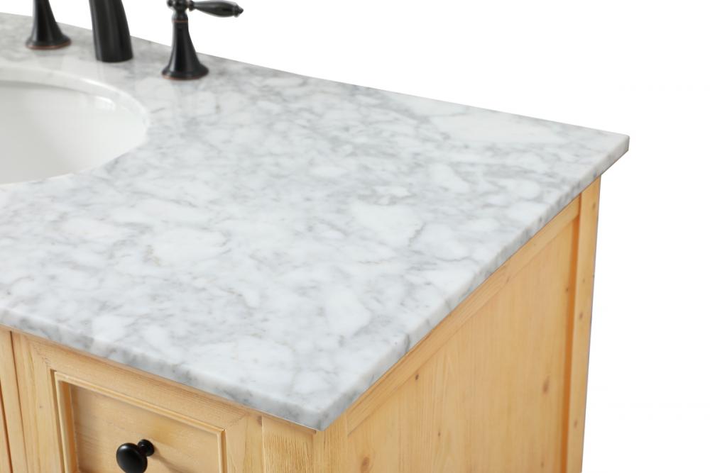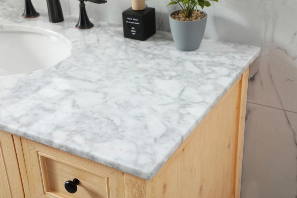 Comes with an undermount porcelain sink and a carrara white marble countertop