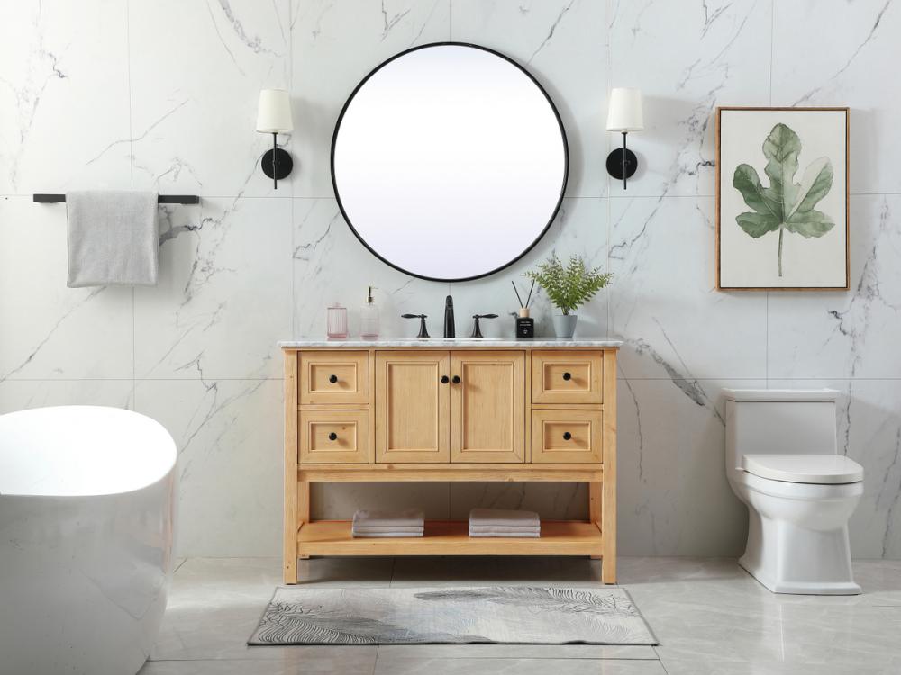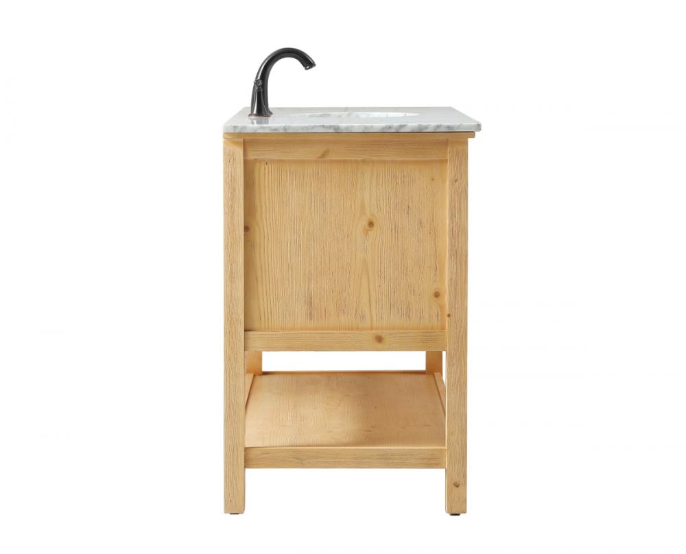 Clean lines and classic form can truly add a fresh look to your bathroom or powder room. This vanity, complemented by round hardware, will surely charm you with its confident style and subtle charisma. This vanity can store all of your bathroom toiletries, from extra towels to make up essentials. The vanity is crowned with carrara white marble and includes a porcelain undermount sink--adding both function and form that will truly amaze.