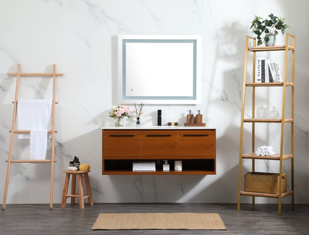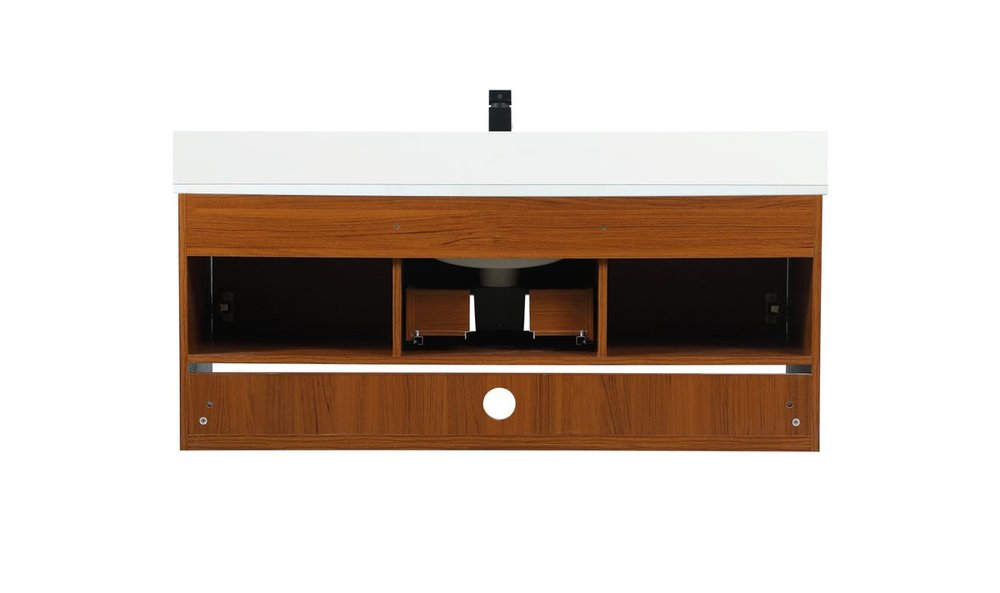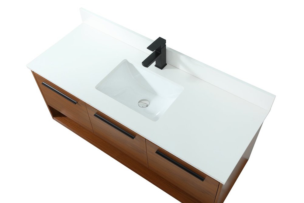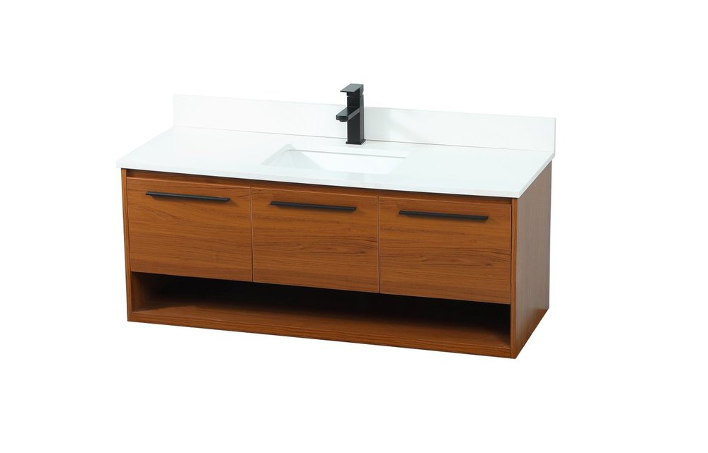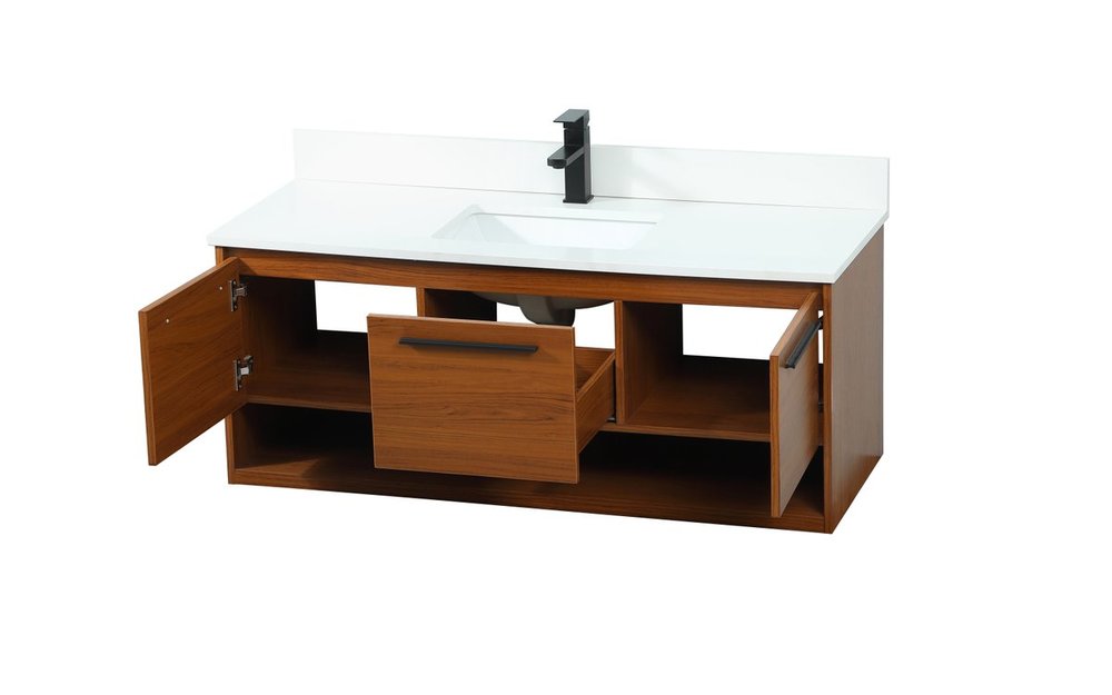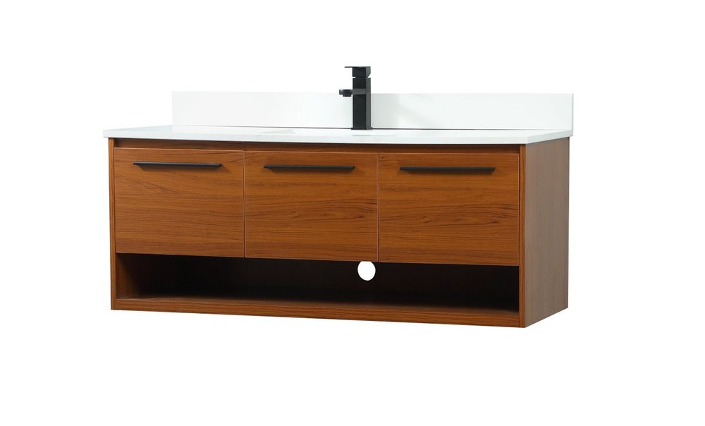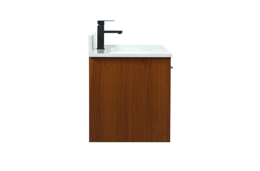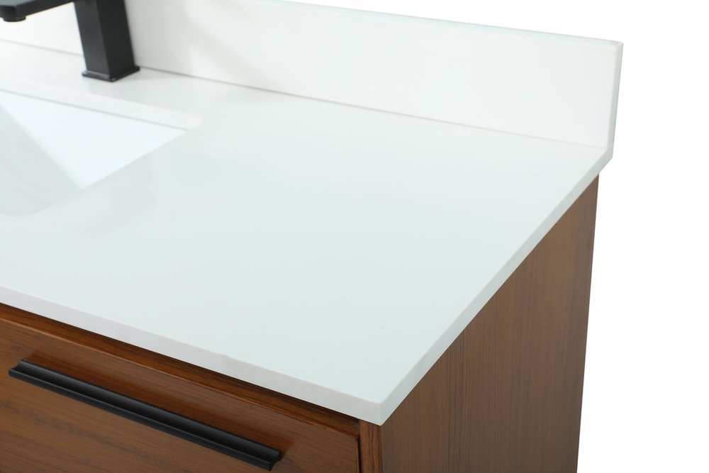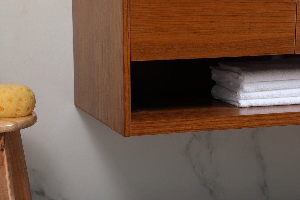 Save space and make your bathroom appear bigger with this floating vanity. Its minimal design will have you in awe, while its clean lines will leave your room feeling fresh and uncluttered. The Single u-drawer pulls out for storage while the open space below allows you to place extra towels or various other essentials. The ivory white engineered marble counter top with porcelain sink adds refined luxe while the aluminum barpull style handle adorn the vanity face. Comes with a matching backsplash to protect your walls.