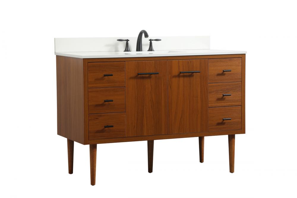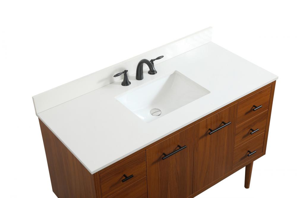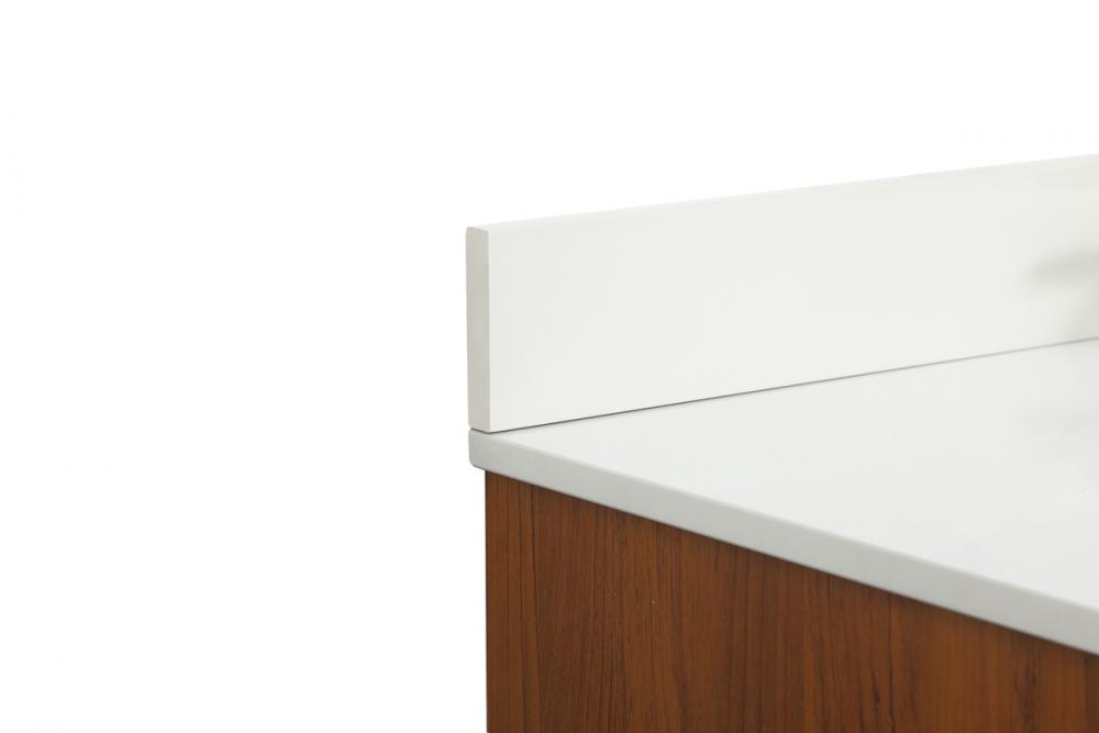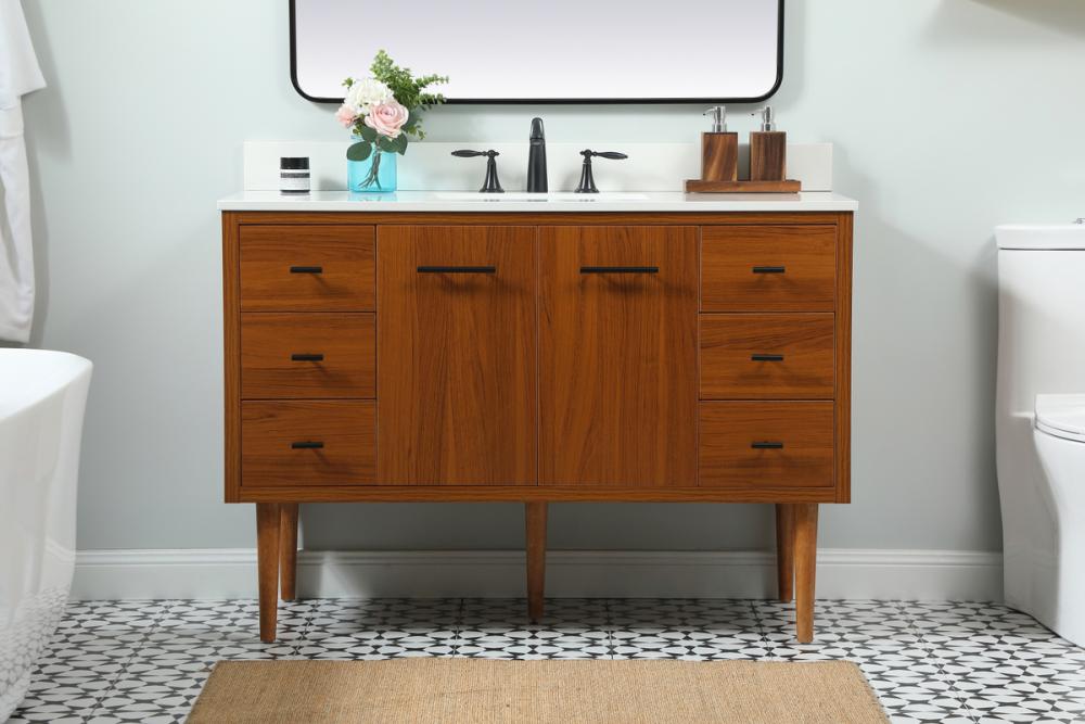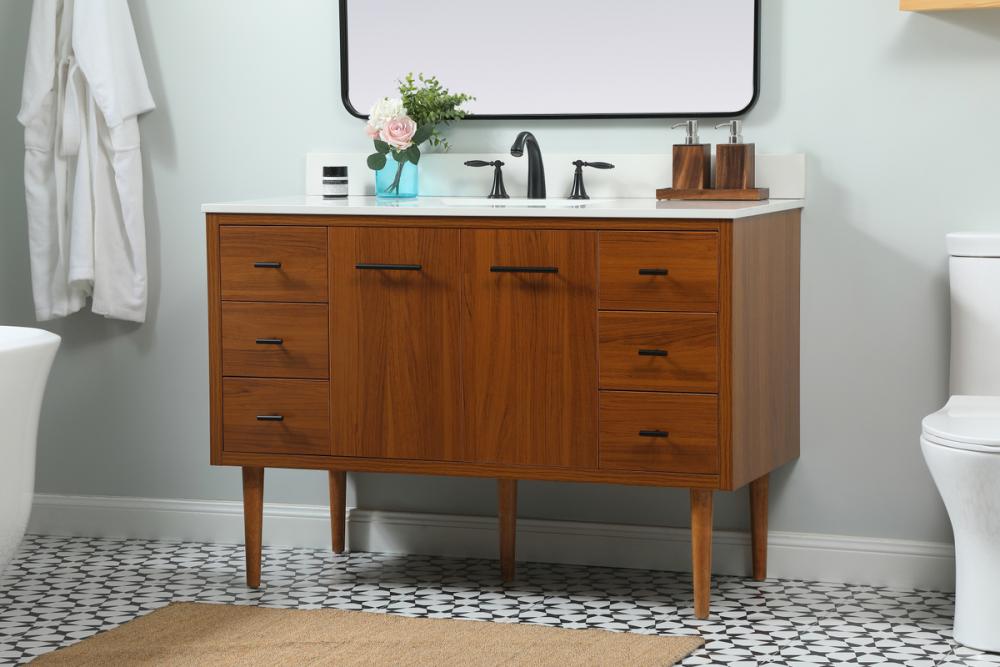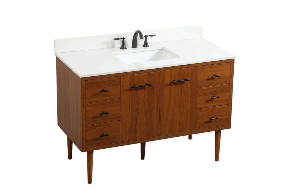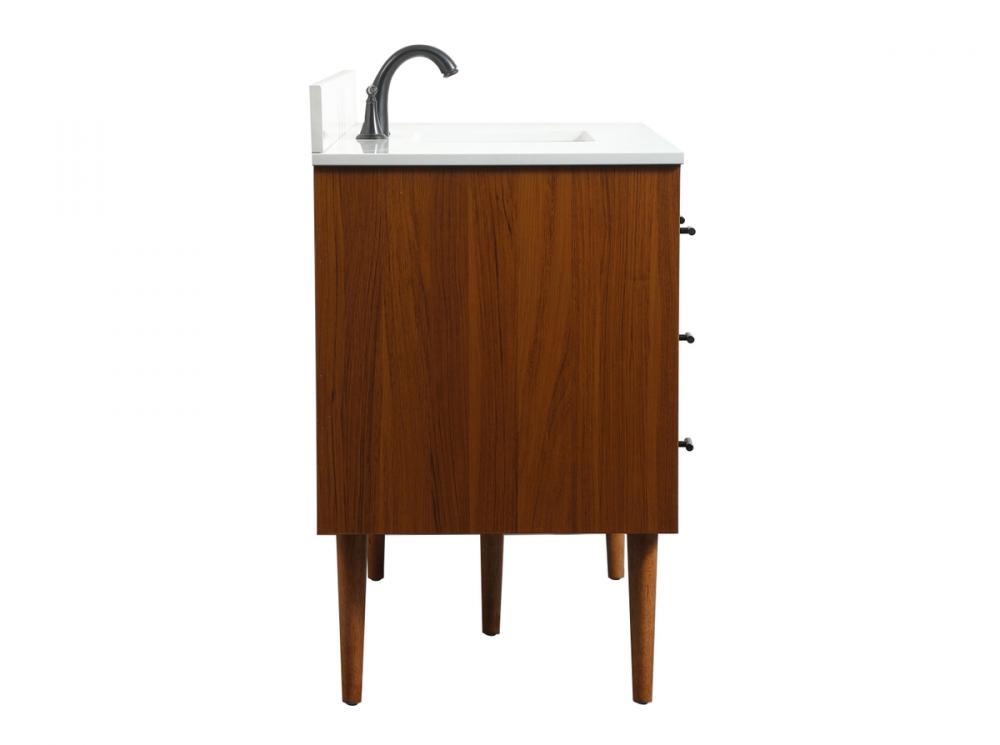 Delve into a world of minimalistic fashion and contemporary styling with this midcentury modern vanity. The clean lines anchors the design, while the straight tapered cylinder legs add subtle interest. Bar pull handle adorns the soft closing door hiding the base of the rectangular porcelain sink and letting you store your bathroom necessities and toiletries. Six soft closing drawers add plenty of storage option. Whether you want to use this as a floating vanity or a freestanding vanity, the choice is yours. The durable ivory white engineered marble countertop complements the manufactured wood base vanity and is built to last. Comes with a matching backsplash to complete the look and protects your wall.