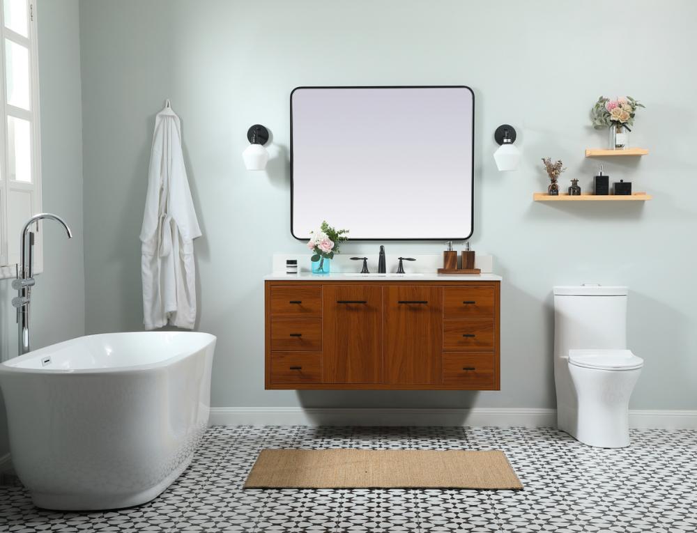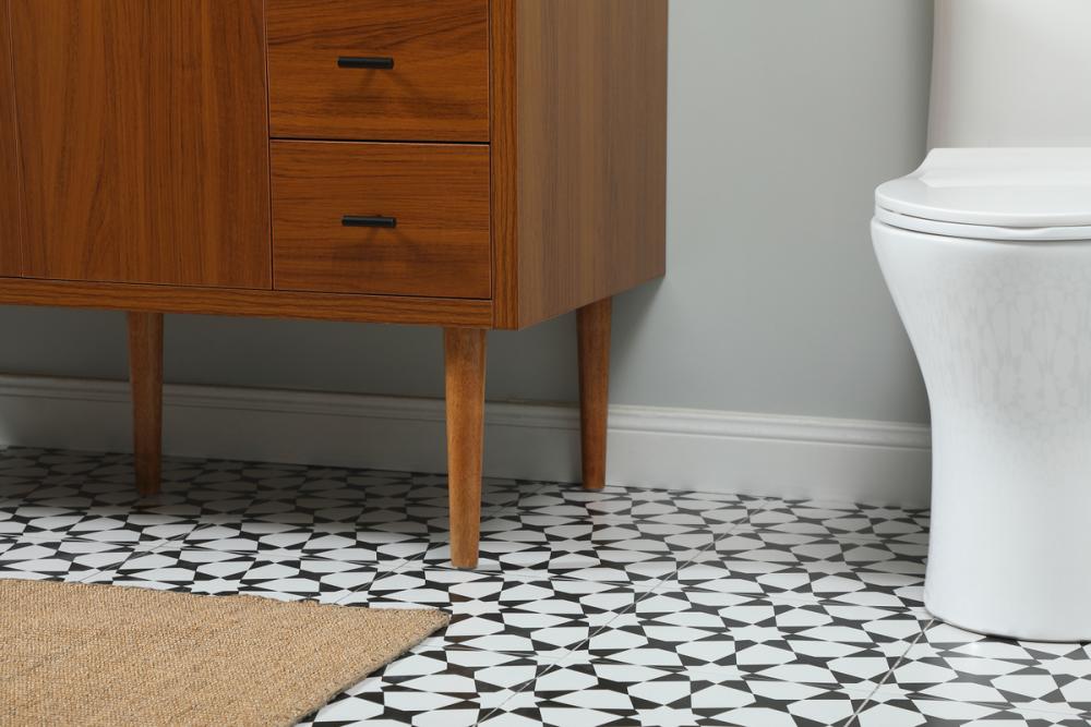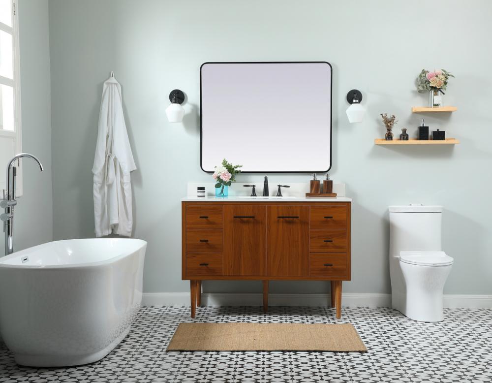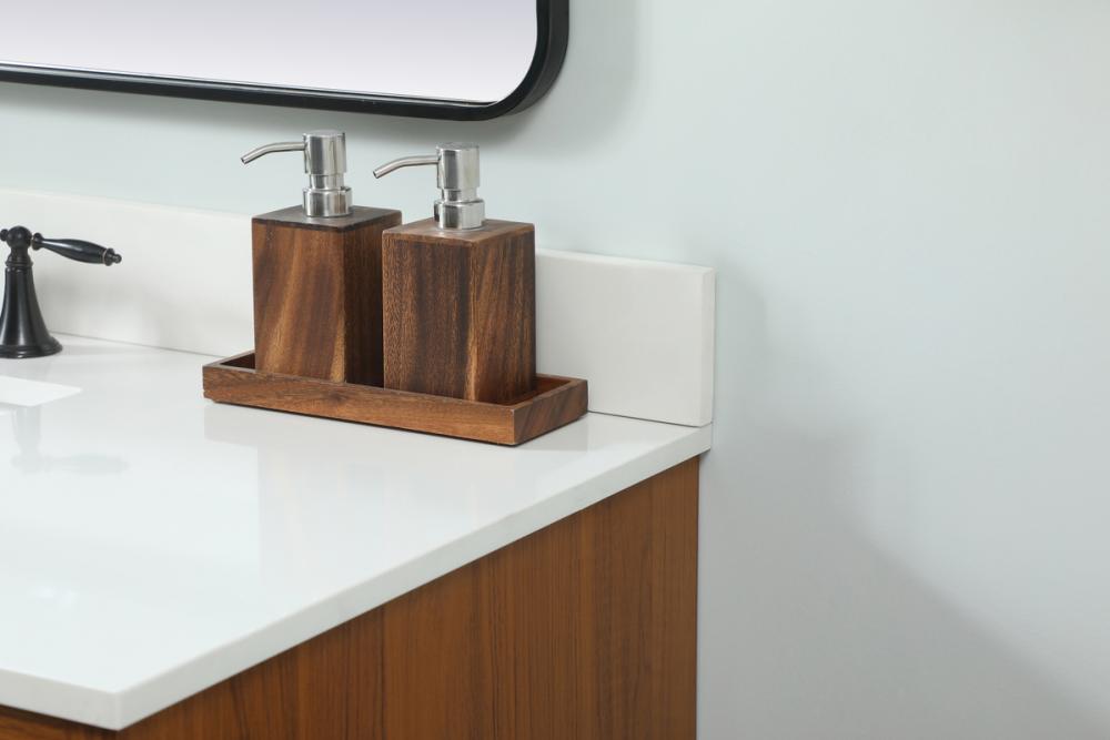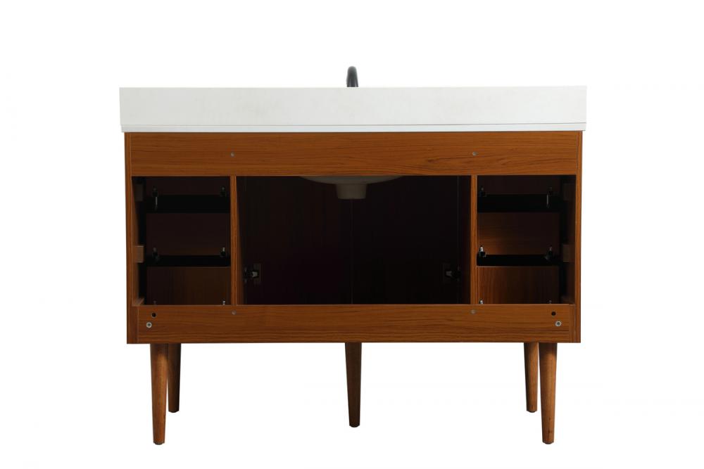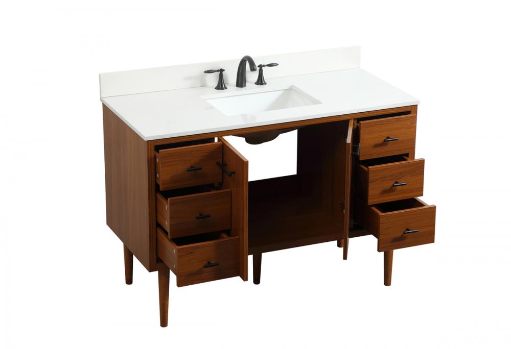 Delve into a world of minimalistic fashion and contemporary styling with this midcentury modern vanity. The clean lines anchors the design, while the straight tapered cylinder legs add subtle interest. Bar pull handle adorns the soft closing door hiding the base of the rectangular porcelain sink and letting you store your bathroom necessities and toiletries. Six soft closing drawers add plenty of storage option. Whether you want to use this as a floating vanity or a freestanding vanity, the choice is yours. The durable ivory white engineered marble countertop complements the manufactured wood base vanity and is built to last. Comes with a matching backsplash to complete the look and protects your wall.