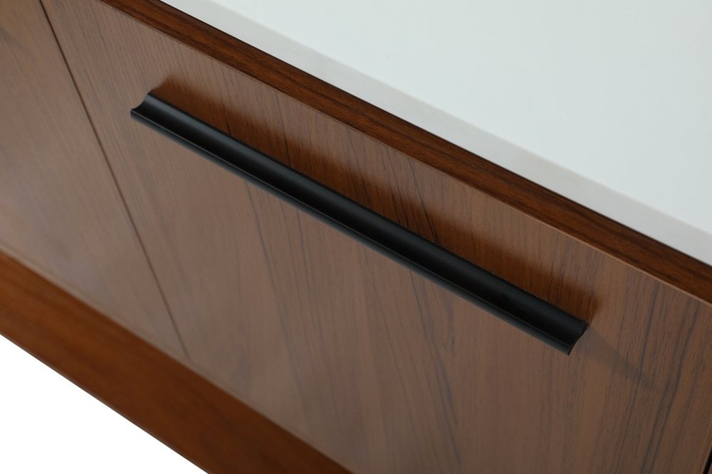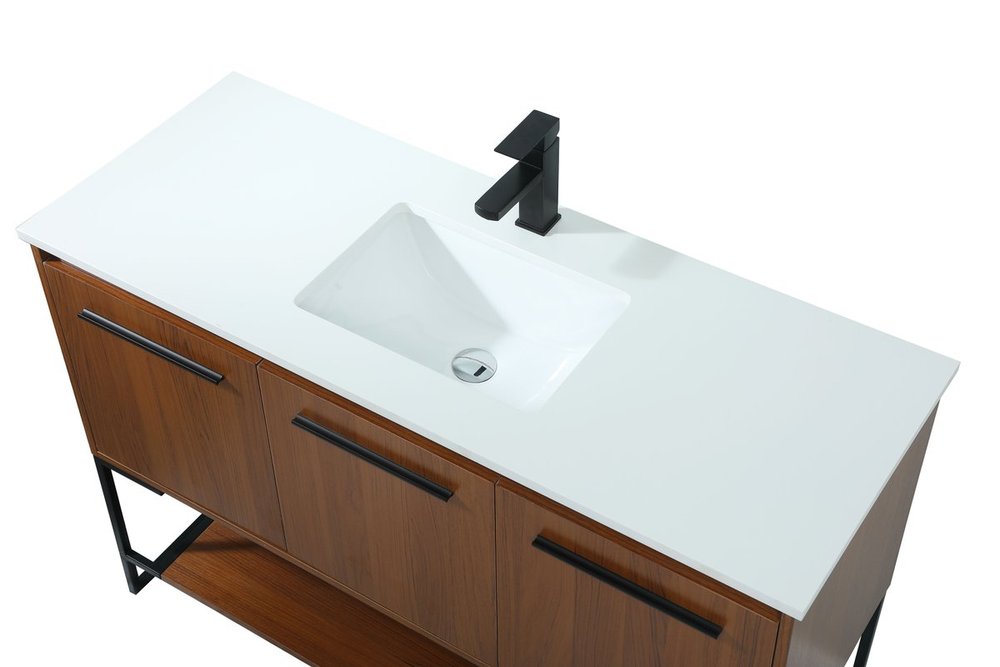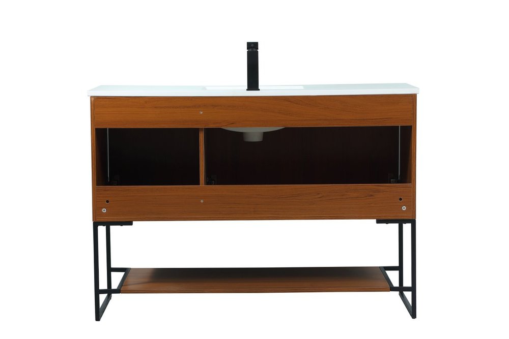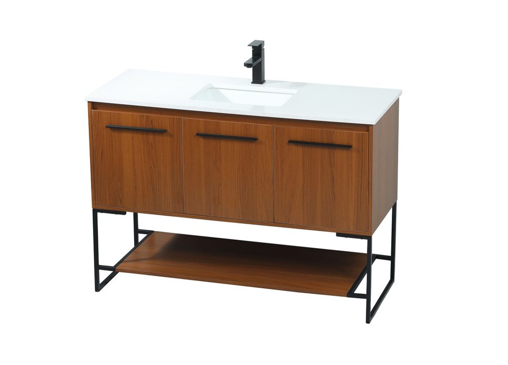 Live in modern comfort with this 48" teak finish vanity. Dressed in a teak and sleek black metal hardware, its contemporary style will have your bathroom or powder room elevated in industrial sophistication. The open shelf at the base and three doors reveal ample storage space for your bathroom essentials and miscellany. Clean lines create its own visual interest, adding trendy looks to your already chic room.