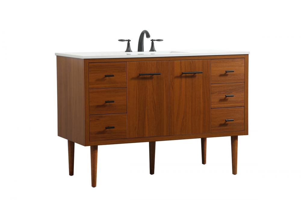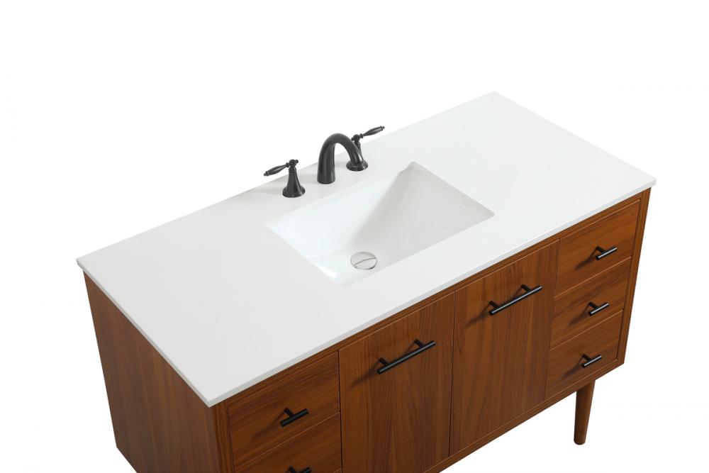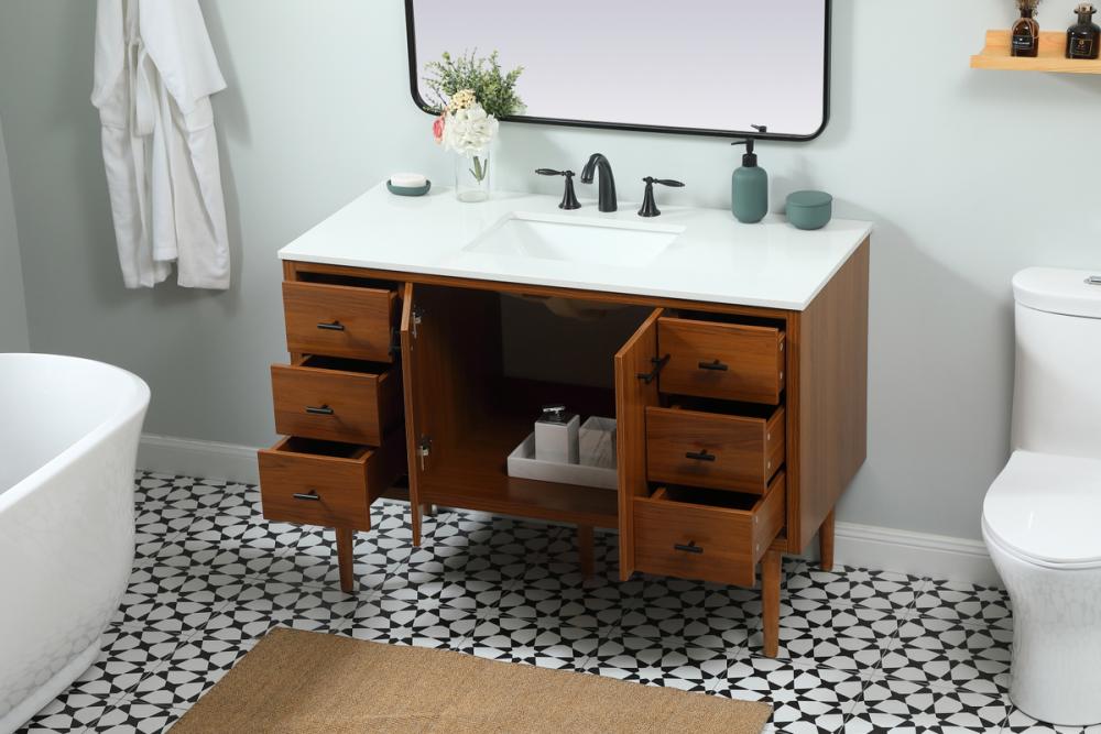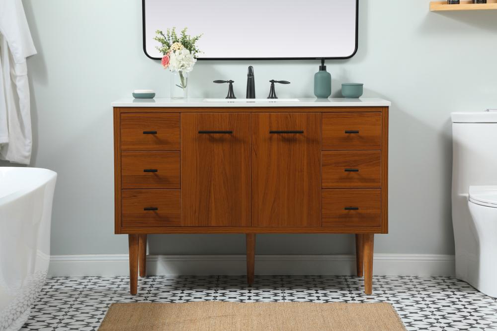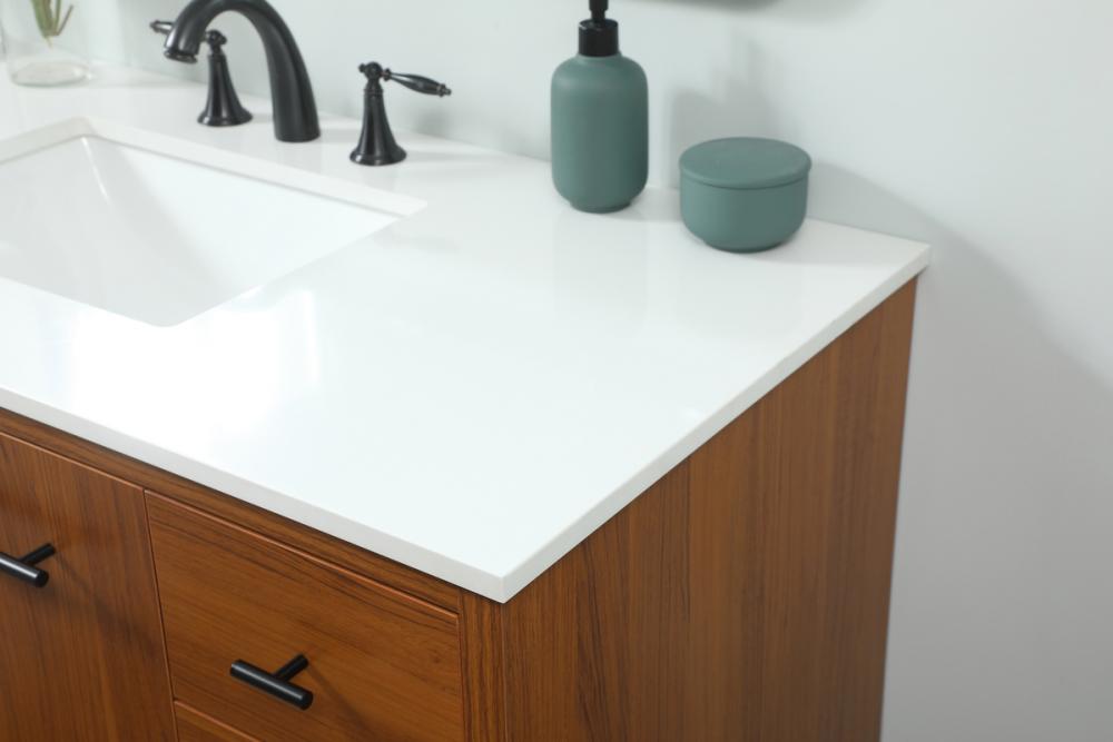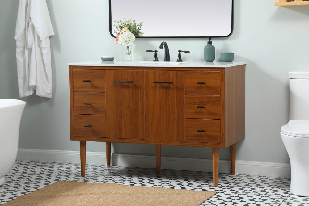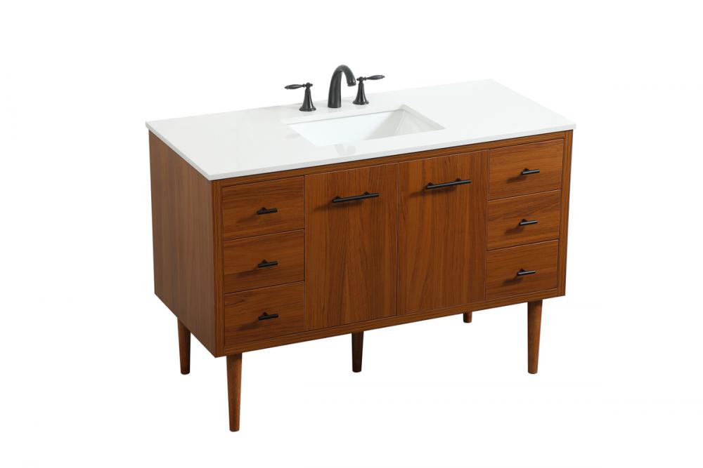 Delve into a world of minimalistic fashion and contemporary styling with this midcentury modern vanity. The clean lines anchors the design, while the straight tapered cylinder legs add subtle interest. Bar pull handle adorns the soft closing door hiding the base of the rectangular porcelain sink and letting you store your bathroom necessities and toiletries. Six soft closing drawers add plenty of storage option. Whether you want to use this as a floating vanity or a freestanding vanity, the choice is yours. The durable ivory white engineered marble countertop complements the manufactured wood base vanity and is built to last.