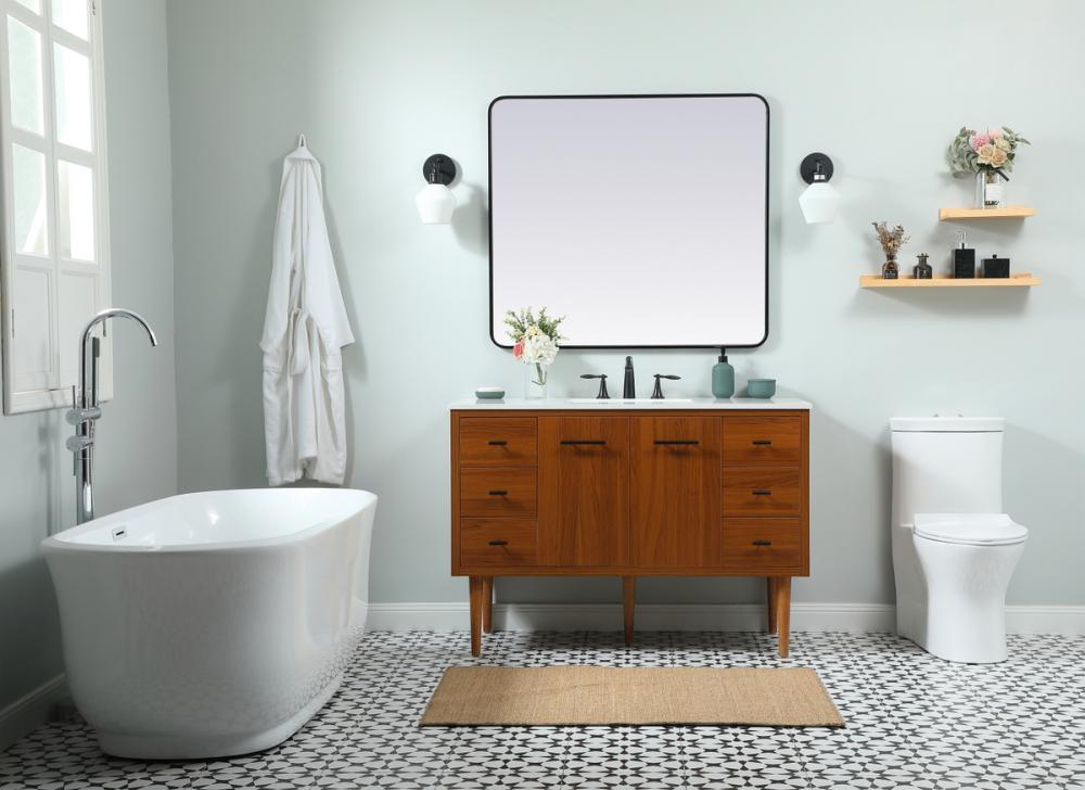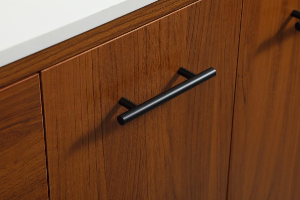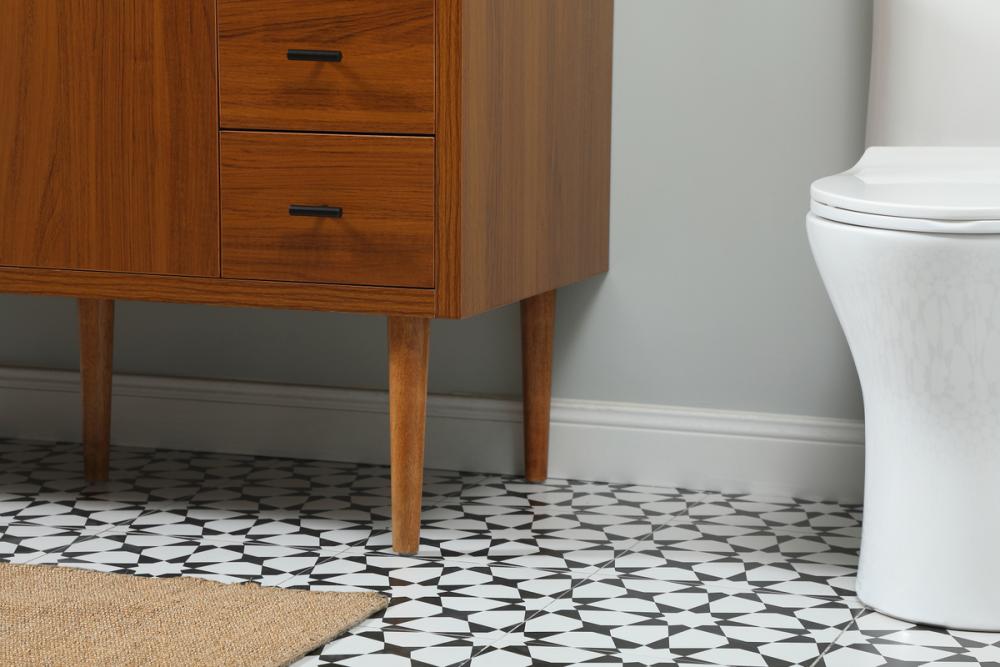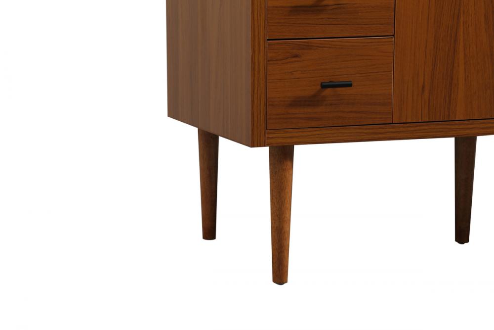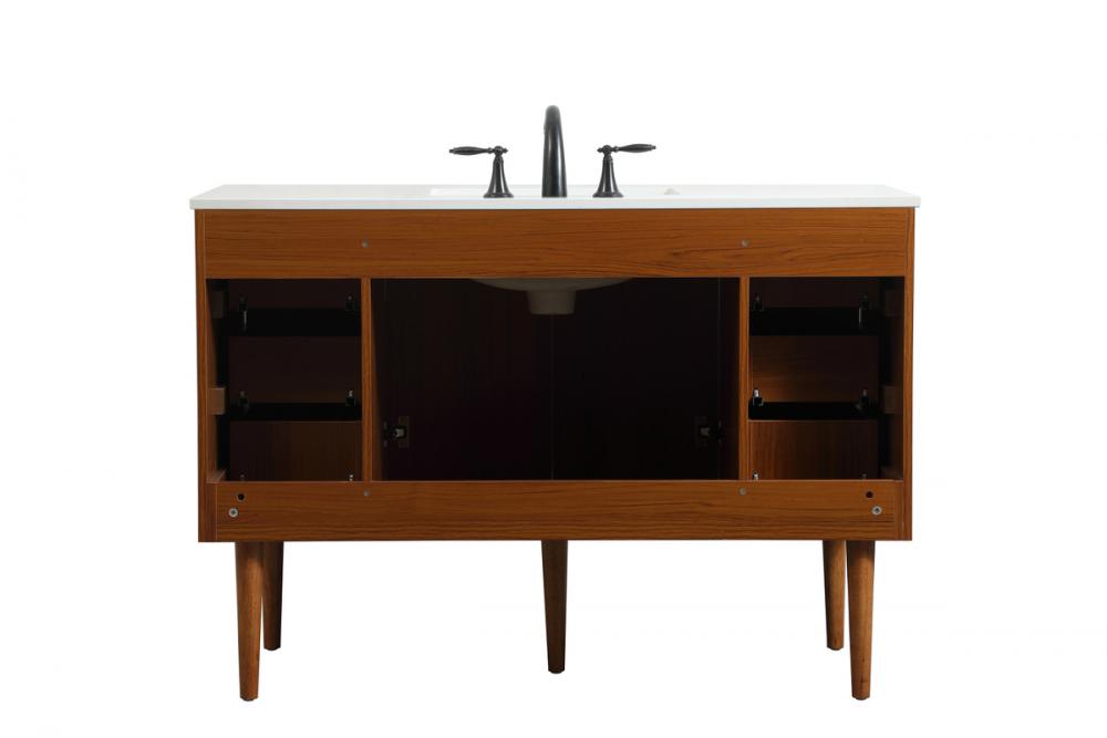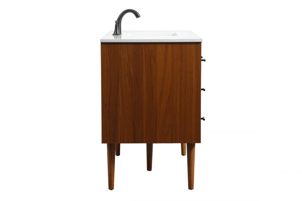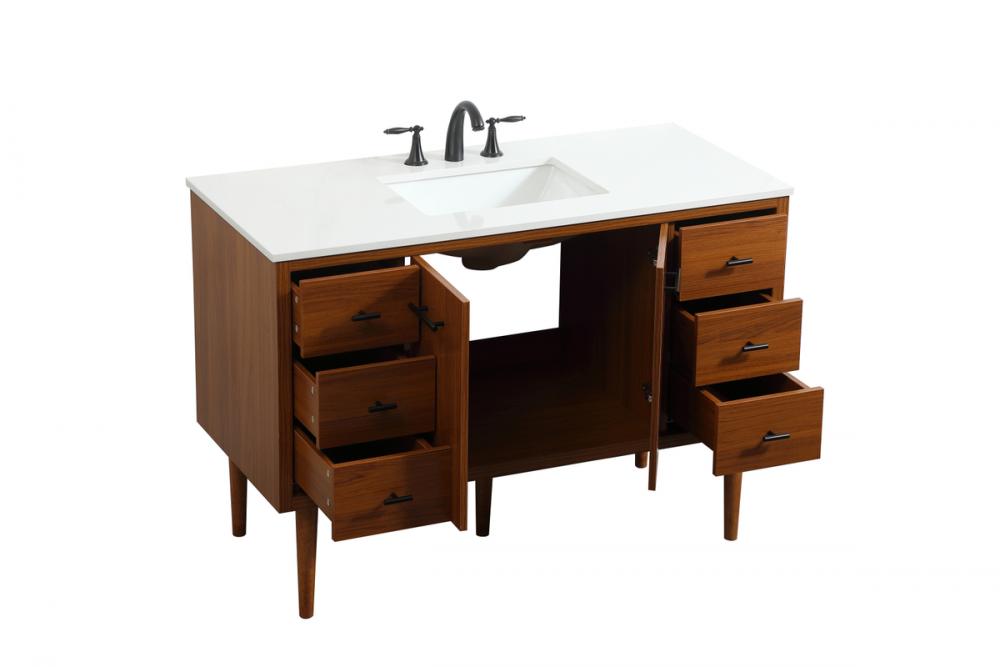 Delve into a world of minimalistic fashion and contemporary styling with this midcentury modern vanity. The clean lines anchors the design, while the straight tapered cylinder legs add subtle interest. Bar pull handle adorns the soft closing door hiding the base of the rectangular porcelain sink and letting you store your bathroom necessities and toiletries. Six soft closing drawers add plenty of storage option. Whether you want to use this as a floating vanity or a freestanding vanity, the choice is yours. The durable ivory white engineered marble countertop complements the manufactured wood base vanity and is built to last.