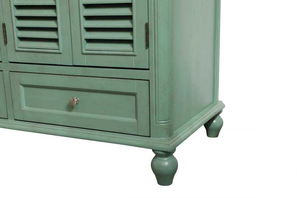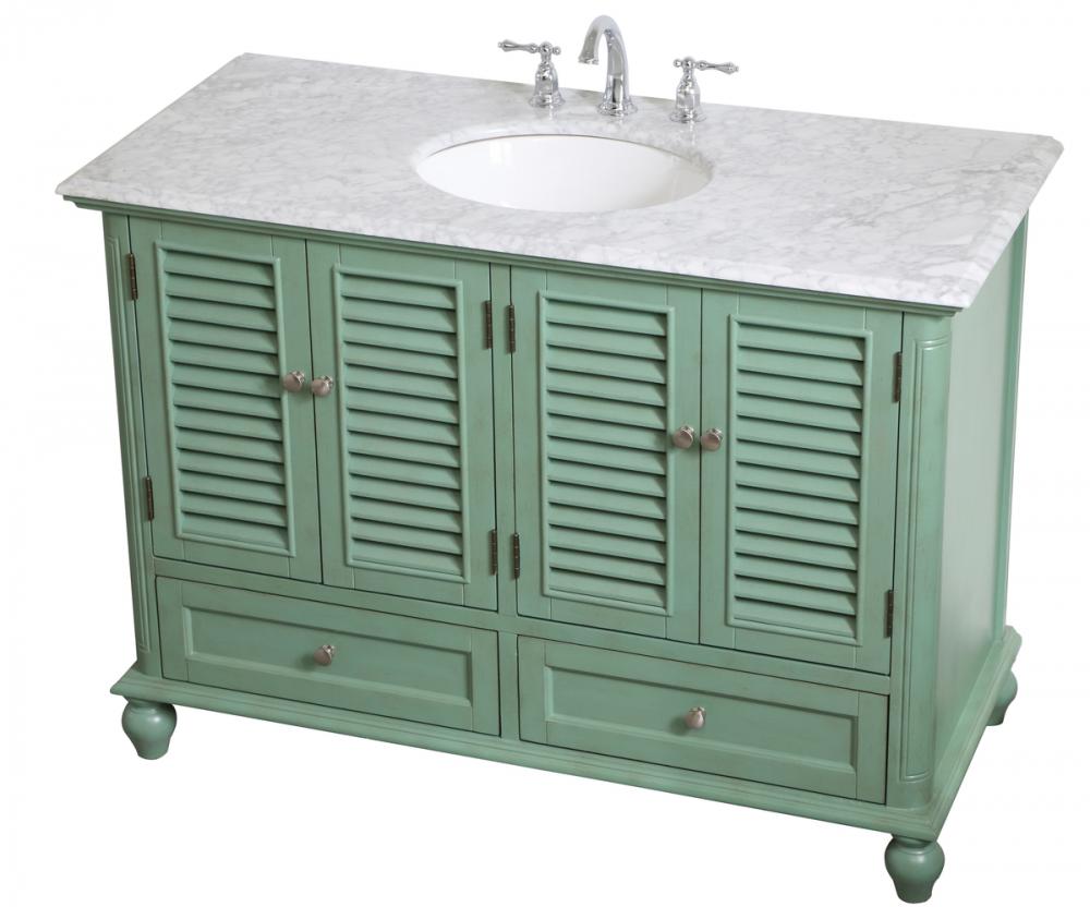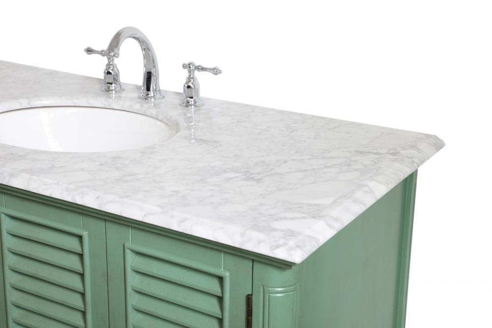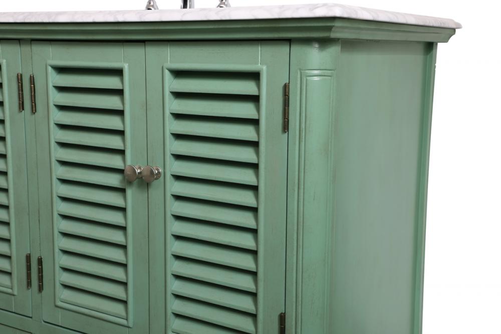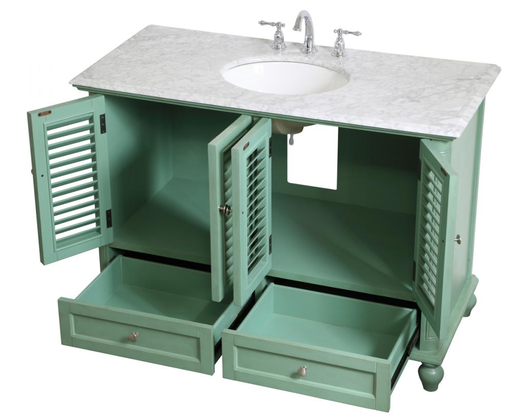 Never compromise beauty--the Rhodes collection stunning vanity in a vintage mint finish will add a lovely splash of color and complement any bathroom or powder room, while utilizing its charm and function to provide you with ample storage spaces. Brushed nickel knobs gently adorn the four shuttered cabinet doors and two long drawers at the base, allowing for you to store away your bathroom essentials. The Carrara white marble countertop, porcelain undermount sink, dignified subtle engravings on the side edges, and rounded legs all come together to create contemporary beauty. Work with your space, and design a beautiful room, no matter the size.