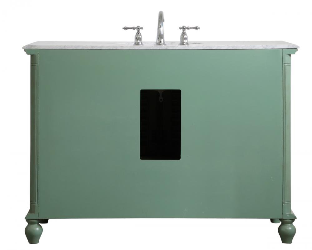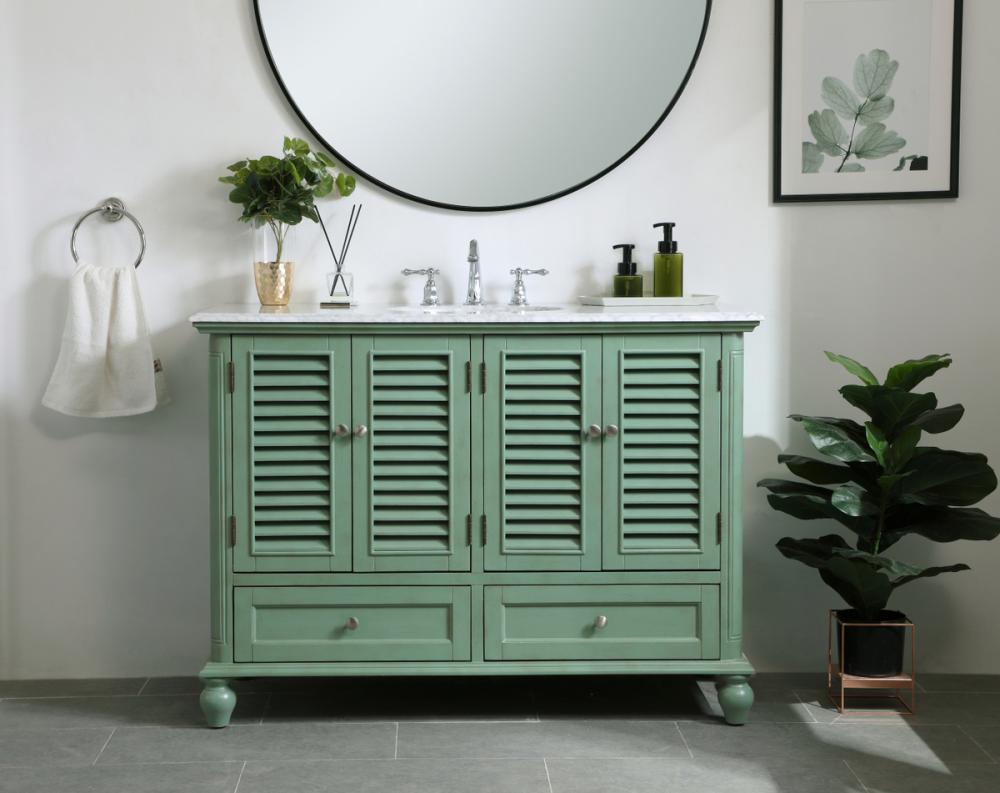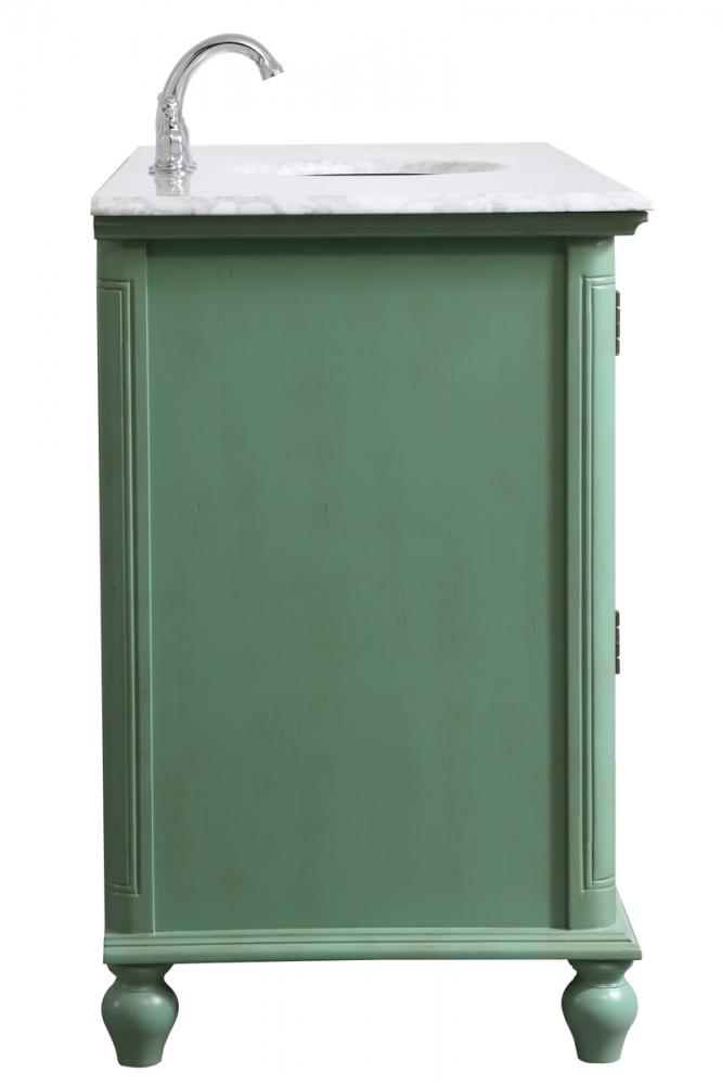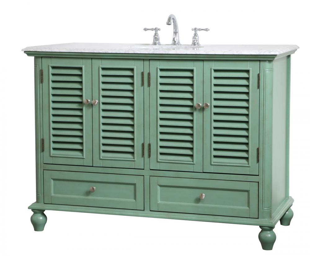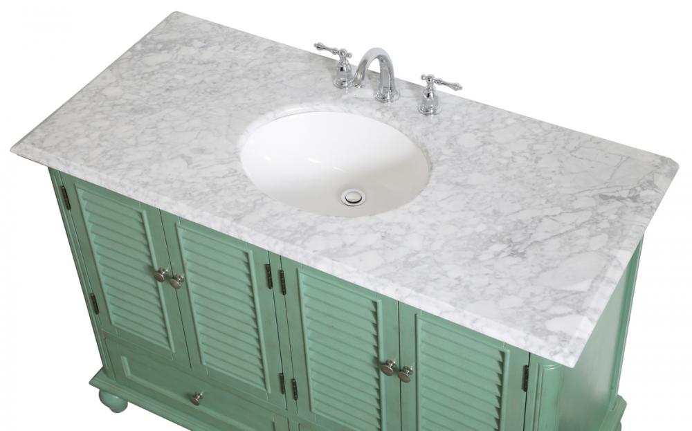 Never compromise beauty--the Rhodes collection stunning vanity in a vintage mint finish will add a lovely splash of color and complement any bathroom or powder room, while utilizing its charm and function to provide you with ample storage spaces. Brushed nickel knobs gently adorn the four shuttered cabinet doors and two long drawers at the base, allowing for you to store away your bathroom essentials. The Carrara white marble countertop, porcelain undermount sink, dignified subtle engravings on the side edges, and rounded legs all come together to create contemporary beauty. Work with your space, and design a beautiful room, no matter the size.