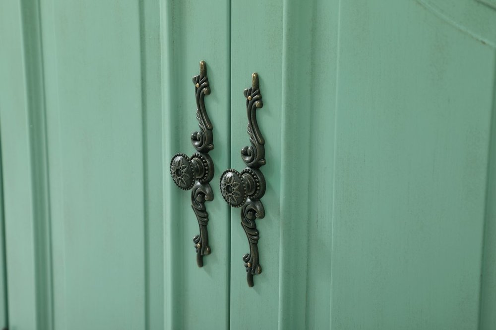Hand painted in vintage mint finish with distress paint application