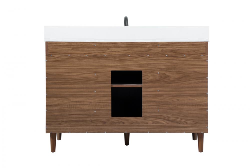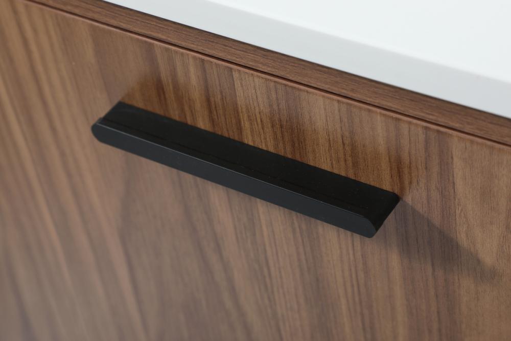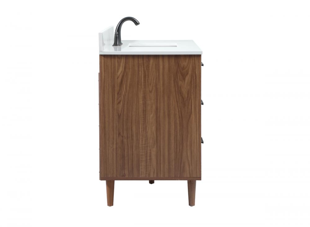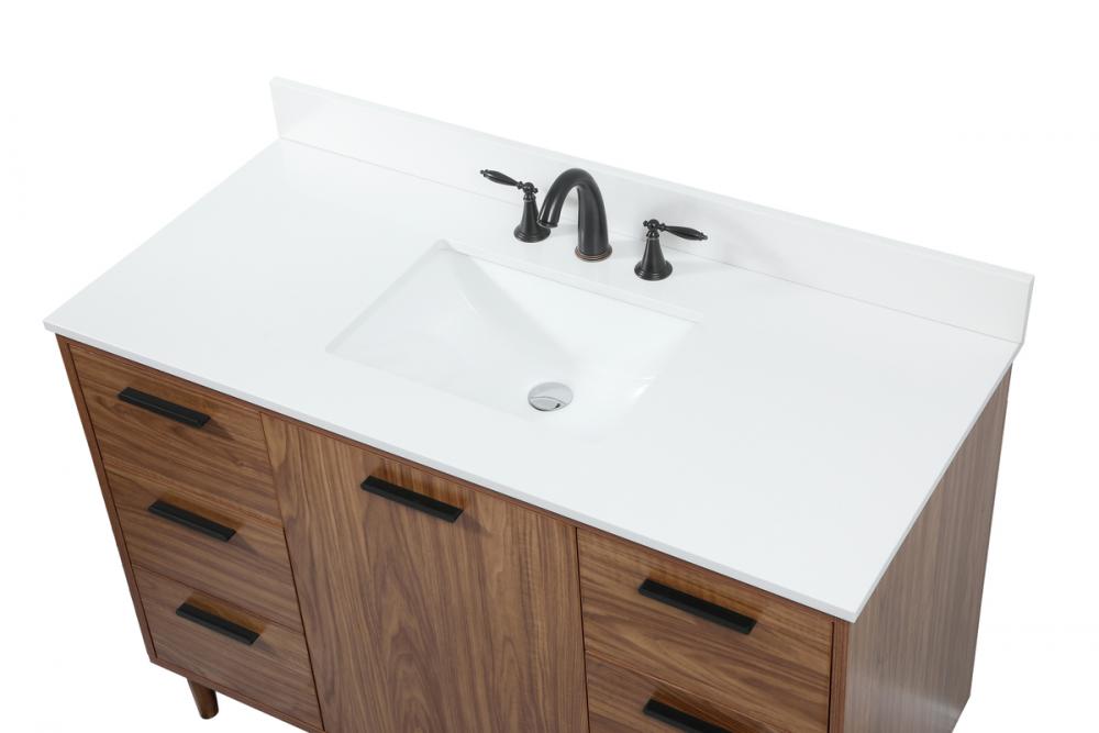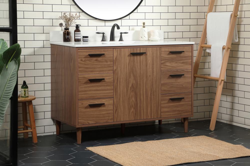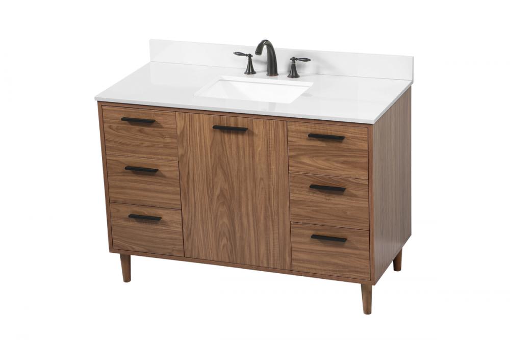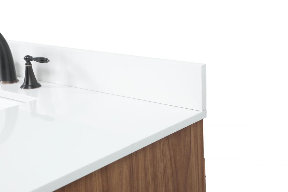 Exquisite modern sophistication is defined with the wood look and black barpulls of this vanity and slender tapered legs. Its length makes it the perfect addition to any sized home, and saves space with its storage area hidden behind the Single cabinet doors and six drawers. Topped with a highly durable engineered marble countertop and a porcelain undermount sink, this modern design will become your focal point of your bathroom or powder room. Equipped with soft-closing drawer and doors adds a quiet functional touch. Comes with a matching backsplash to complete the look and protects your wall.