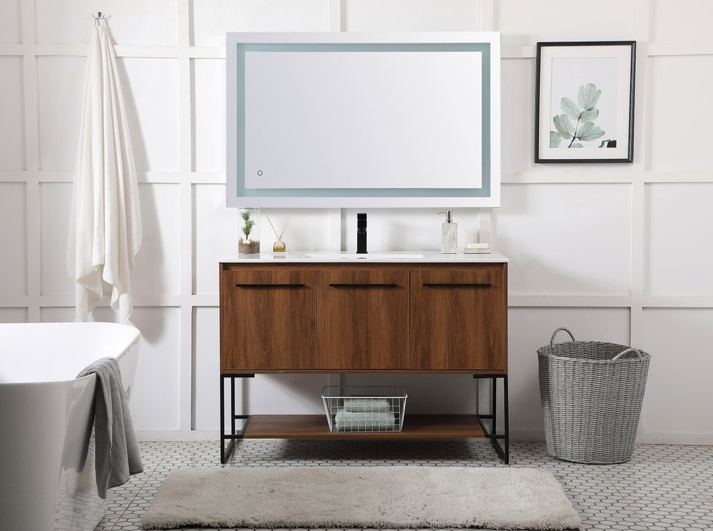 Live in modern comfort with this 48" walnut brown finish vanity. Dressed in a concrete grey and sleek black metal hardware, its contemporary style will have your bathroom or powder room elevated in industrial sophistication. The open shelf at the base and 3 doors reveal ample storage space for your bathroom essentials and miscellany. Clean lines create its own visual interest, adding trendy looks to your already chic room.